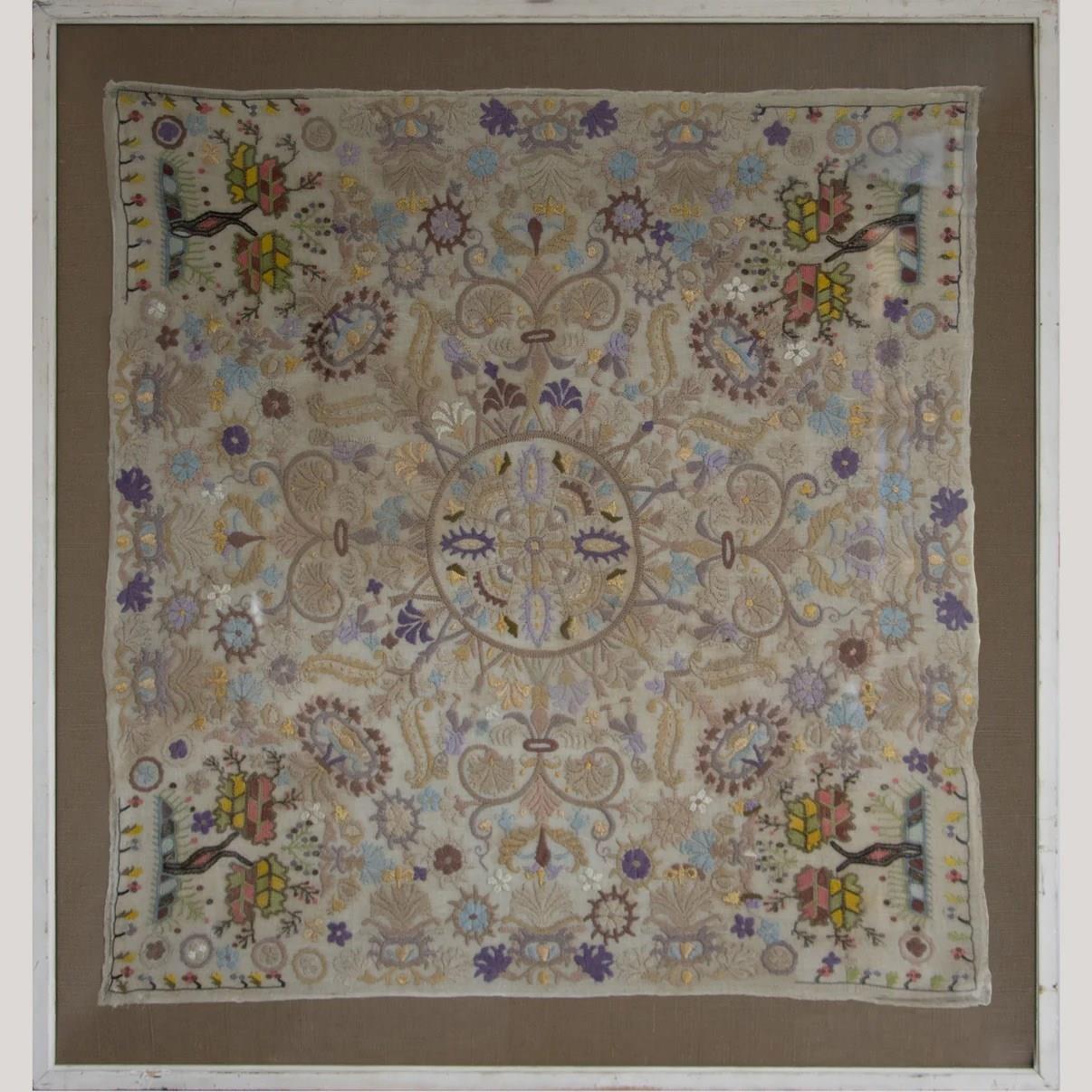 Likely crafted by a skilled artisan or workshop specializing in decorative embroidery, this sampler reflects motifs common to Southern European folk and ecclesiastical textile traditions. Its intricate symmetry and refined palette suggest a ceremonial or domestic origin rather than utilitarian use.