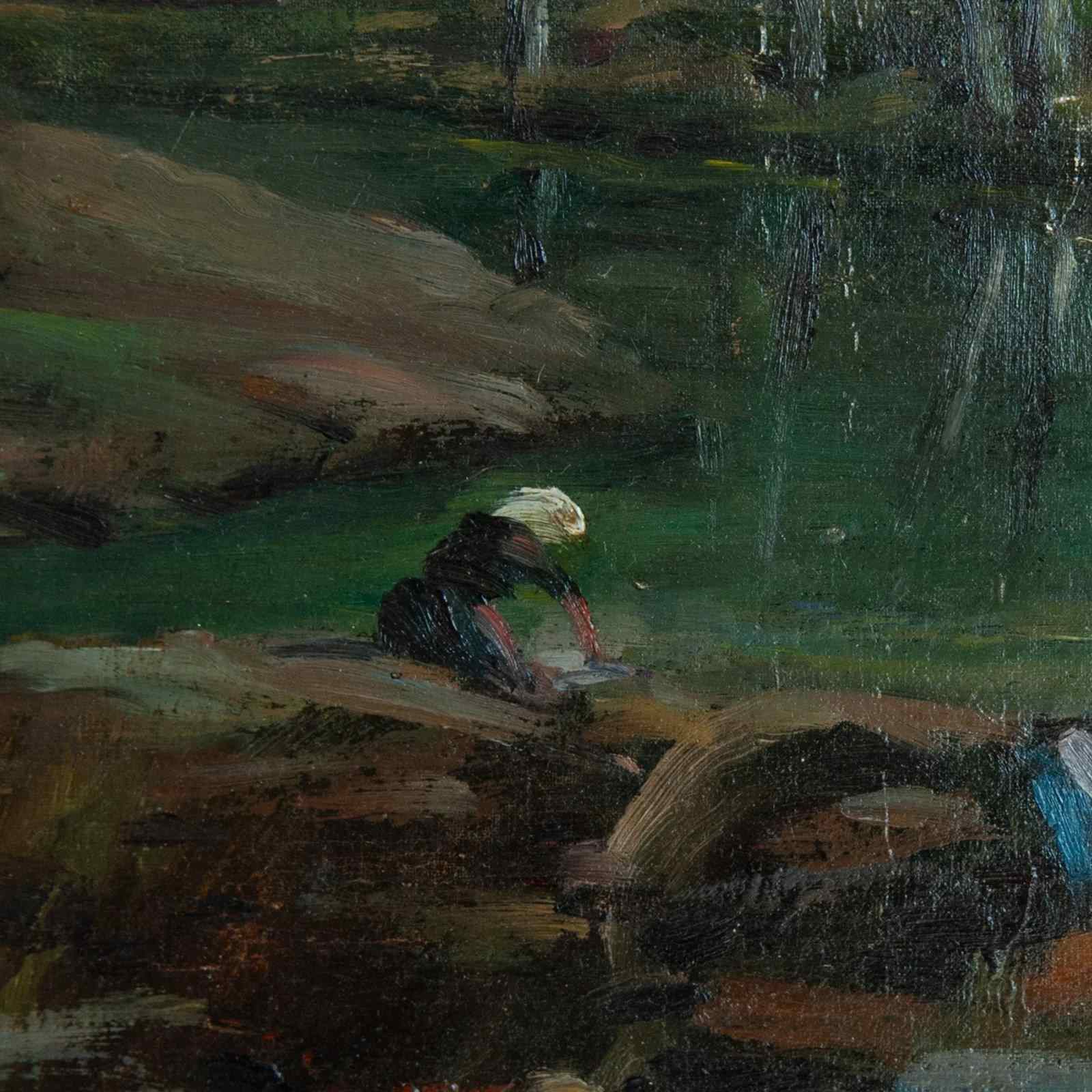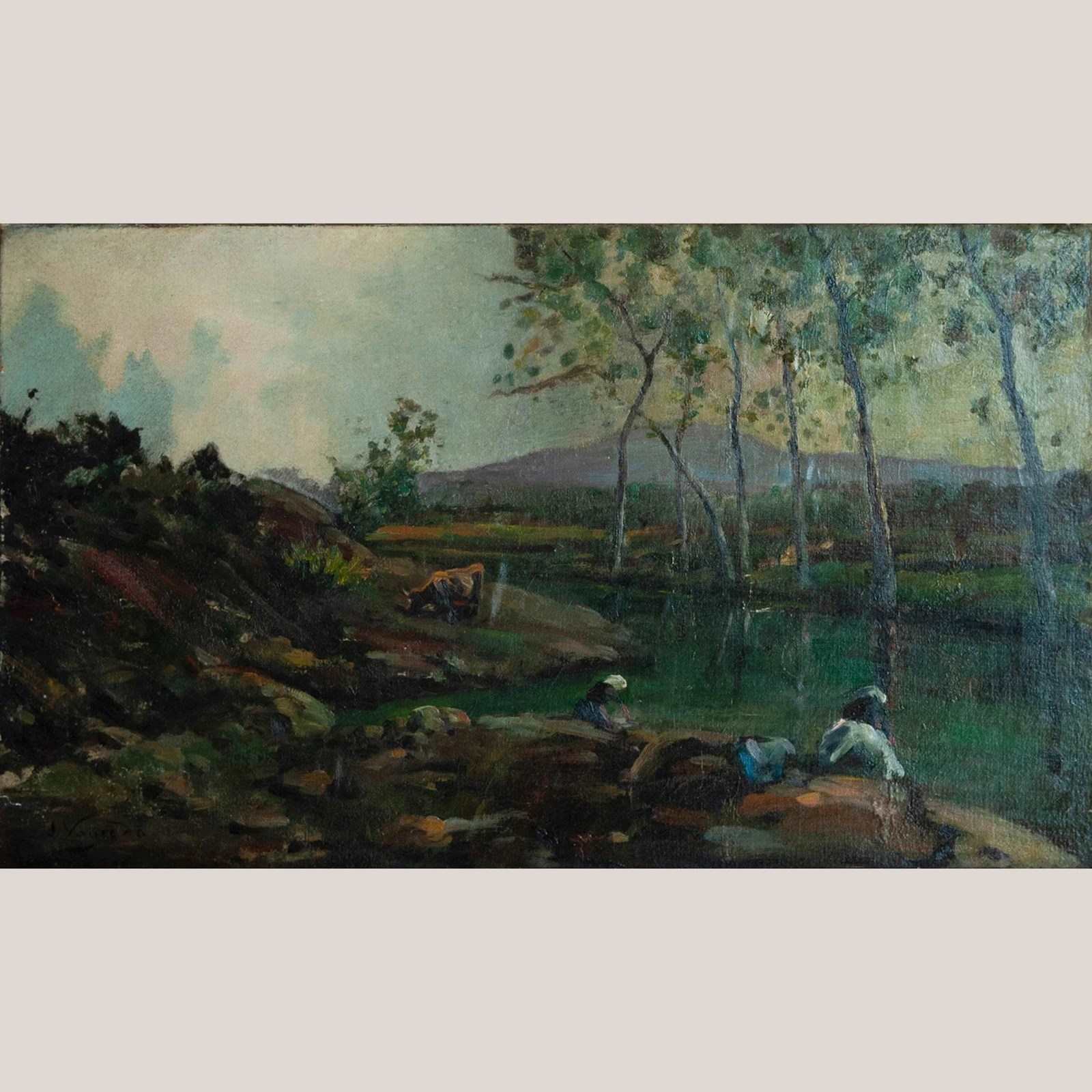 DescriptionThis original oil on canvas by Joaquim Vayreda y Vila (1843–1894) captures a serene pastoral scene along a calm riverbank, where women wash clothes beneath slender trees shimmering with late-afternoon light. The artist’s delicate interplay of light and shadow, combined with his characteristically harmonious palette of greens, browns, and soft sky tones, evokes the quiet dignity of rural life. Vayreda’s painterly yet precise brushwork reveals his deep sensitivity to atmosphere and nature, hallmarks of the Olot School that he co-founded. The composition’s depth and balance reflect his plein-air mastery and his pursuit of lyrical realism within the Catalan landscape tradition. This work exemplifies Vayreda’s enduring ability to fuse technical finesse with poetic observation, conveying both the intimacy of daily labour and the grandeur of nature’s stillness. ArtistJoaquim Vayreda y Vila (1843–1894) was a pioneering Catalan landscape painter and co-founder of the Olot School. Artist DetailsBorn in Olot, Girona, Vayreda studied in Barcelona and was instrumental in shaping 19th-century Catalan naturalism. His landscapes, often depicting rural labourers and serene countryside vistas, reflect both academic training and plein-air spontaneity. A central figure of the Olot School, he influenced generations of painters devoted to light, balance, and harmony in nature. MovementsRealism / Catalan Naturalism Artist Influenced byInfluenced by Jean-Baptiste-Camille Corot and the Barbizon School. NO SURPRISE SHIPPING COSTS - UK & EU: Free Shipping - price includes packing, shipping & import VAT. USA & Canada: £220 Special offer packing and shipping price to your door. NOTE: Any import duty is not included. All other destinations: packing & shipping calculated at checkout. FOR PURCHASE & BETTER VIEWING:CLICK ON View Seller Website button BELOW.