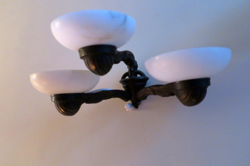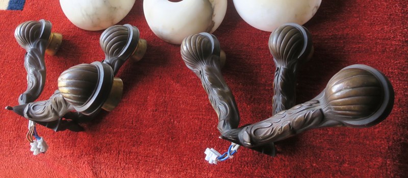 Antique pair of 3-light wall lamps in bronze with alabaster shades dating from about 1910.