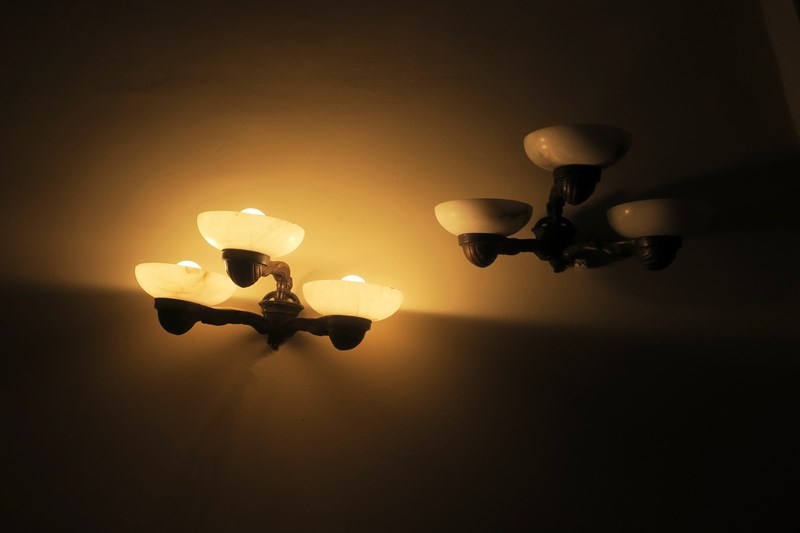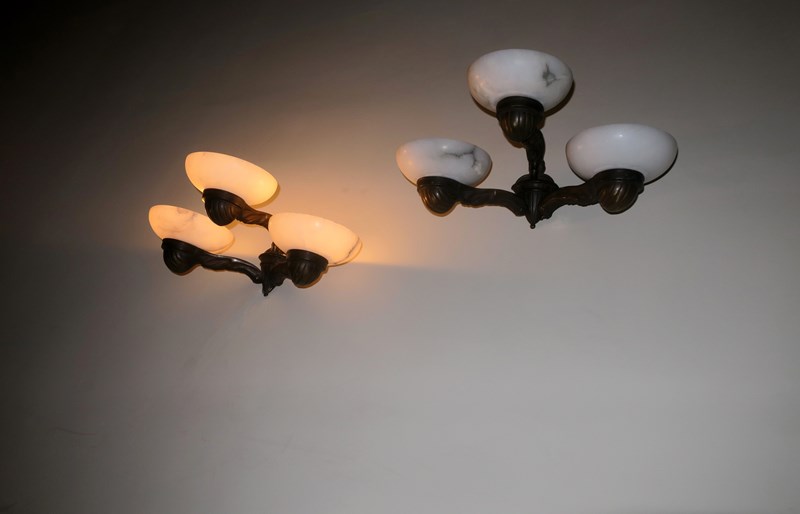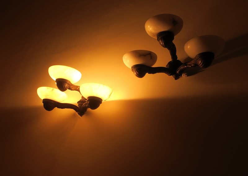 Antique Pair Of Alabaster And Bronze 3-Arm Wall Lamps