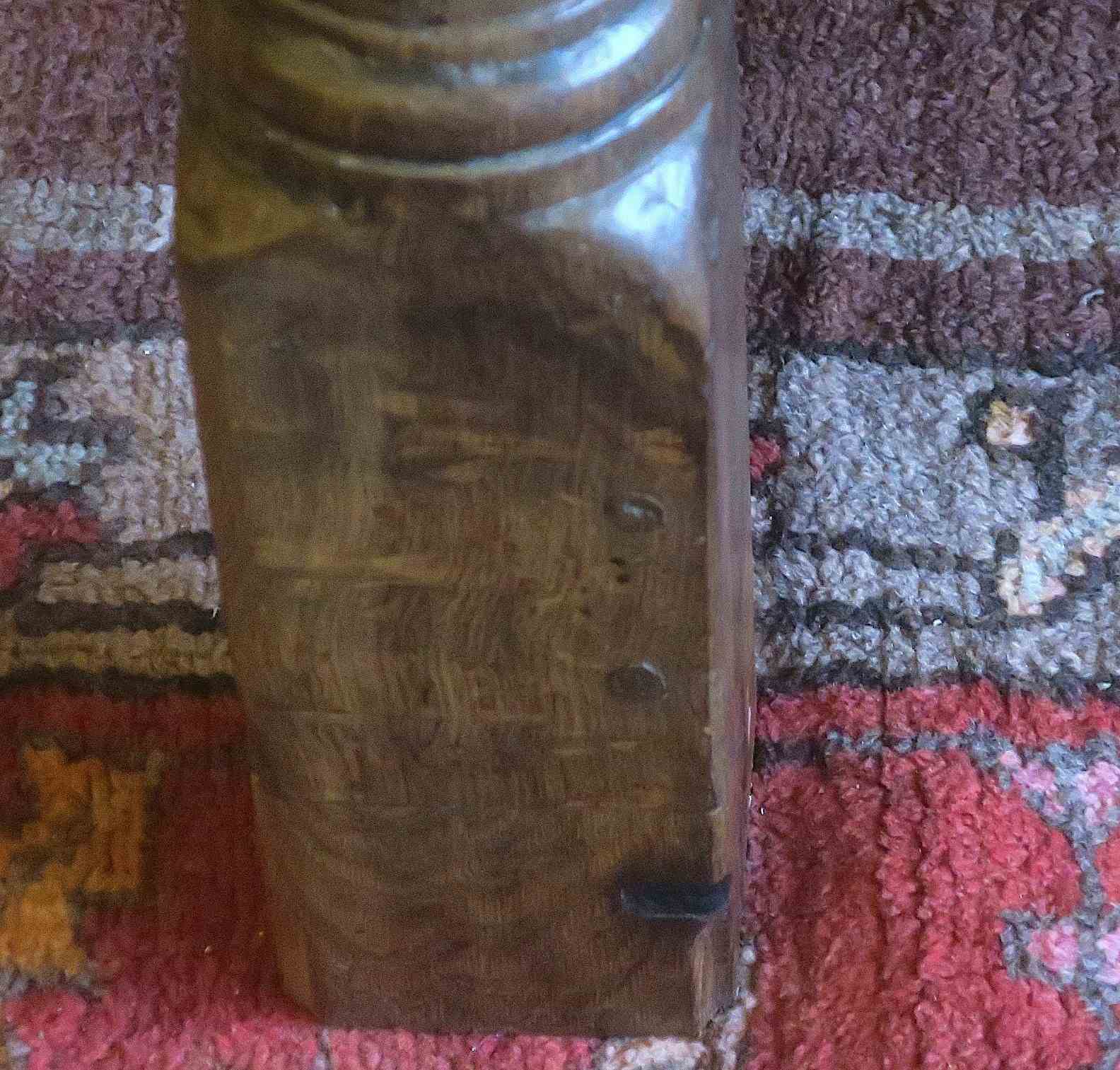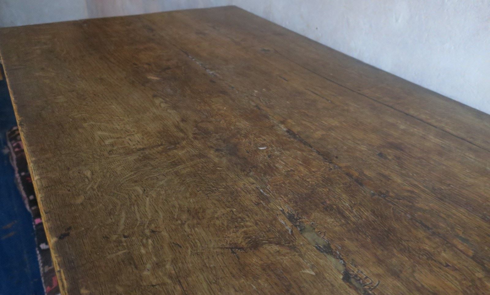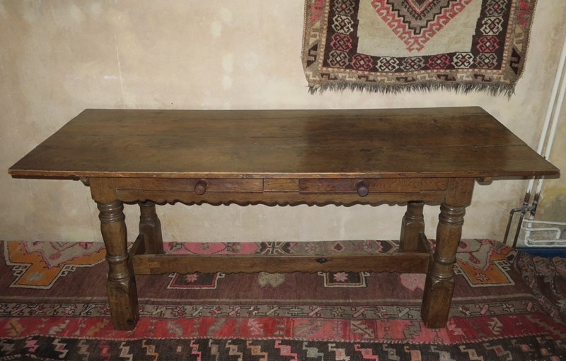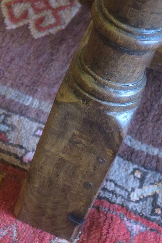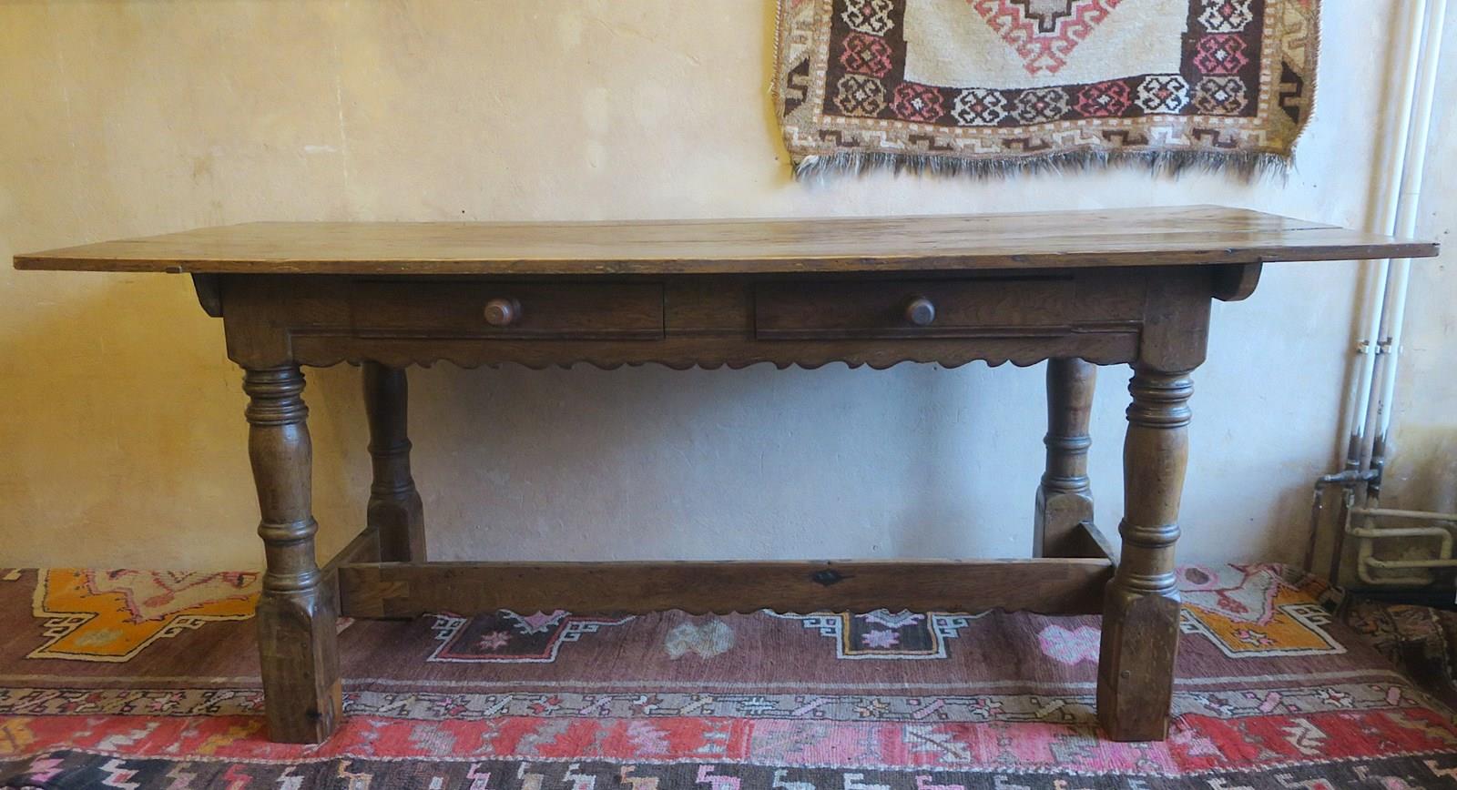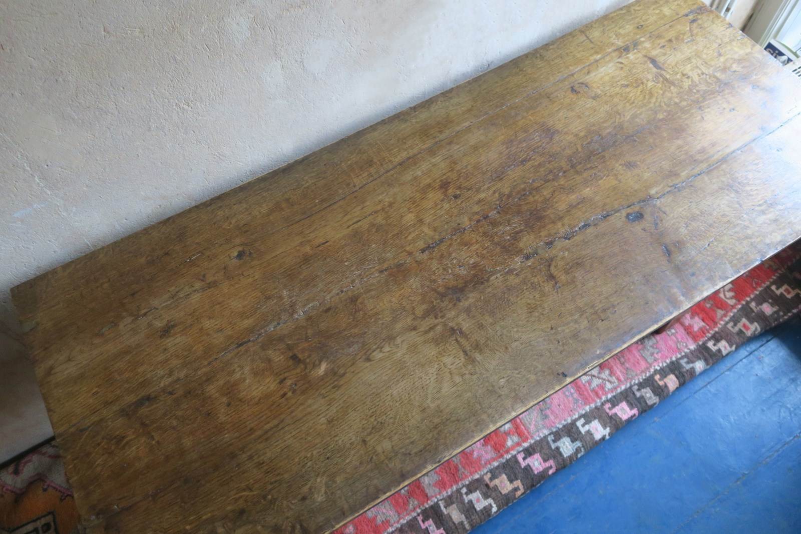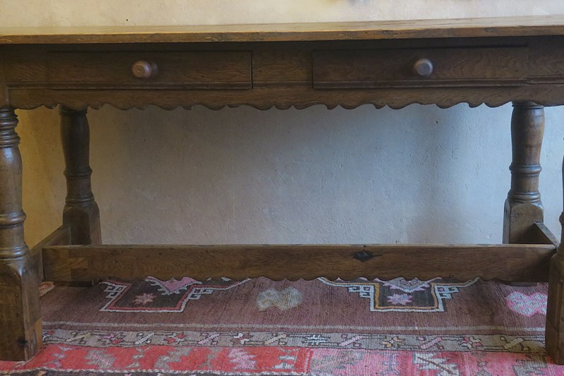 Two drawers made from the original frieze were added at some time in the nineteenth century. The height has been raised too. The original long stretchers on the outside of the table were removed to create legroom and one of them has been added to the middle to retain stability.