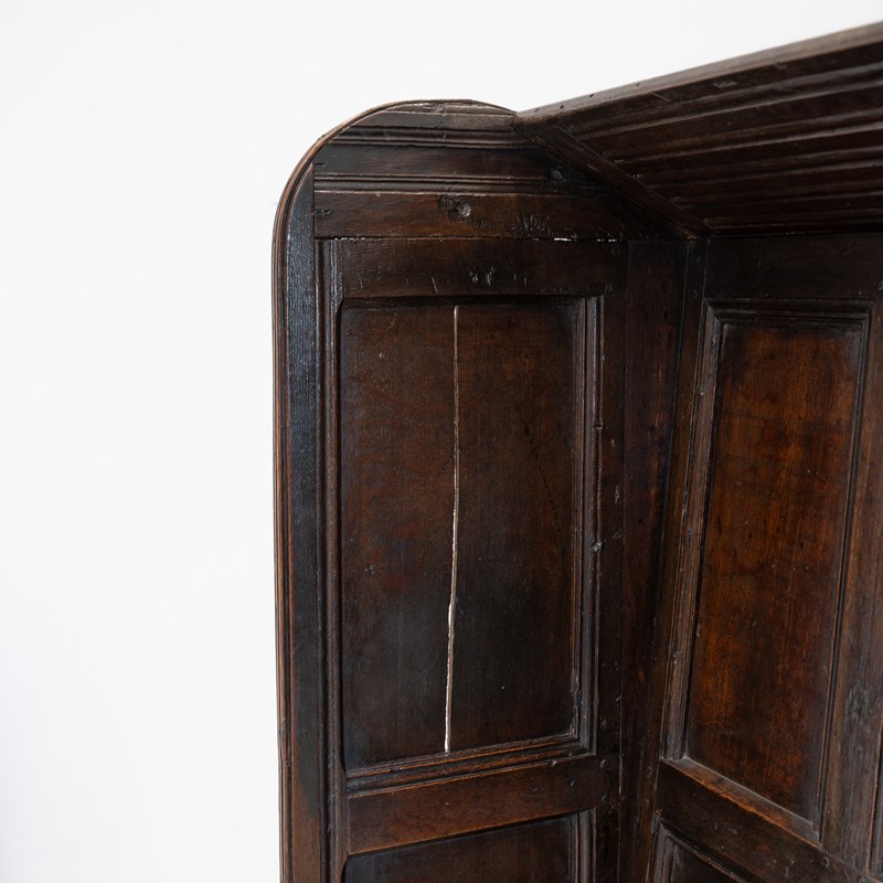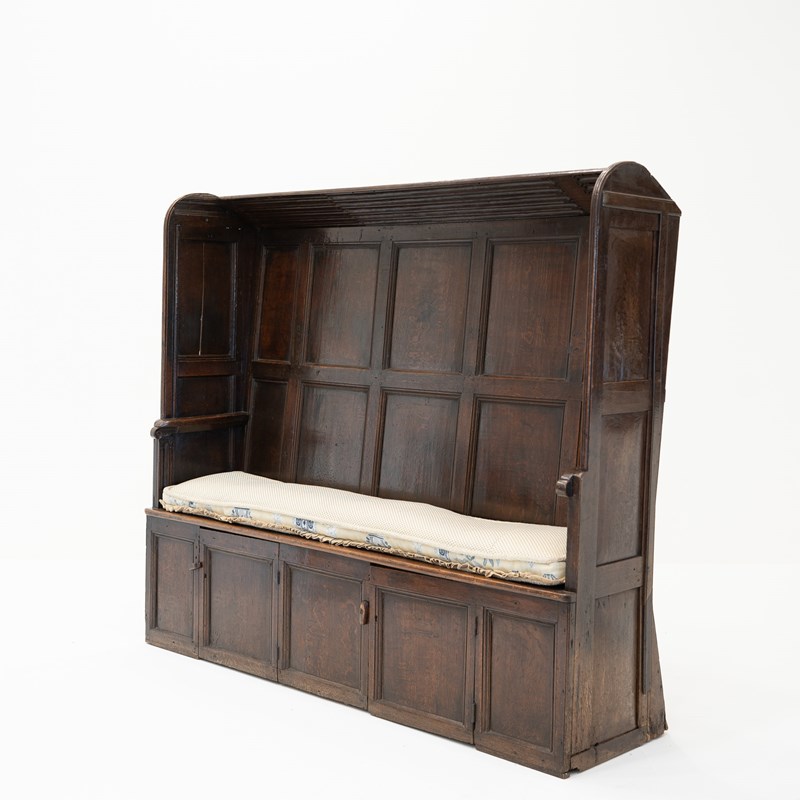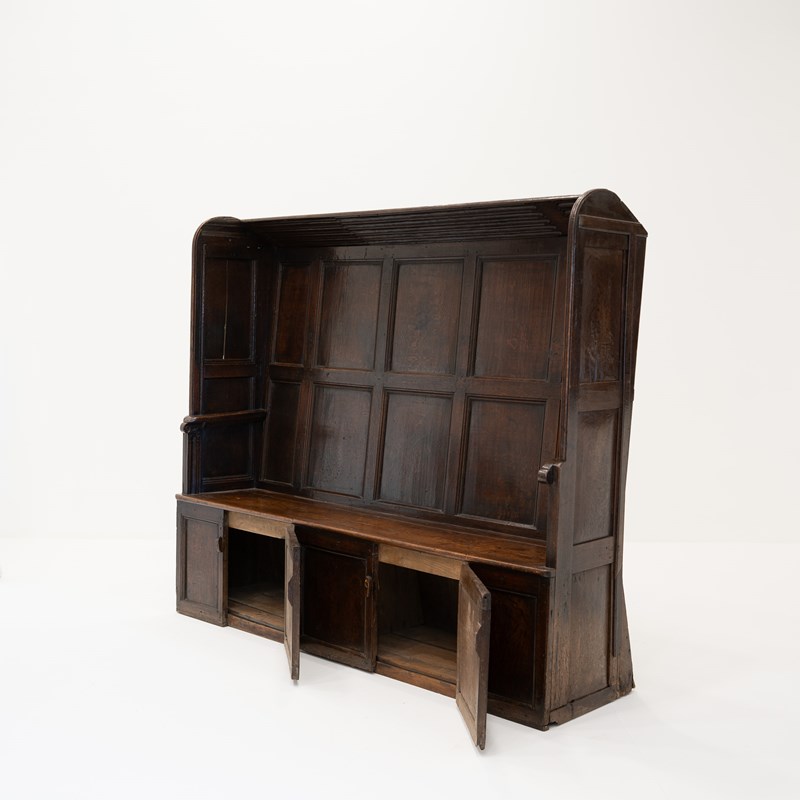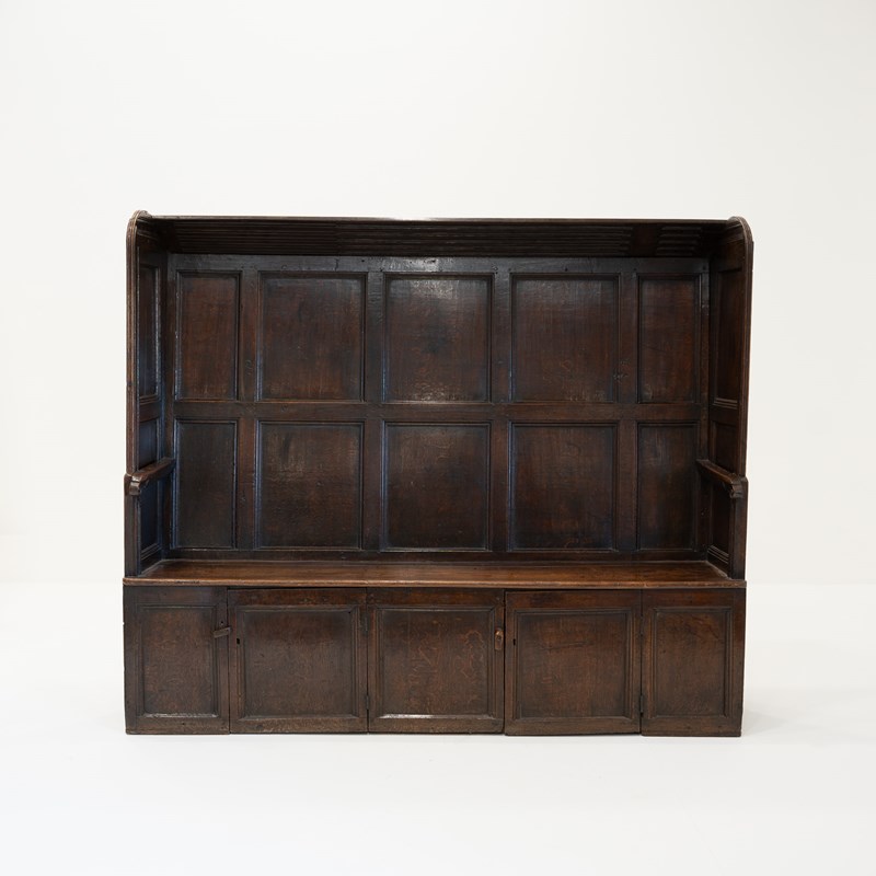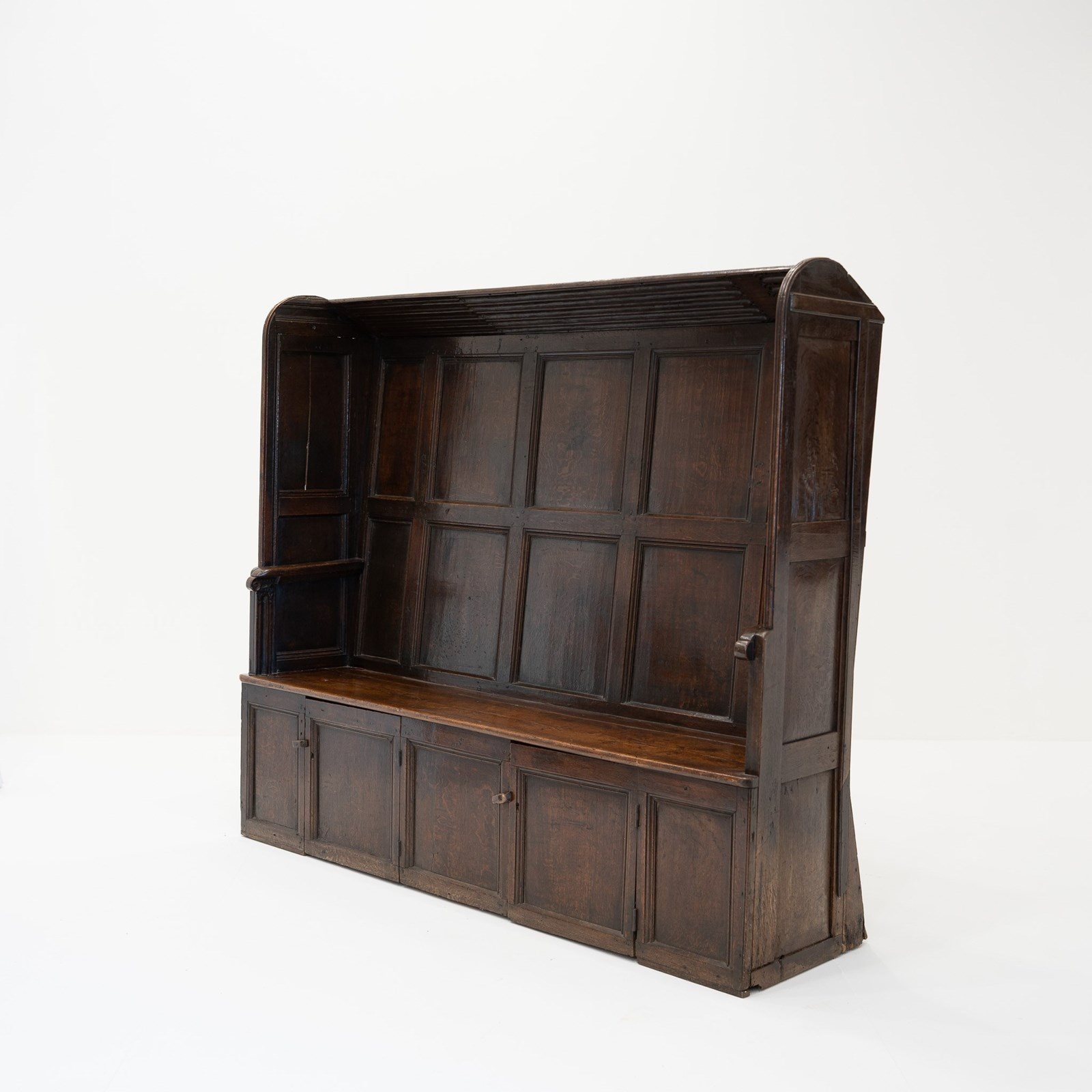 A wonderful 18th-century oak high back hooded settle, exhibiting craftsmanship and rich character throughout. This imposing piece features a part fluted hood above a deeply panelled back and sides, designed to offer shelter from draughts and create a sense of enclosed comfort — a hallmark of period settle design.