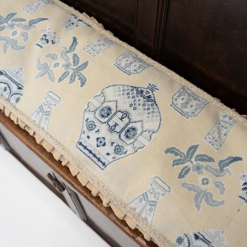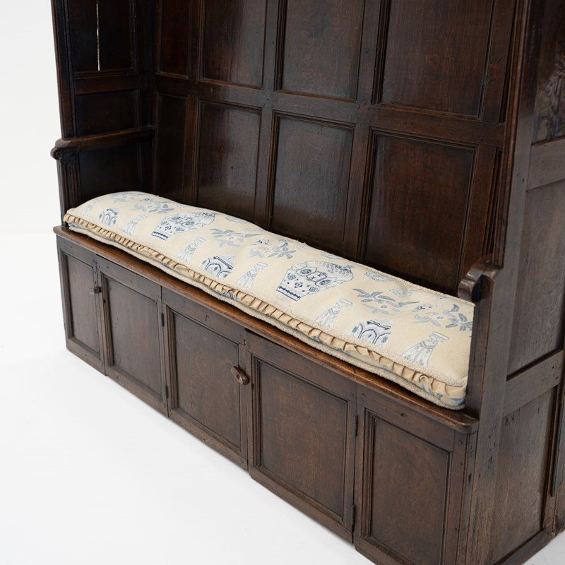 The oak displays a wonderful, timeworn patina with warm depth of colour. A removable seat cushion adds comfort, without compromising its antique integrity. The seat cushion is in used but usable condition, and could be easily recovered with a fabric of your choosing.