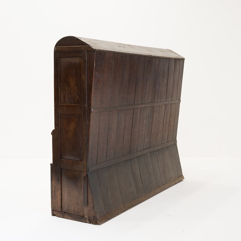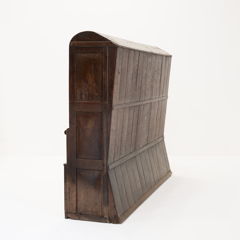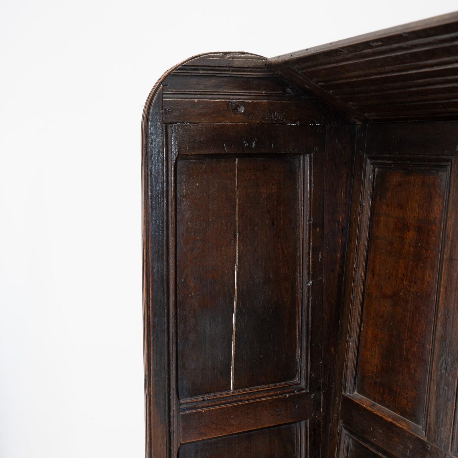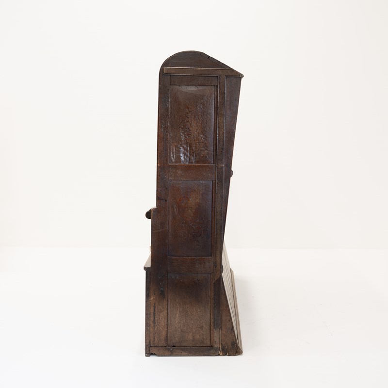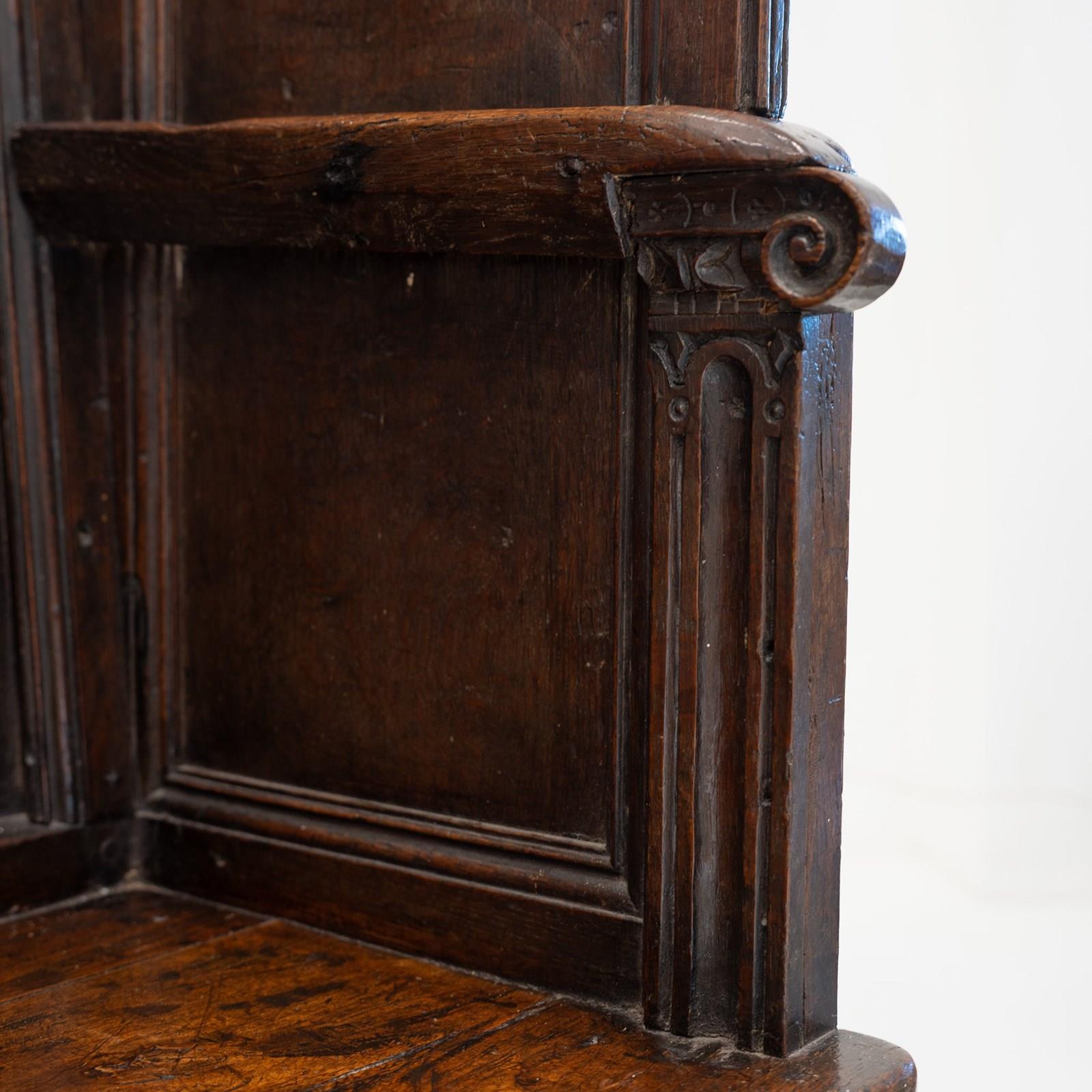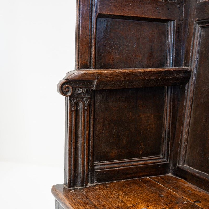 This early Georgian settle also includes some earlier 17th-century oak panel sections, probably repurposed from an Elizabethan or Jacobean panelled room. These include sections of a fluted pilaster on the hood and scrolled capitals for the arms, adding a unique depth of history and a rare decorative quality to the piece.