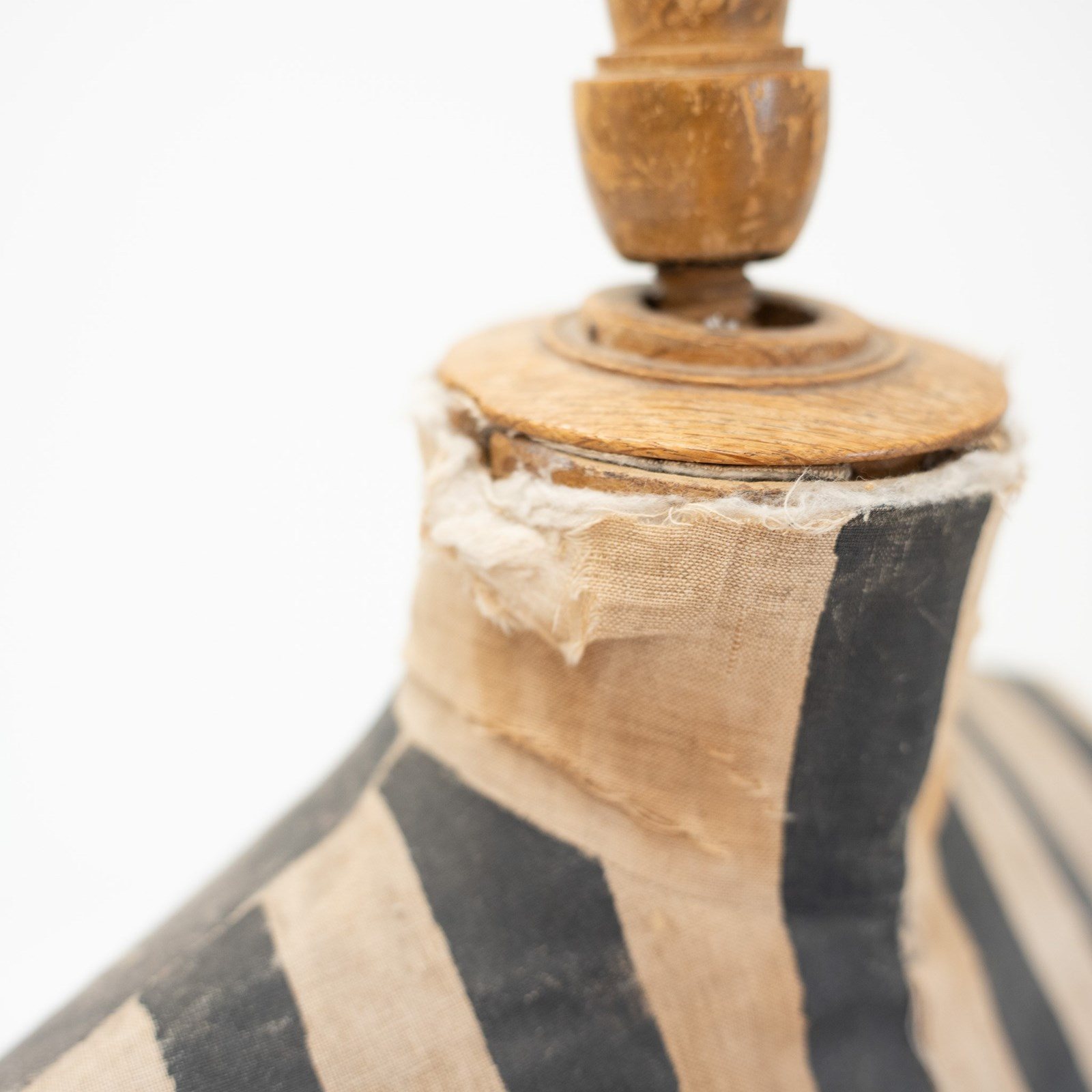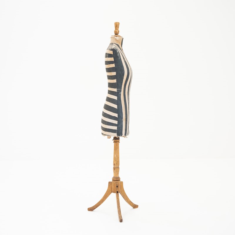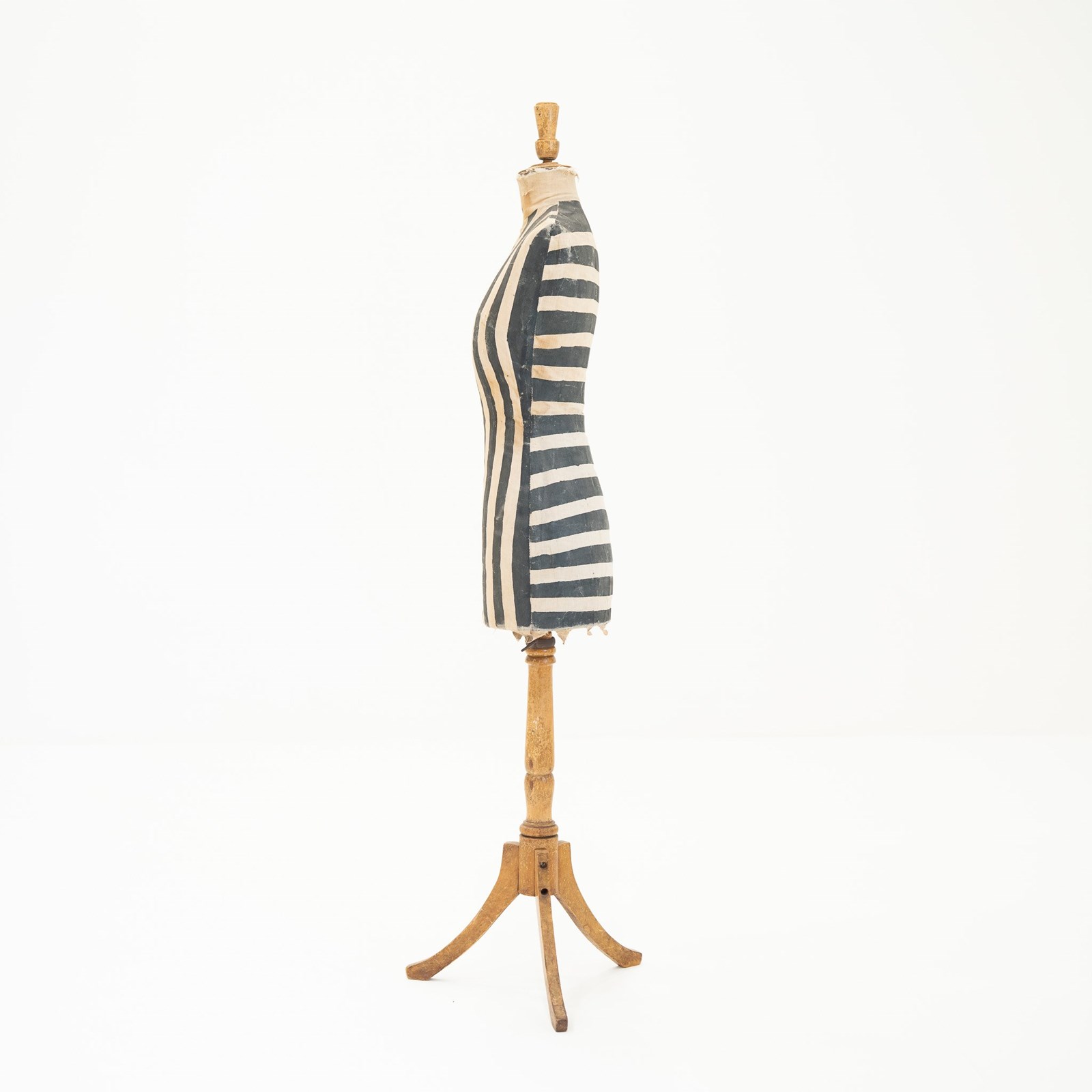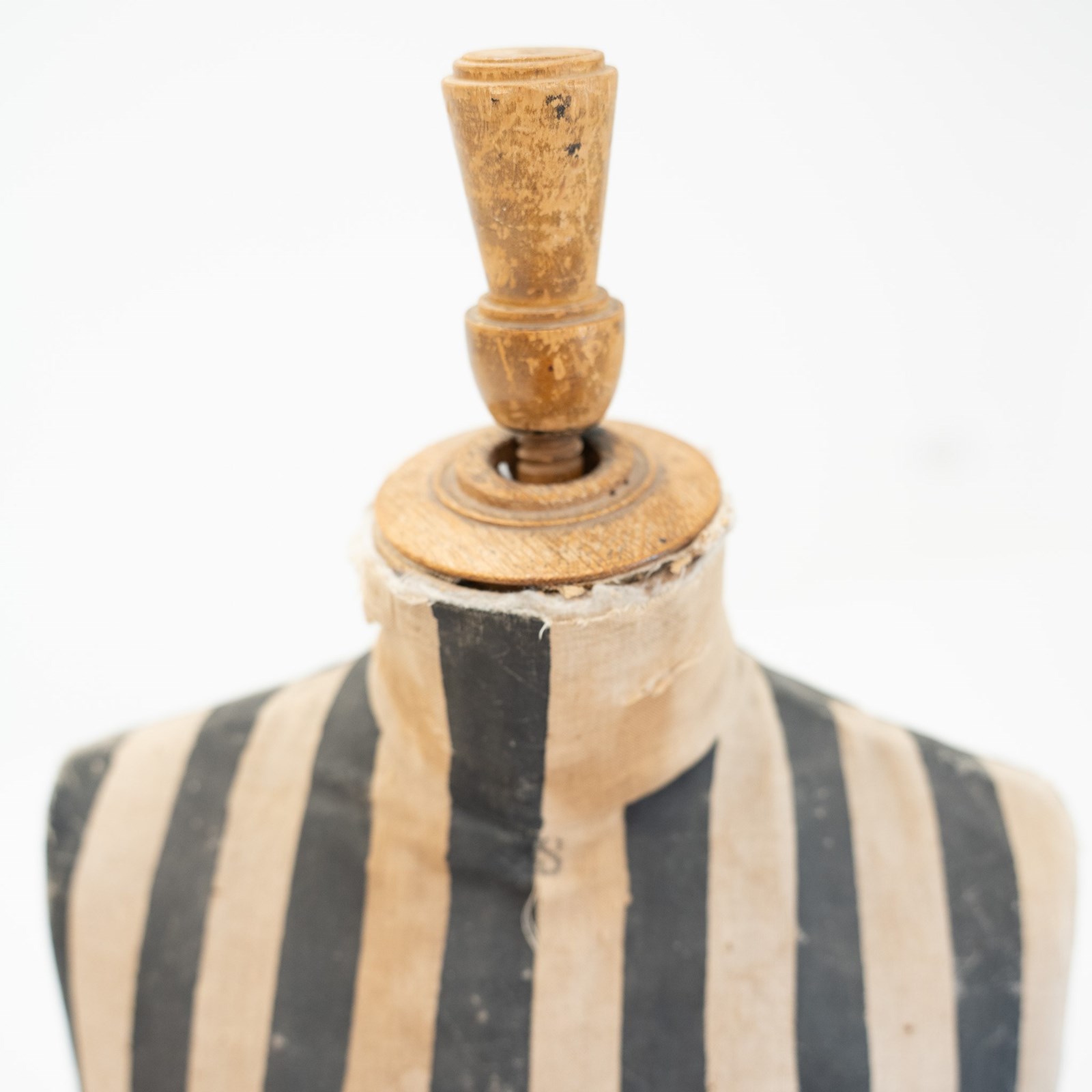 19th Century French striped mannequin with wooden base. Internally the wooden frame has detached along one side of the body, however this does not detract from the visual aesthetic of the piece. Adjustable height 159cm - 181cm (approx.)