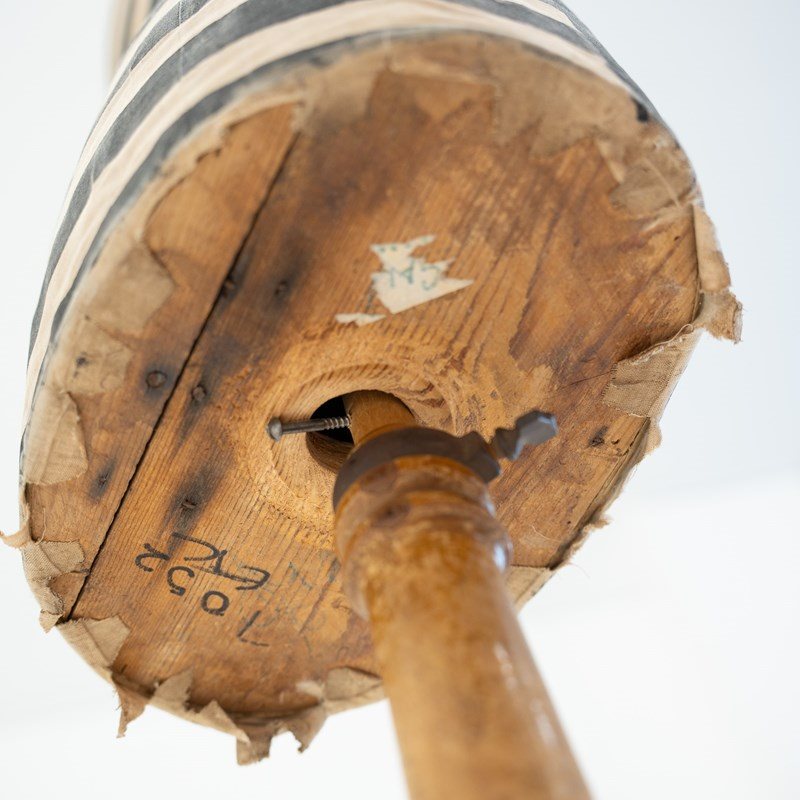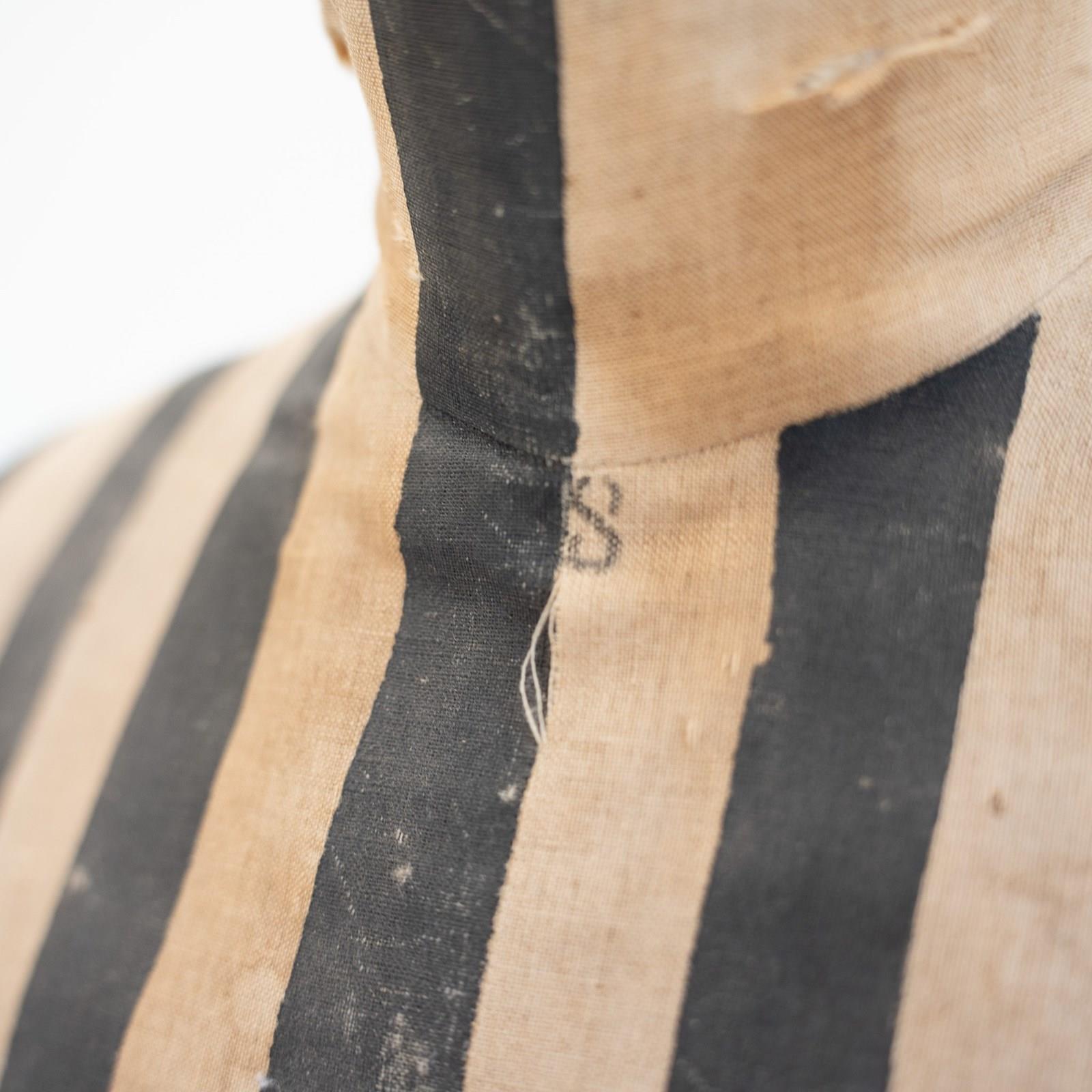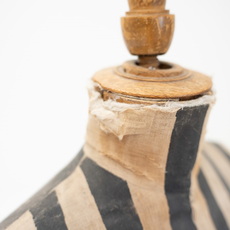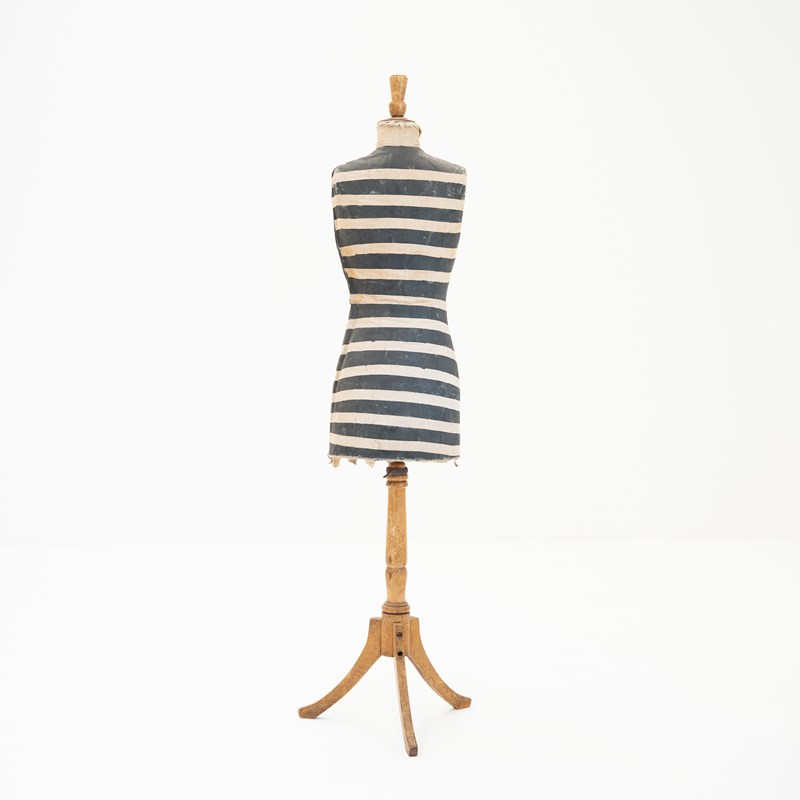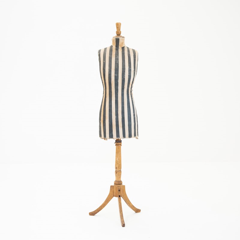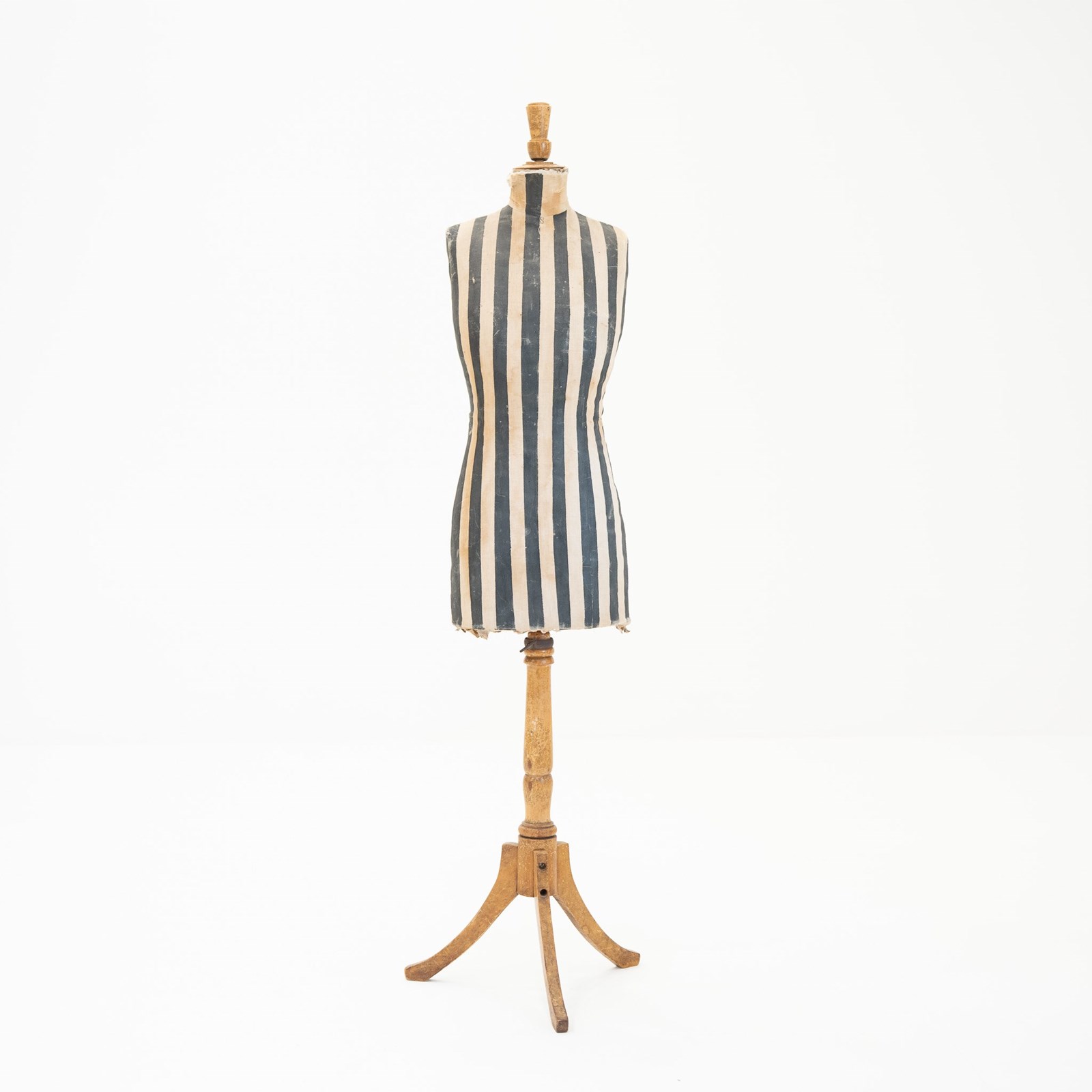 19th Century French striped mannequin with wooden base. Internally the wooden frame has detached along one side of the body, however this does not detract from the visual aesthetic of the piece. Adjustable height 159cm - 181cm (approx.)