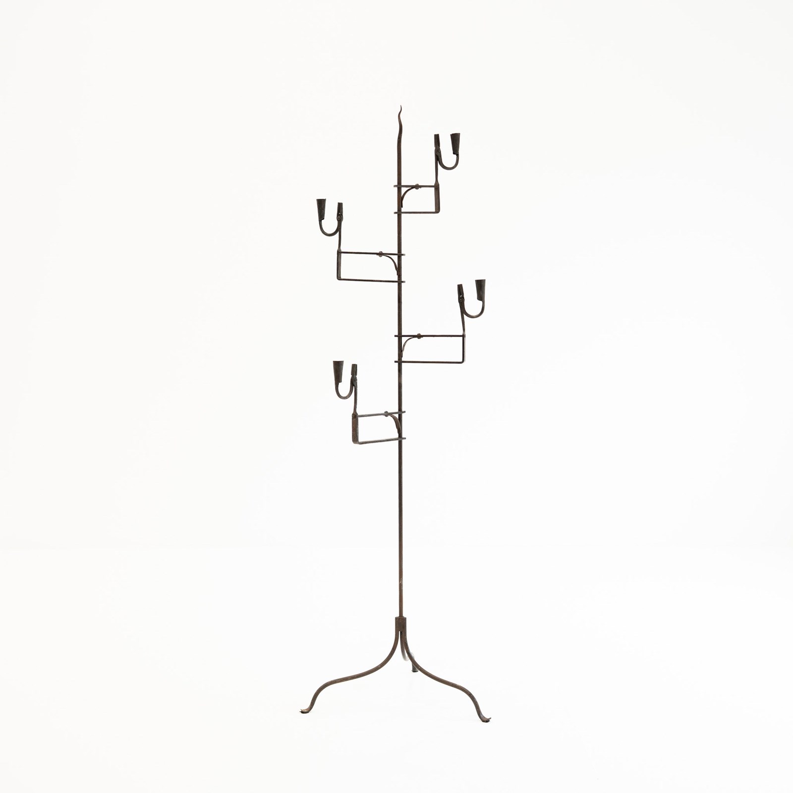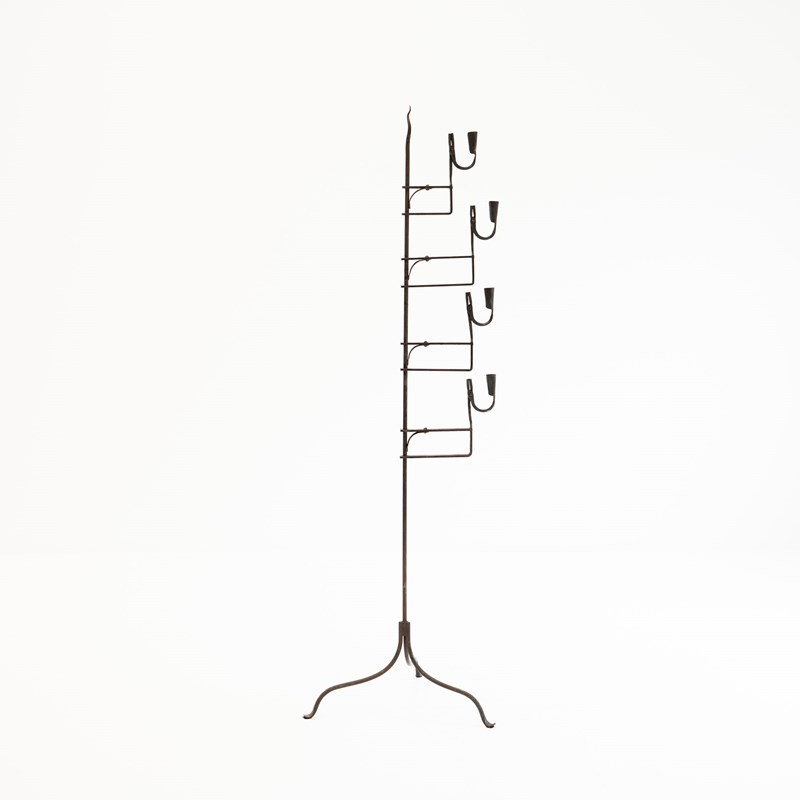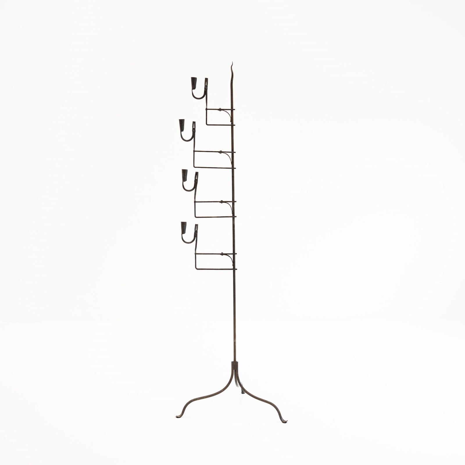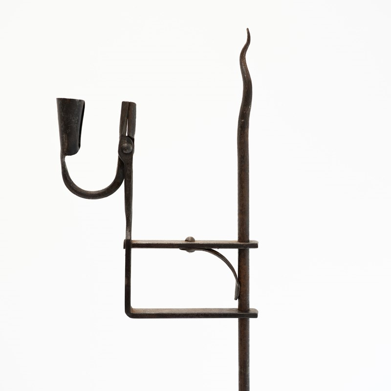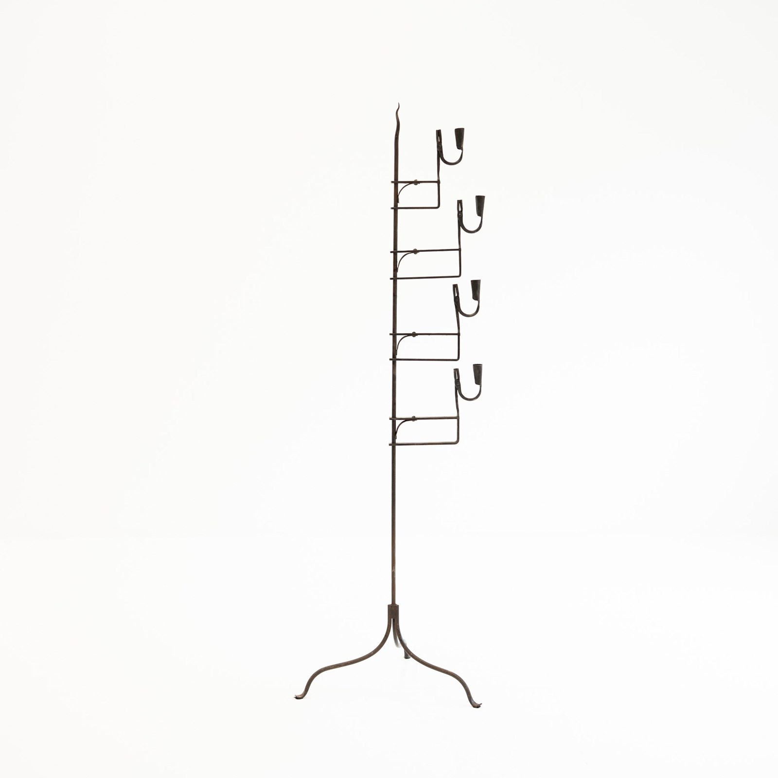 19th Century slender wrought iron adjustable candlestand. It has four moveable arms each with a sconce and rush nip.