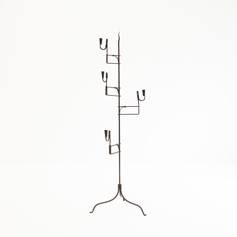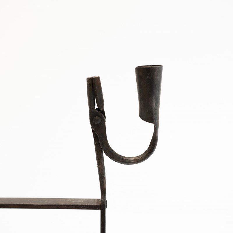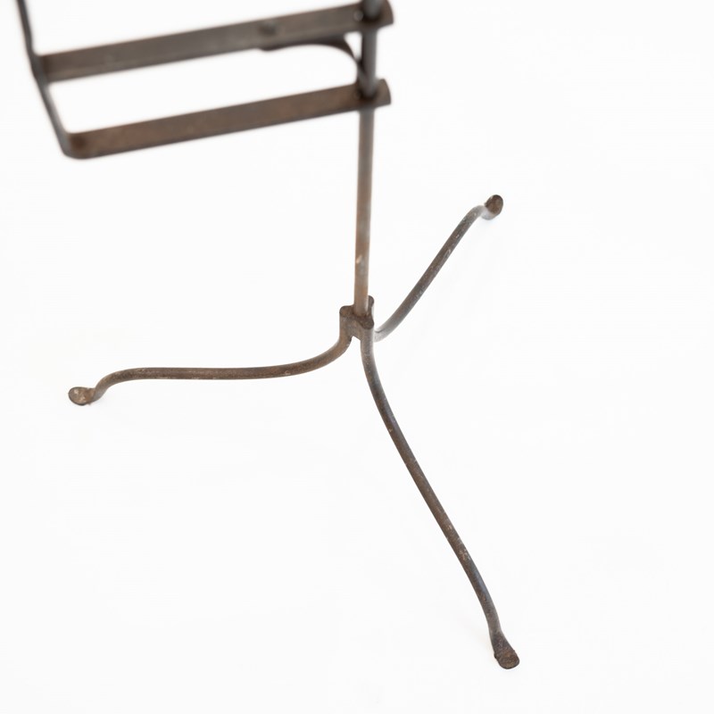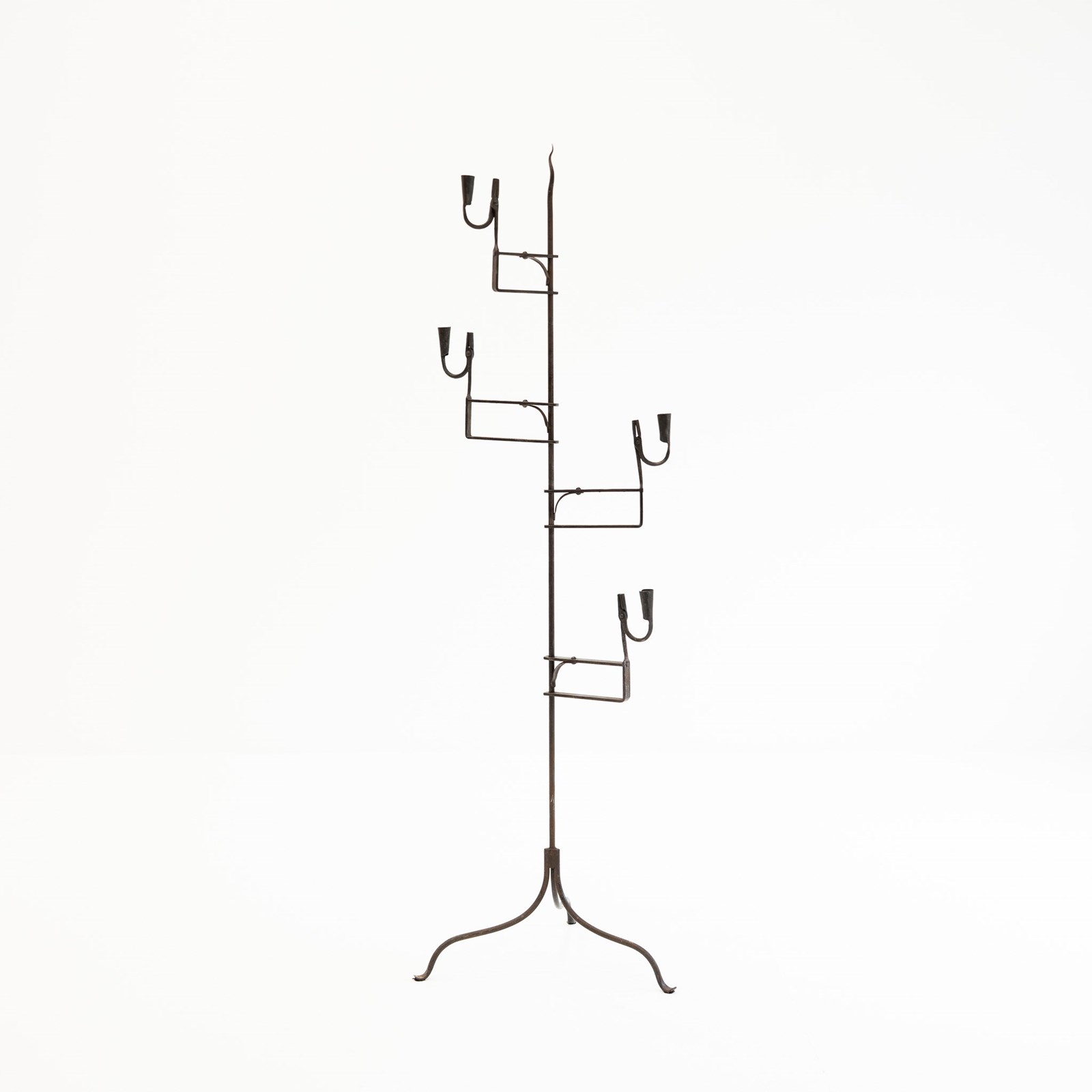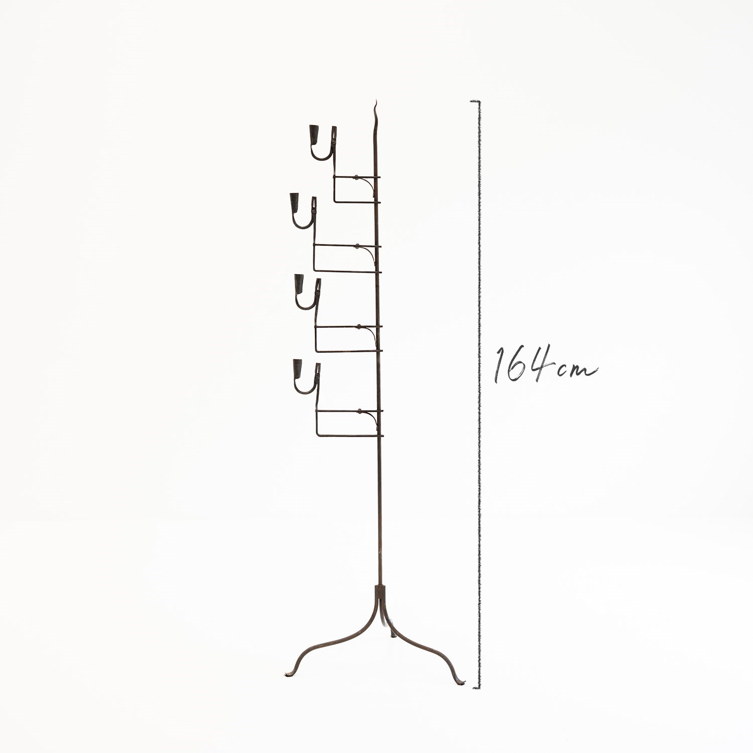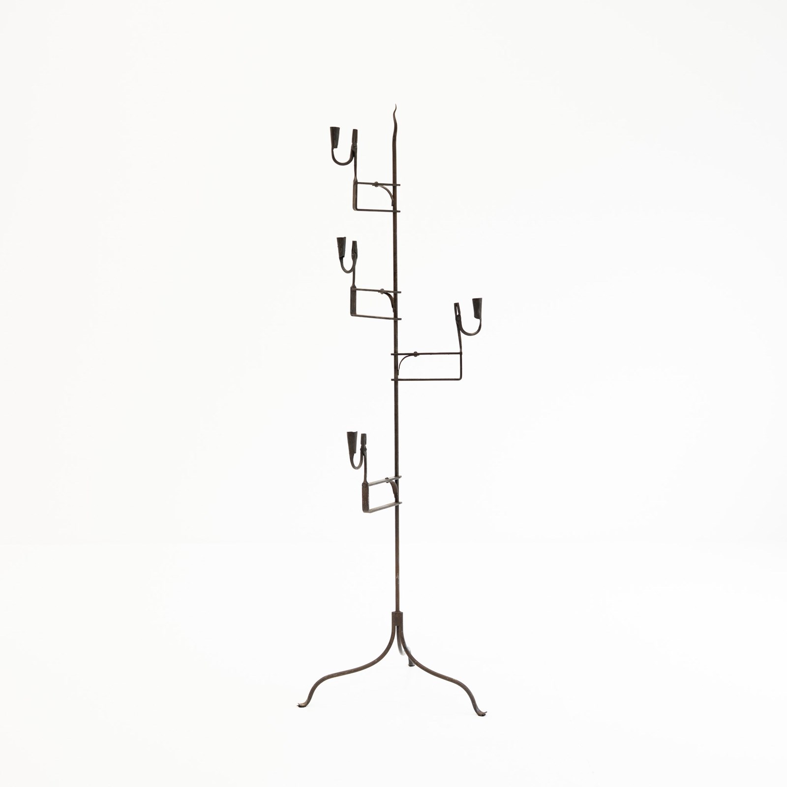 19th Century slender wrought iron adjustable candlestand. It has four moveable arms each with a sconce and rush nip.
