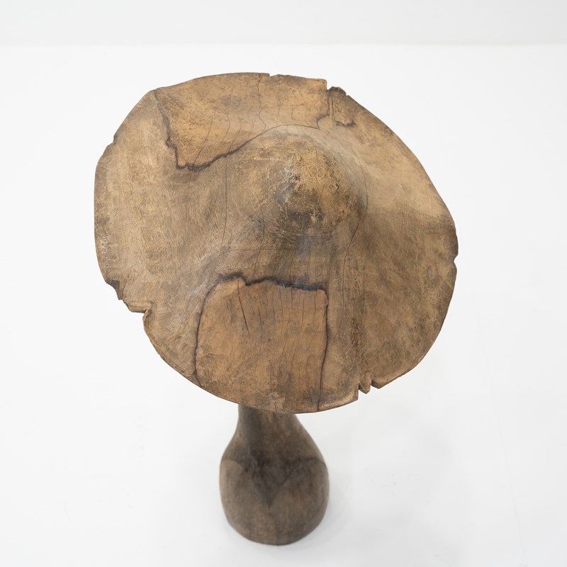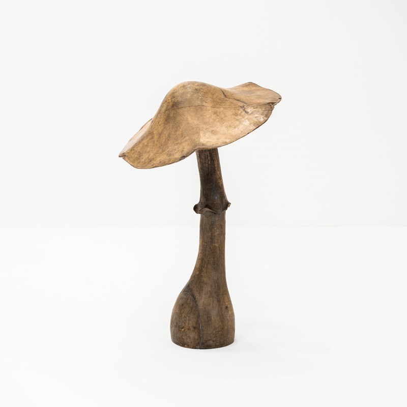 A striking and architecturally scaled carved wooden sculpture in the form of a mushroom, making a commanding visual statement as a decorative object in any interior.