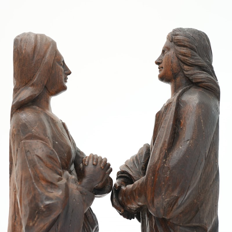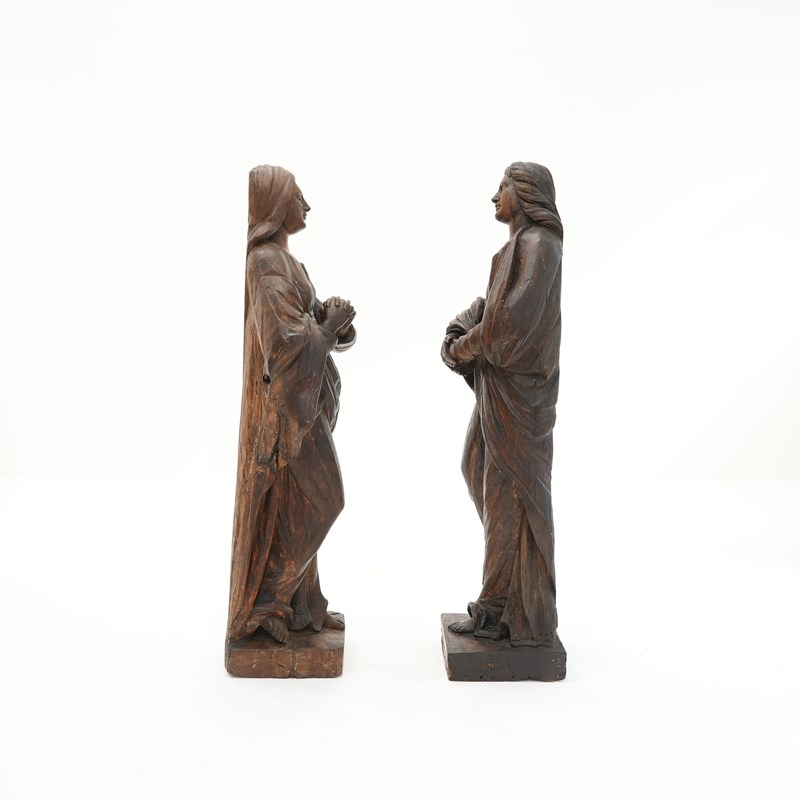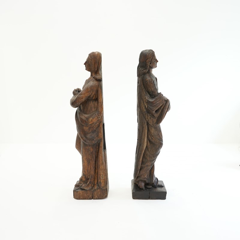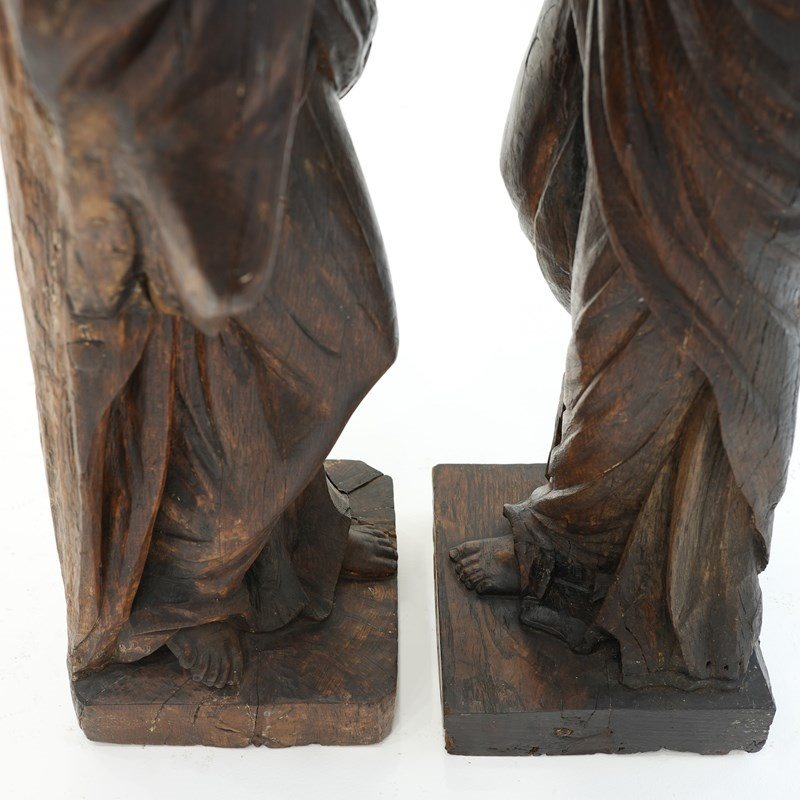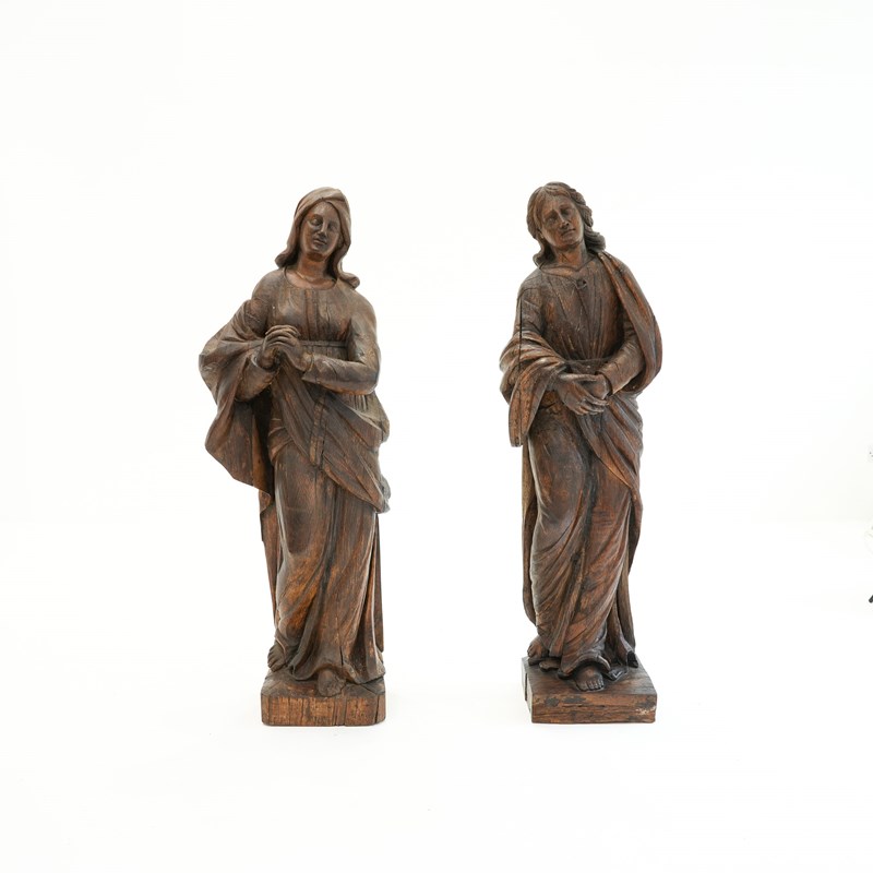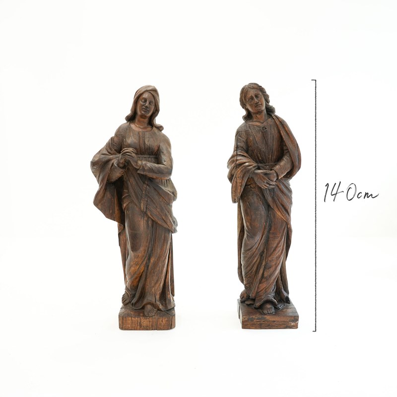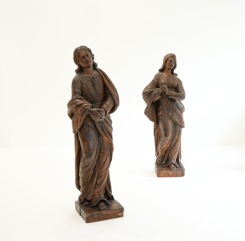 A pair of 18th century carved oak figures identified as the Virgin Mary and St John the Evangelist, most likely former flanking figures from a crucifixion composition. Each figure is shown standing, draped in long robes.
