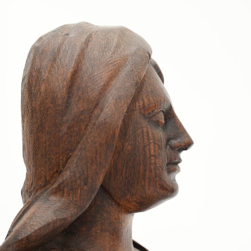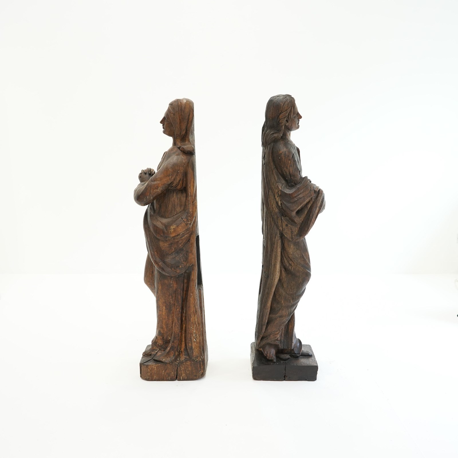 Rectangular recesses to the reverse indicate these were probably originally secured into an architectural framework, both stand on simple square plinth bases. The oak has acquired an even patina and exhibits age-appropriate surface wear and small historic losses.