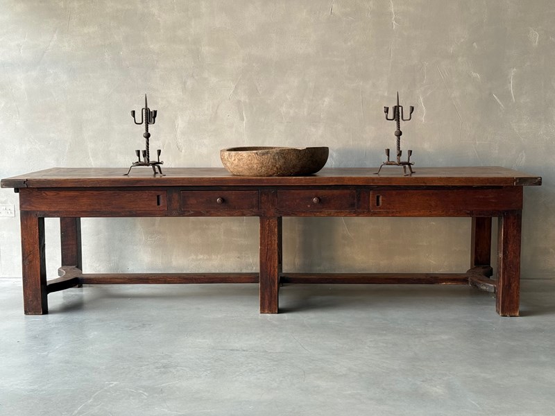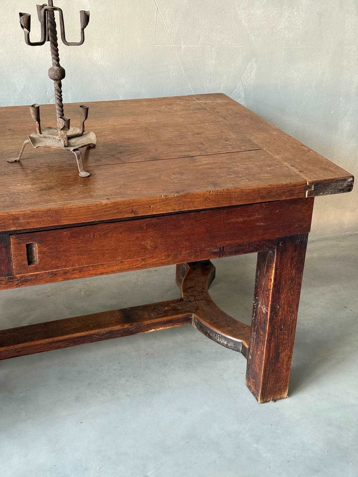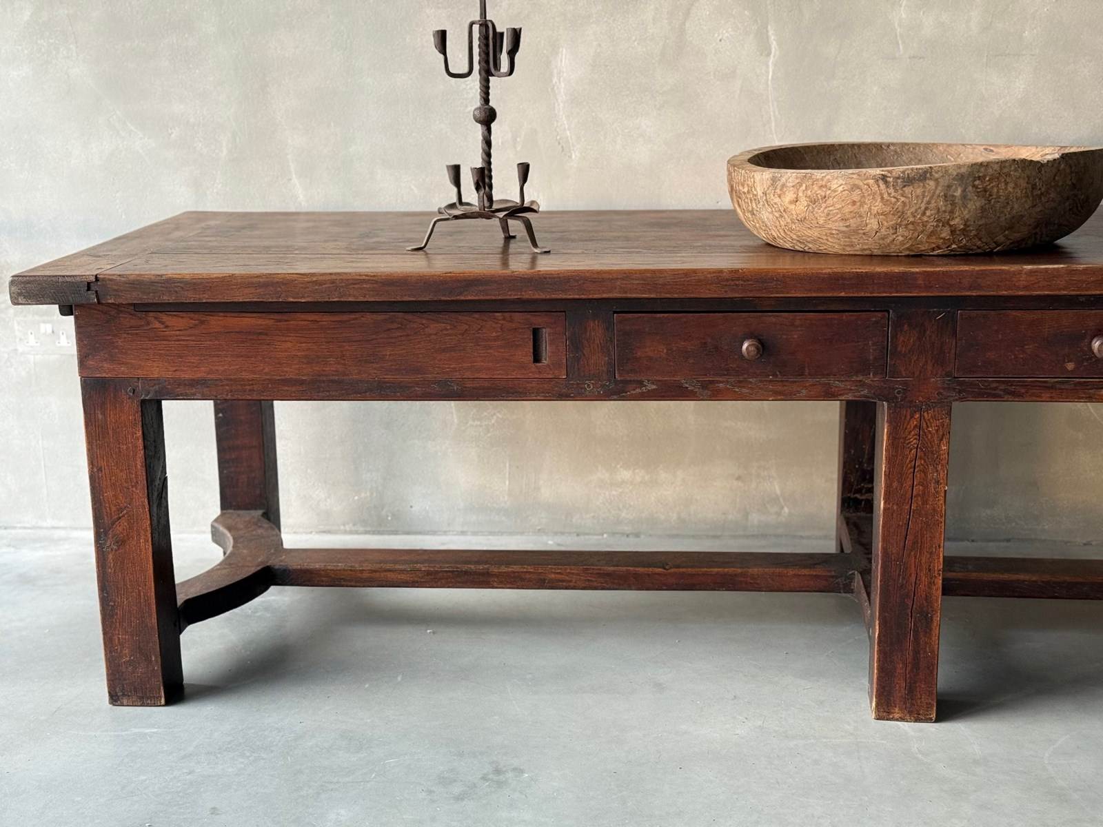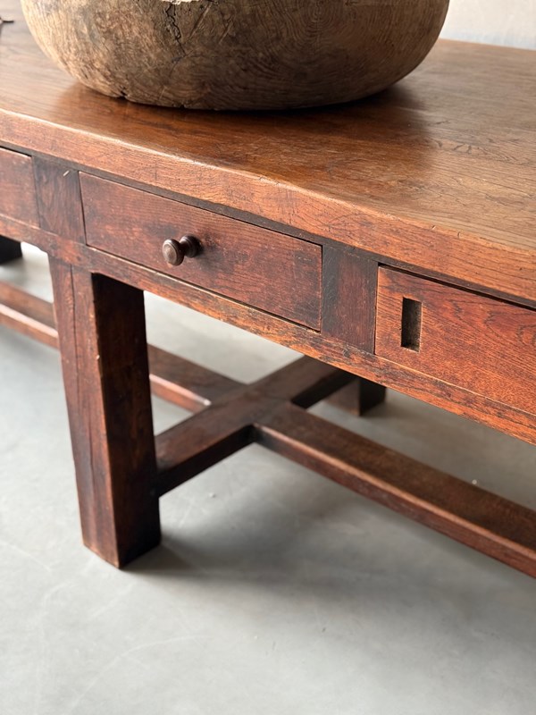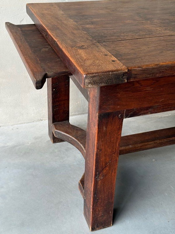 An Outstanding C19th French Farm Table of wonderfully chunky proportions with 6 block legs, joined by broad flat stretchers which are concave at the ends. The scale of this table is eye catching as everything is bolder than normal. Additional features are twin drawers either side of the central leg and long sliding frieze compartments to the side which have beautifully simple finger recesses. To each end there are pull out slide extensions. Height under frieze 58cm.