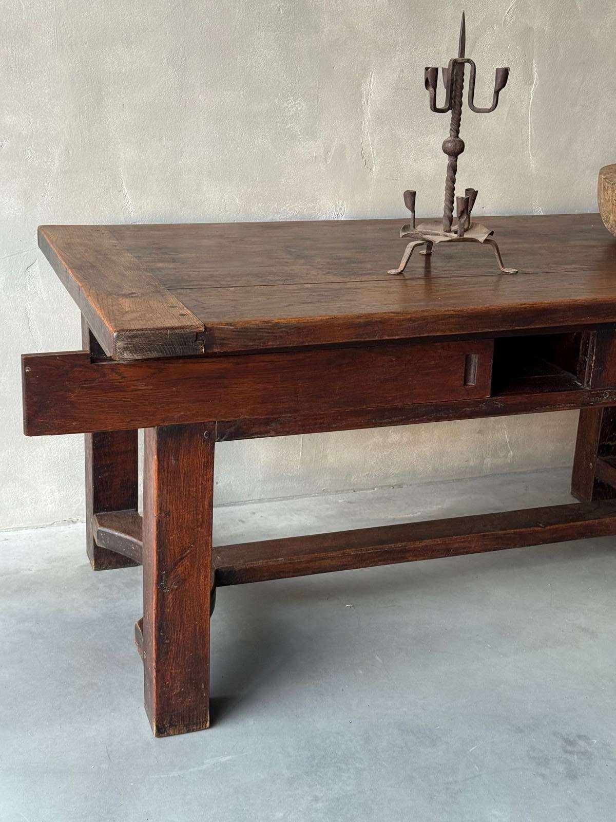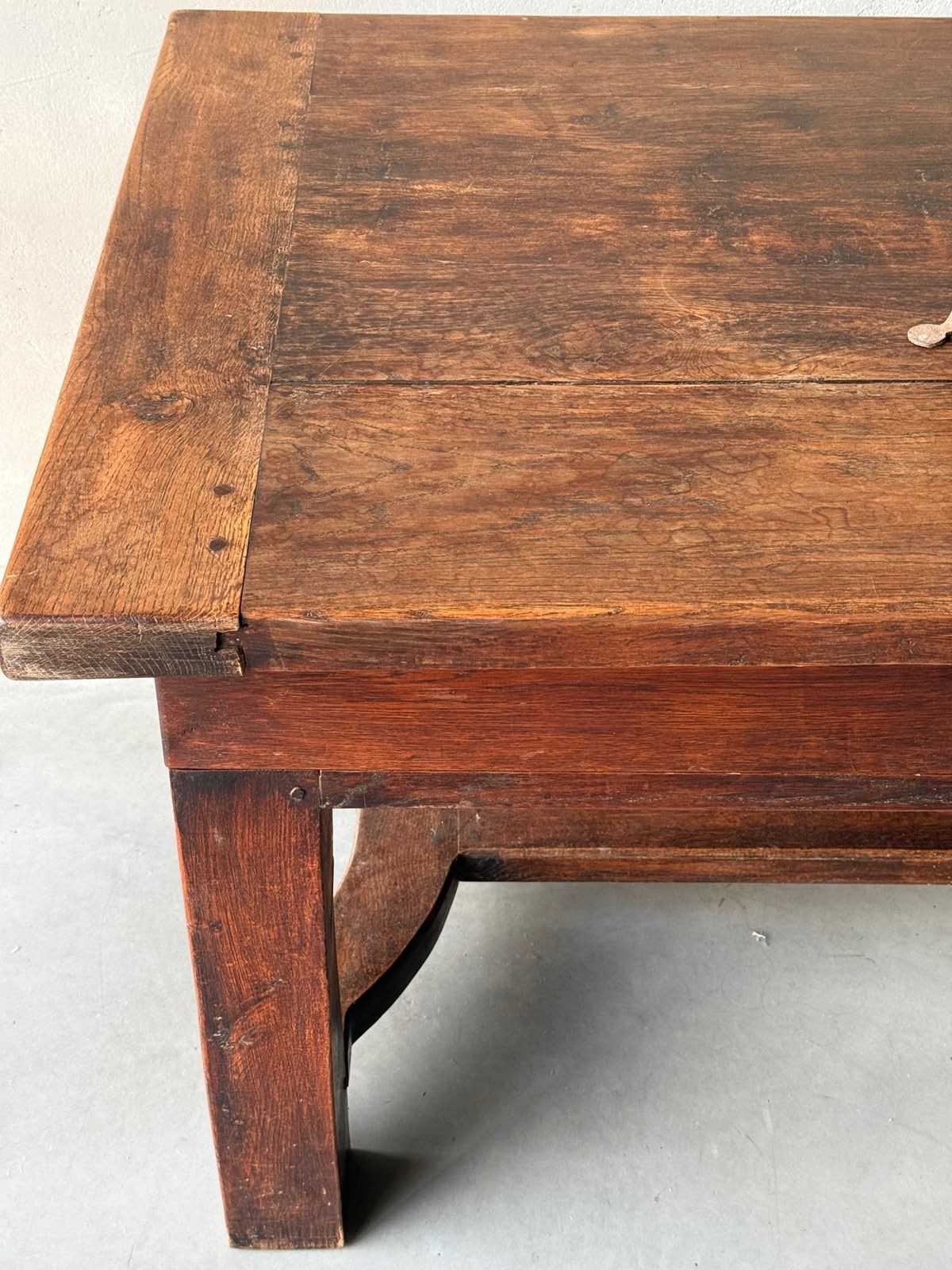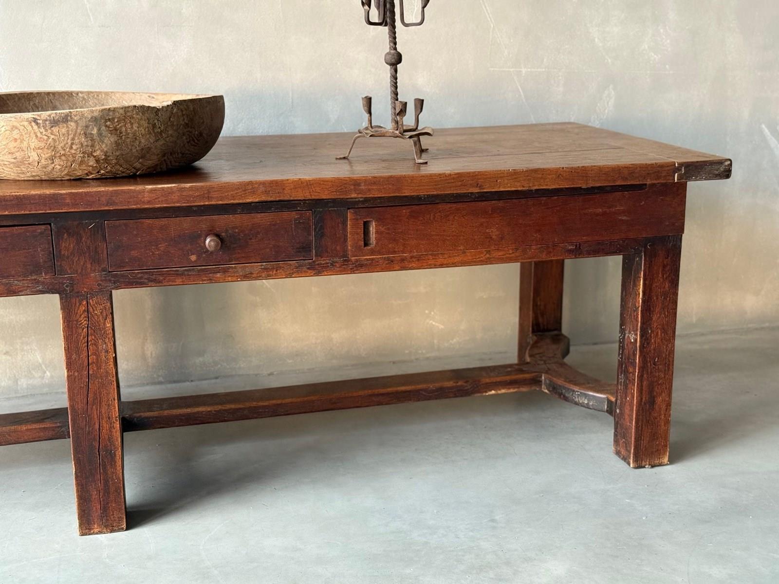 An Outstanding C19th French Farm Table of wonderfully chunky proportions with 6 block legs, joined by broad flat stretchers which are concave at the ends. The scale of this table is eye catching as everything is bolder than normal. Additional features are twin drawers either side of the central leg and long sliding frieze compartments to the side which have beautifully simple finger recesses. To each end there are pull out slide extensions. Height under frieze 58cm.