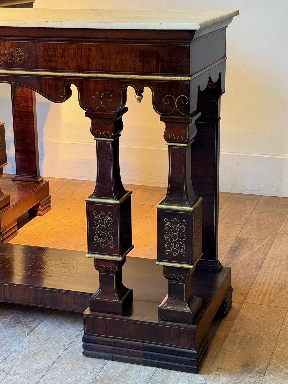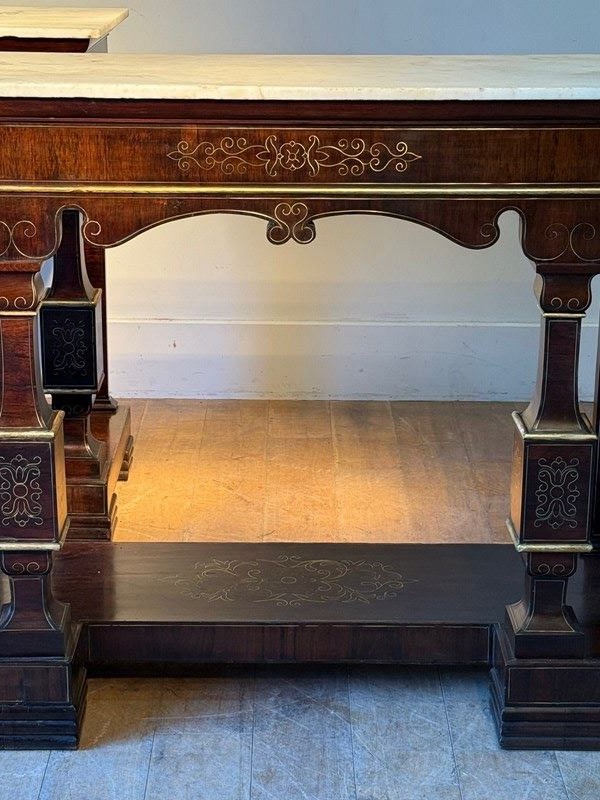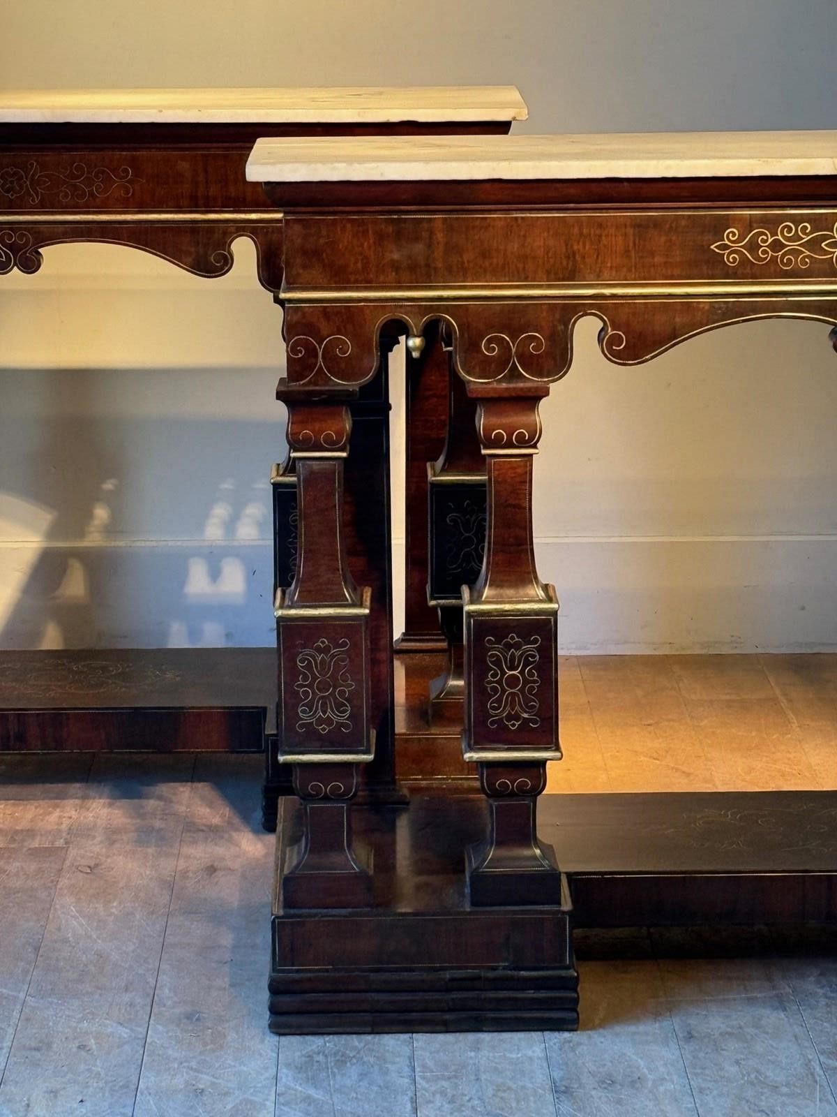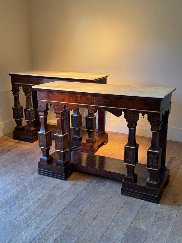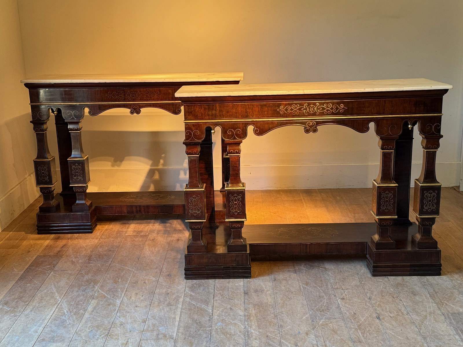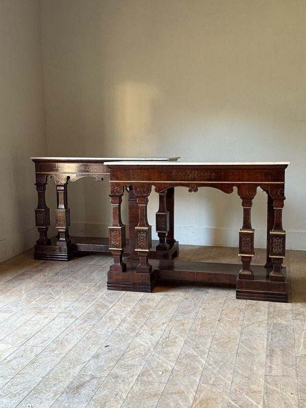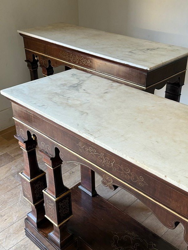 C1870 A Pair of Italian Brass Inlaid Rosewood Console Tables - with white marble tops.