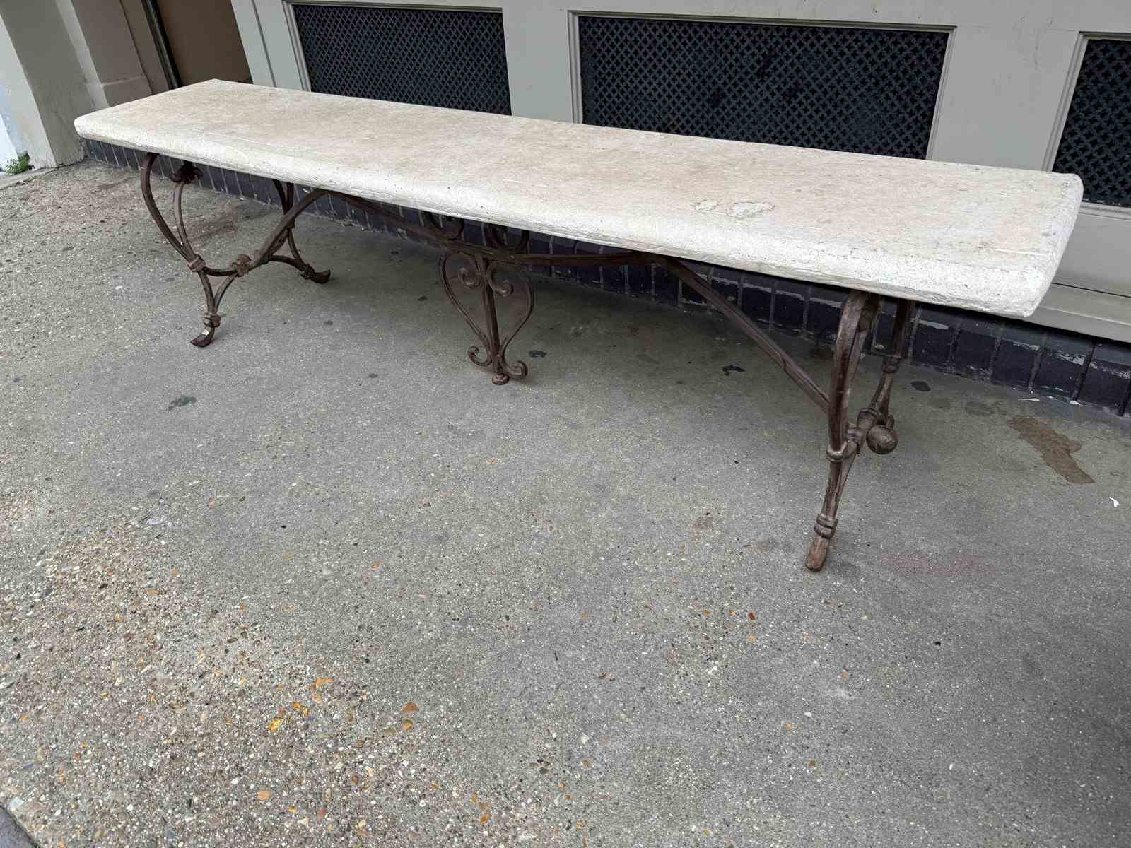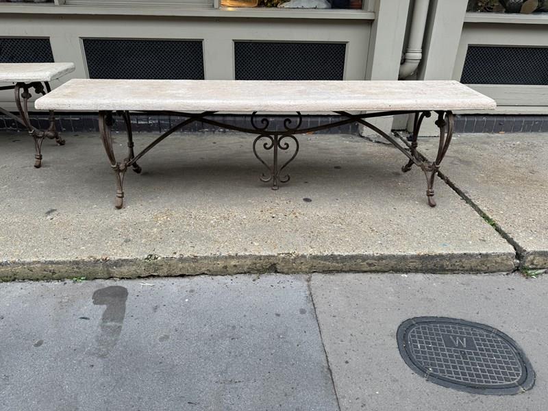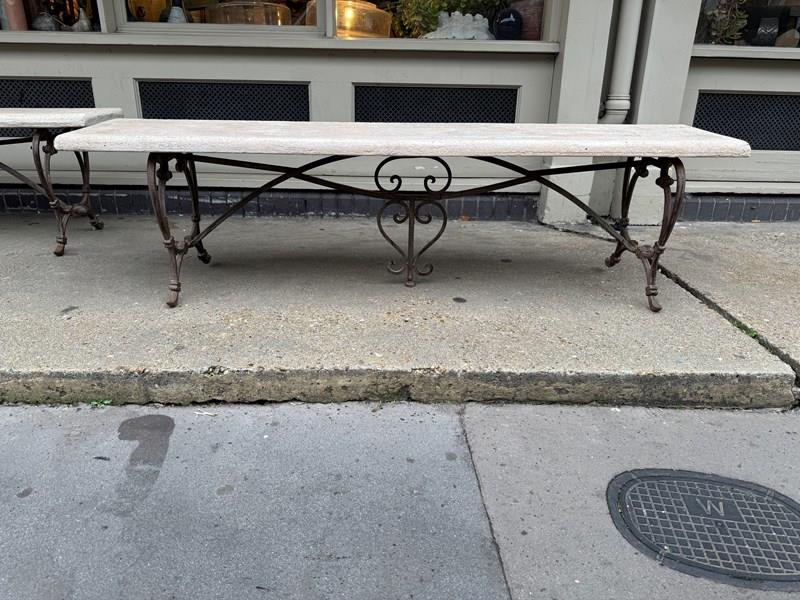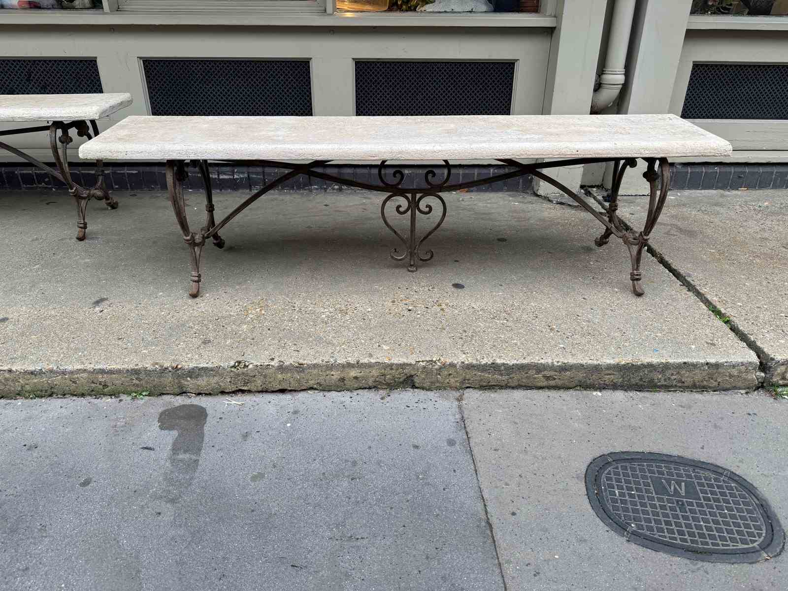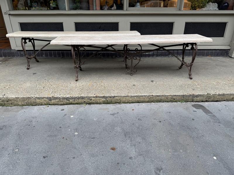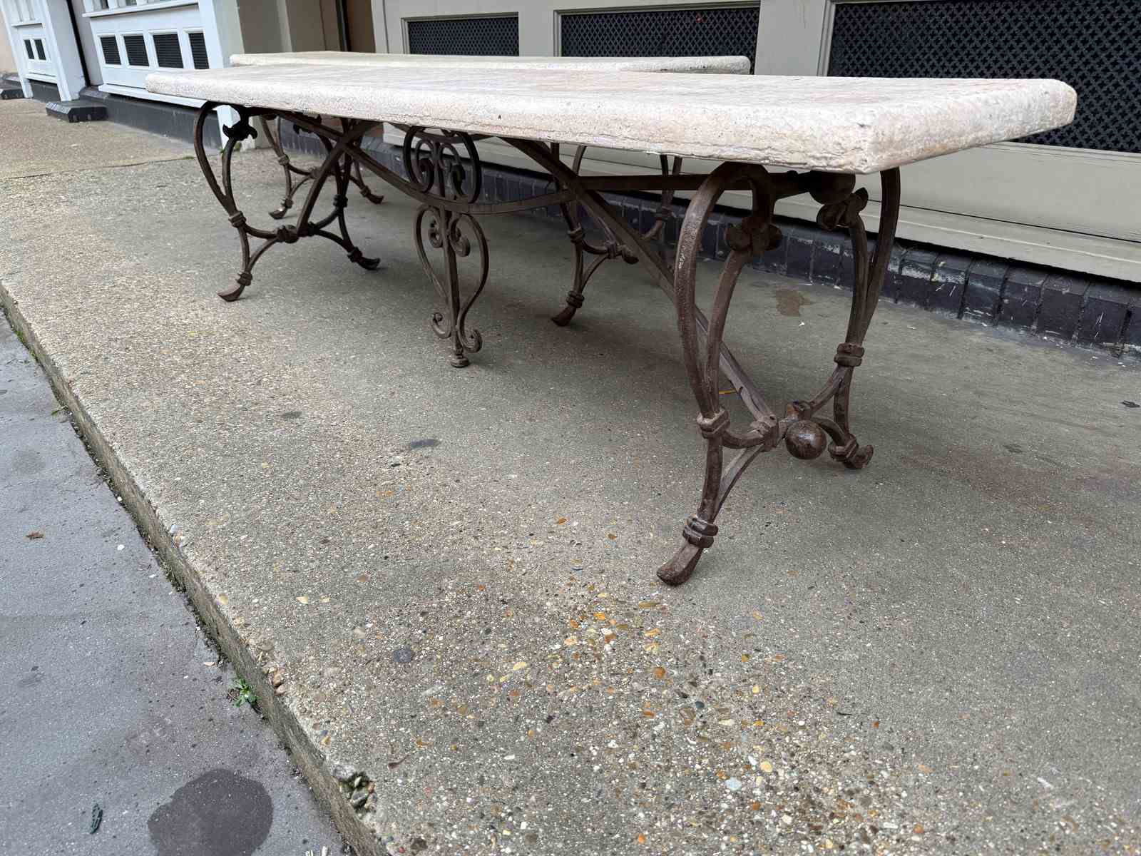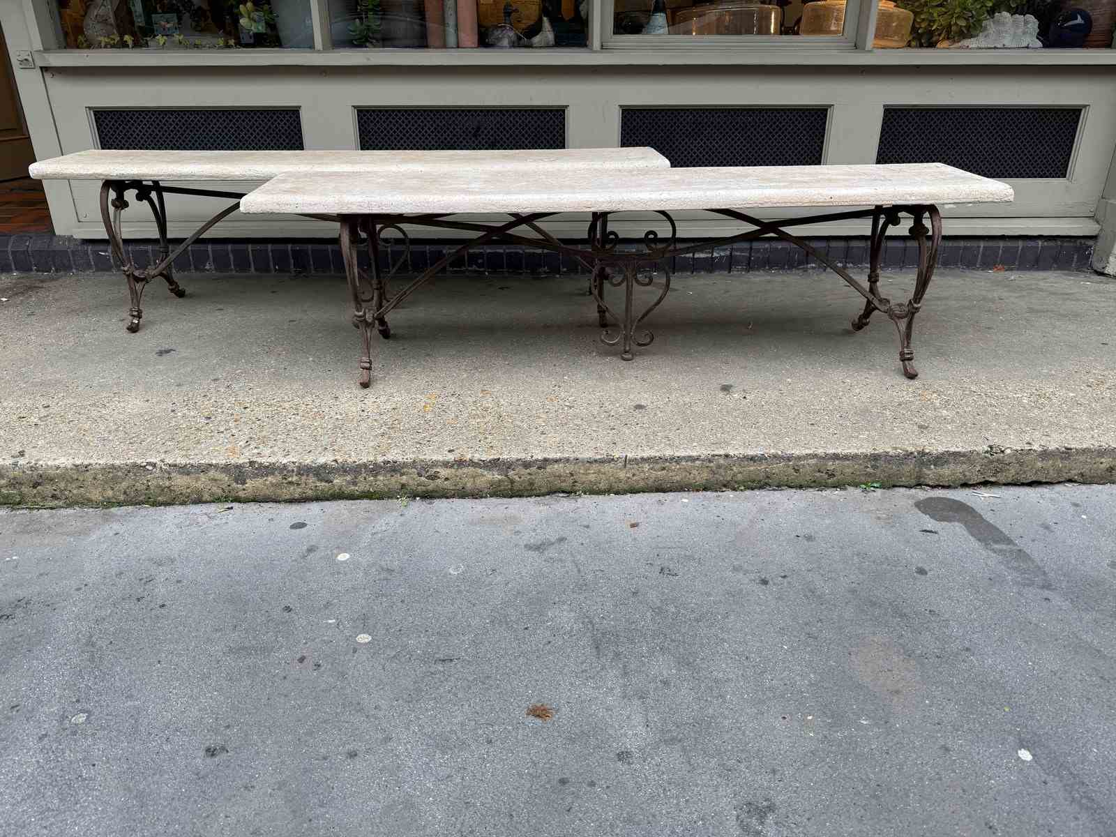 C1900 A Pair of French Art Nouveau Benches - the elegant brass bases supporting a reconstituted stone top.