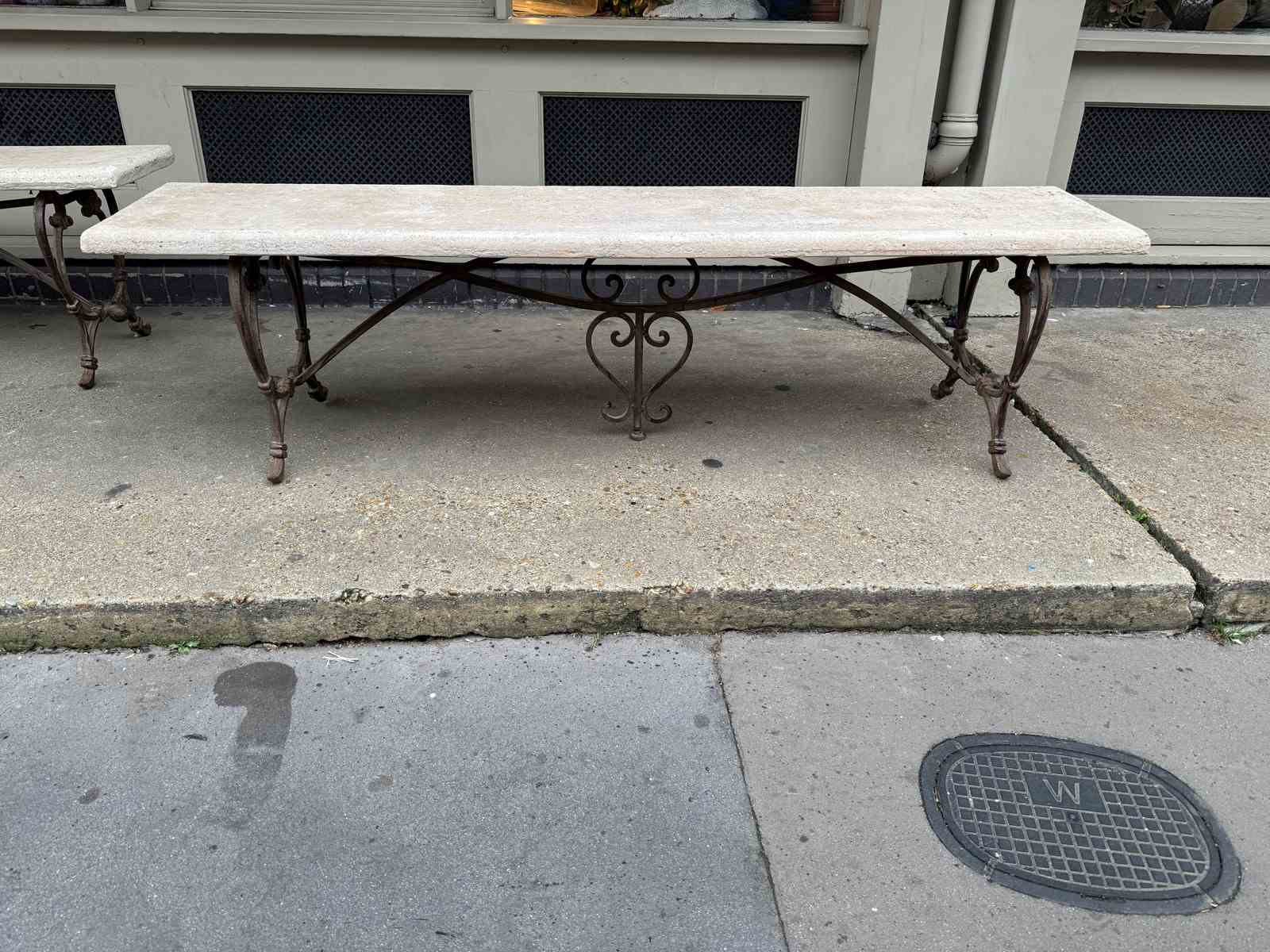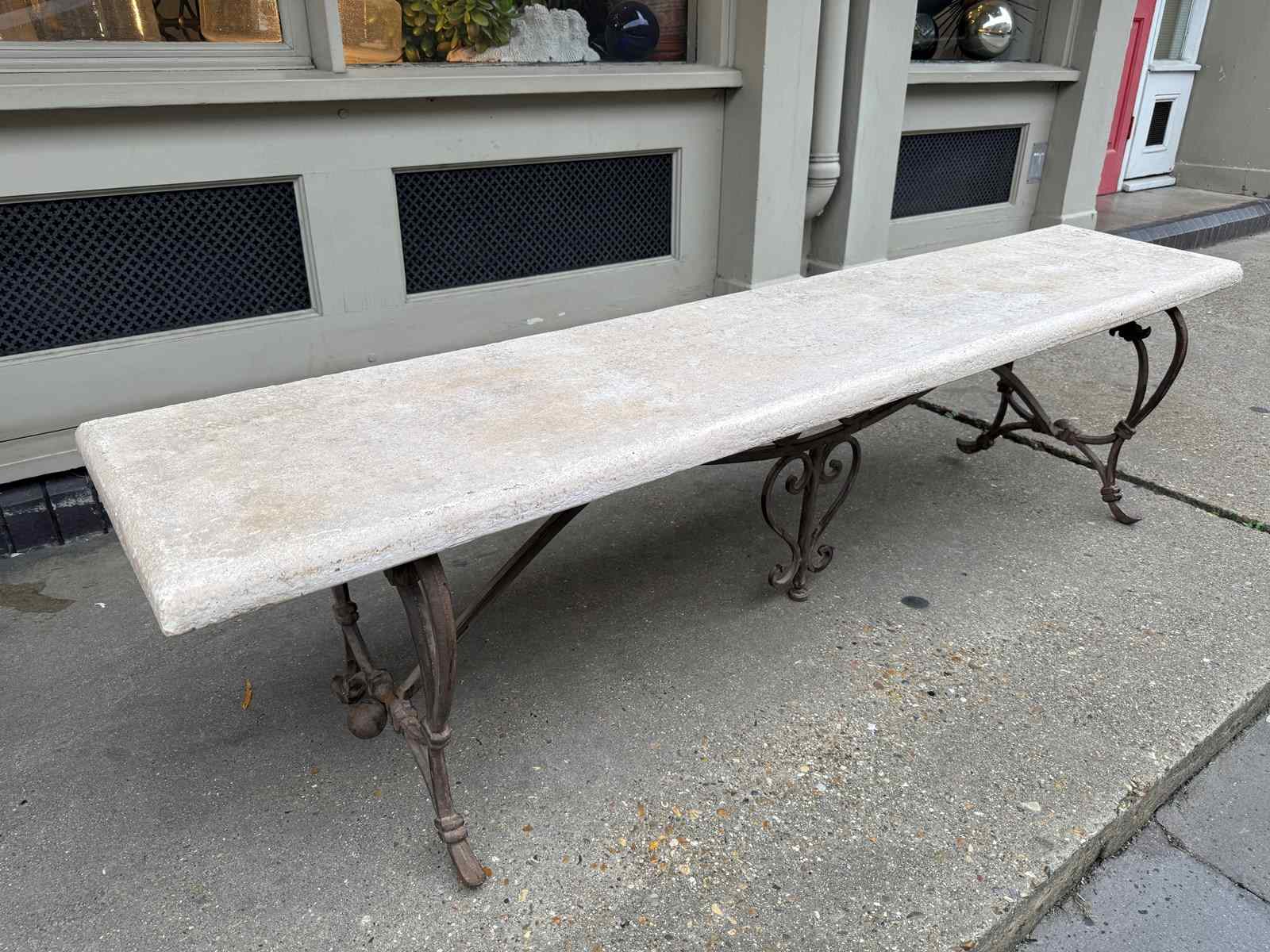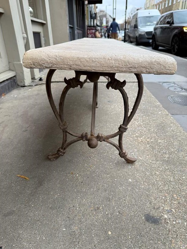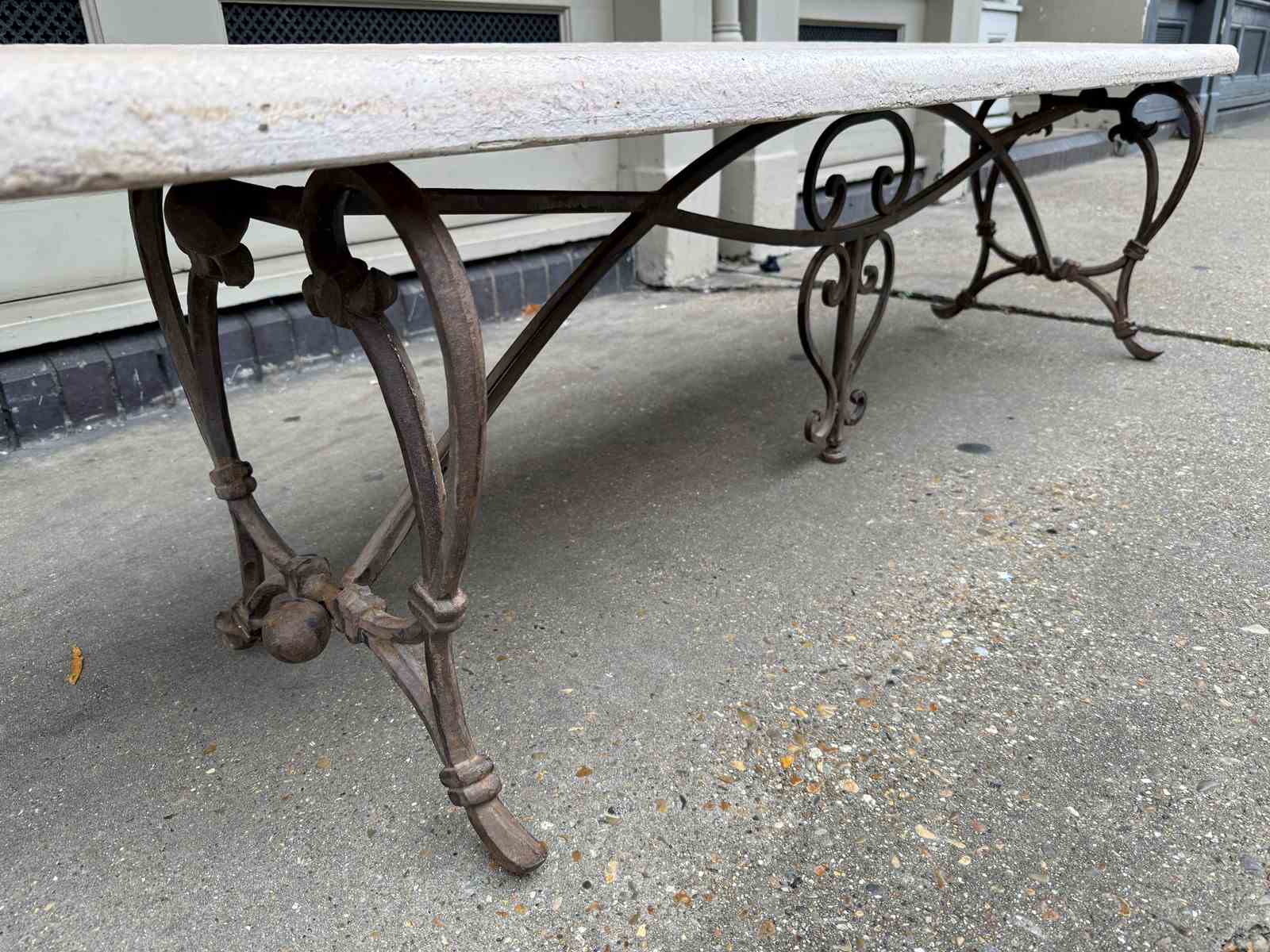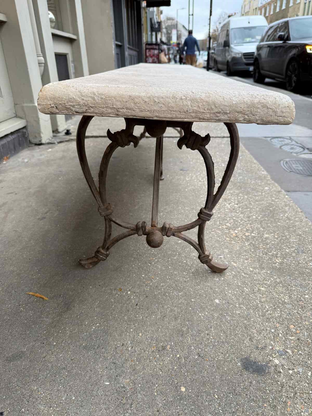 C1900 A Pair of French Art Nouveau Benches - the elegant brass bases supporting a reconstituted stone top.
