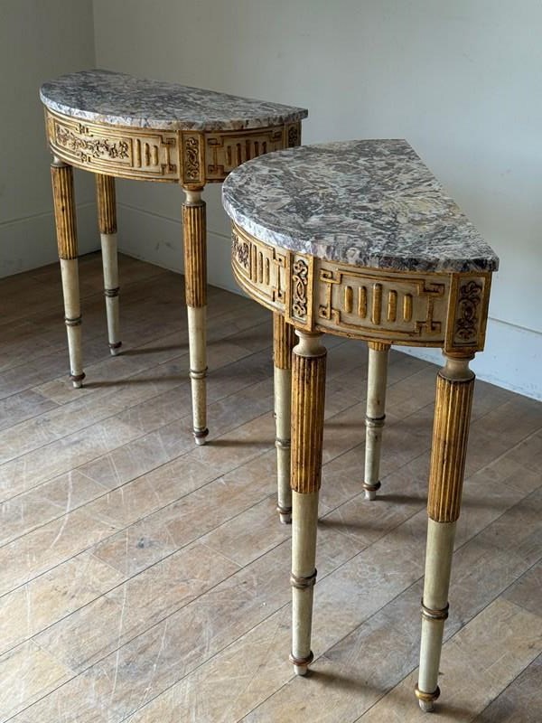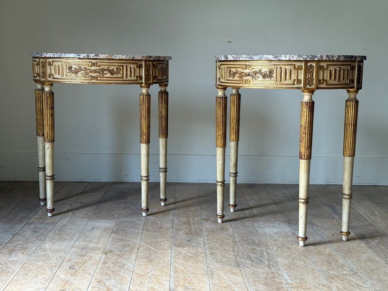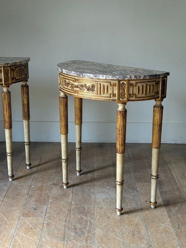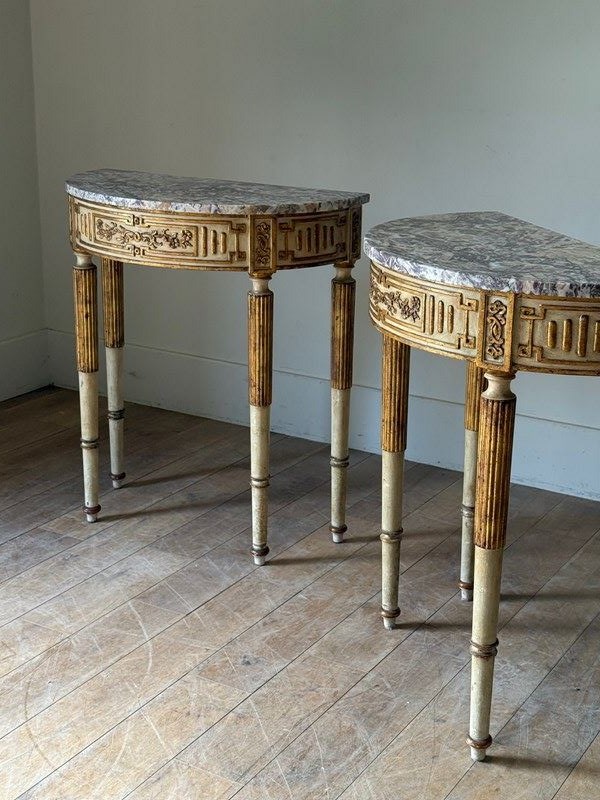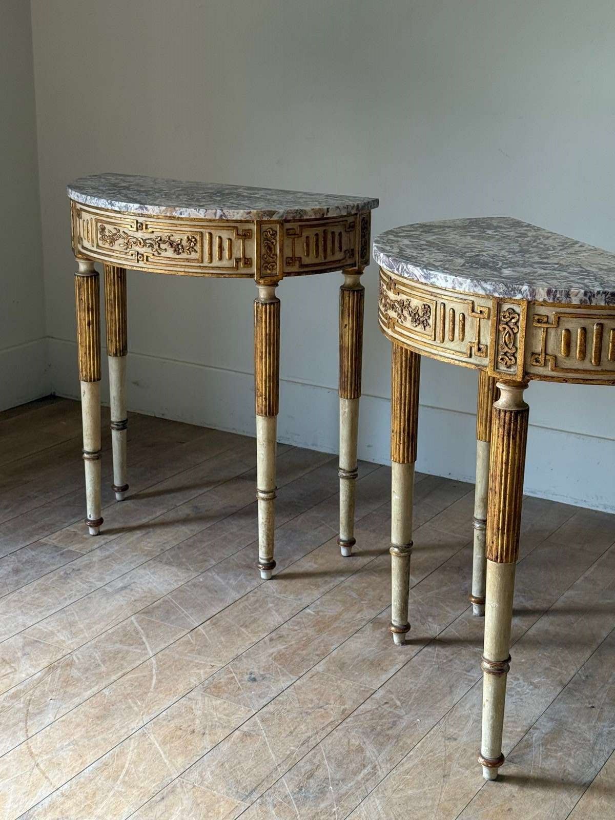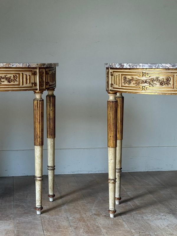 C1930 A Pair of Painted Portuguese Consoles in 18th Century Style - with their original paint & gilding & marble tops!