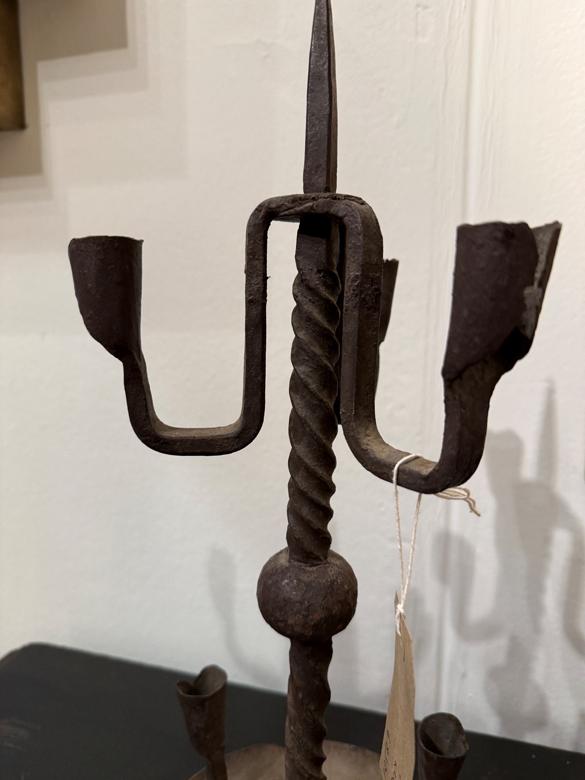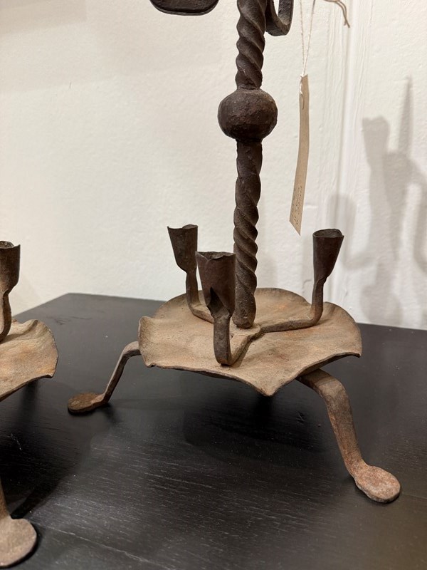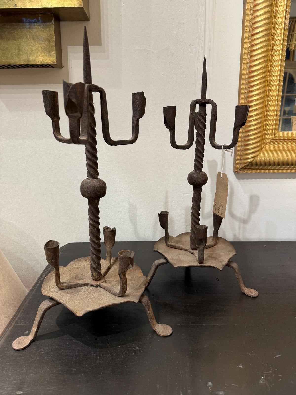 A Pair of Wrought Iron Candelabra, each with 6 candle holders and large candle Pricket above drip pan bases and tripod legs. Early C20th in archaic style.