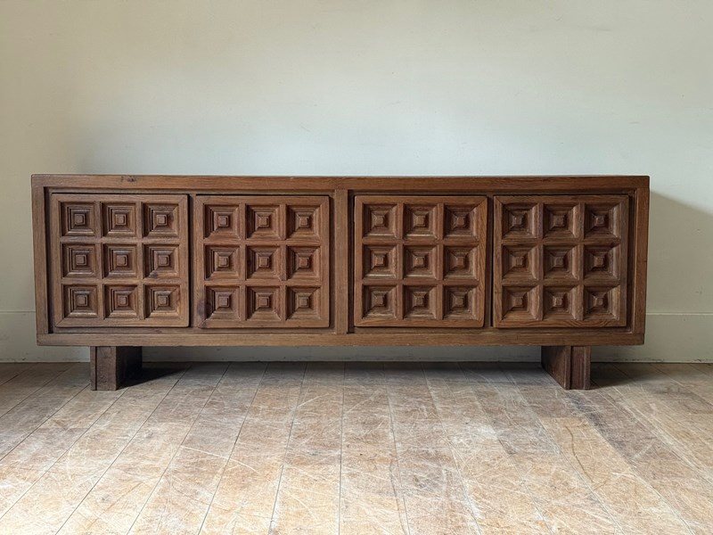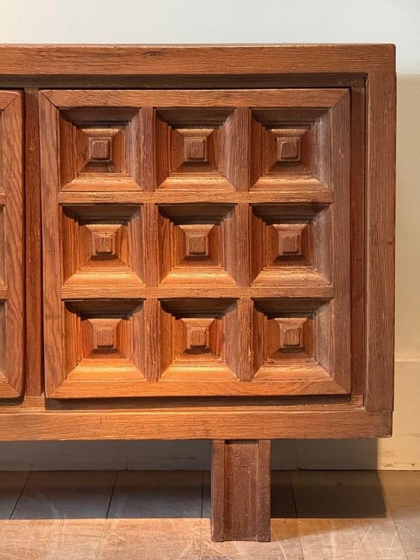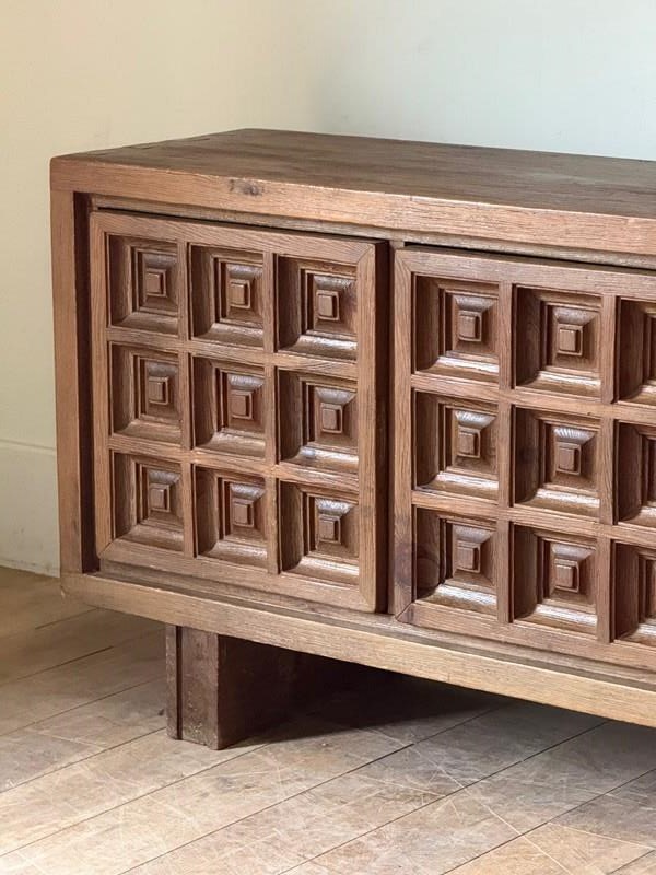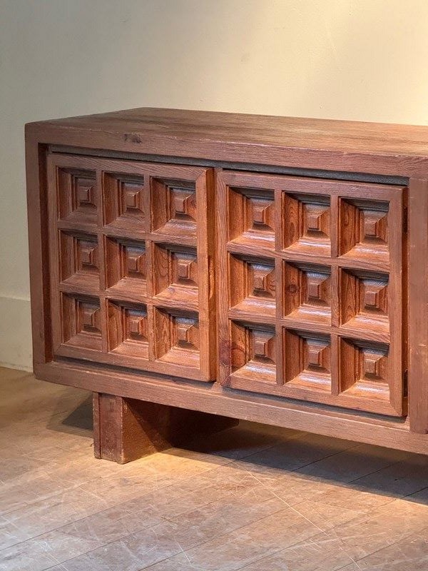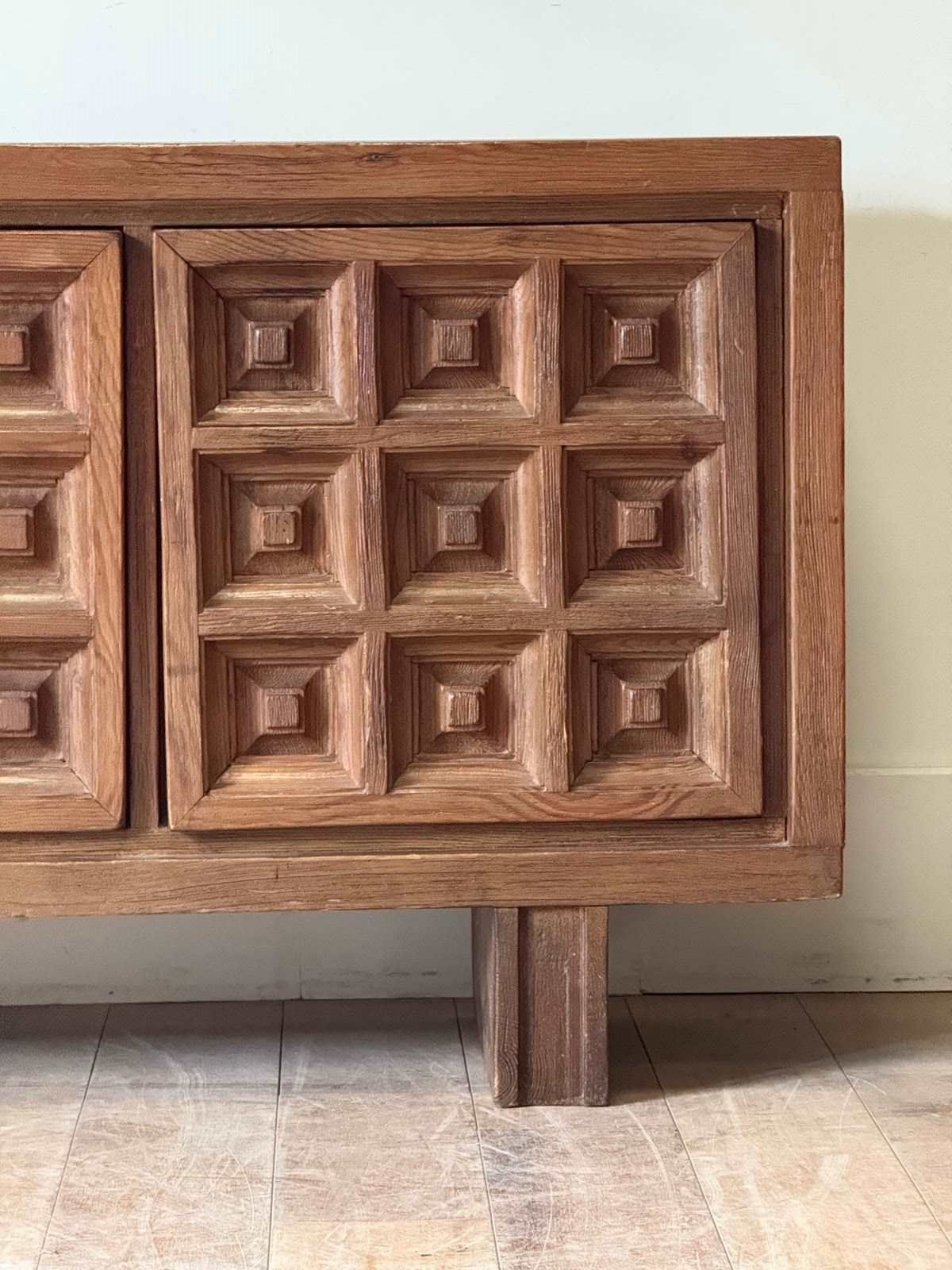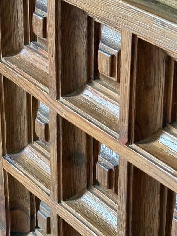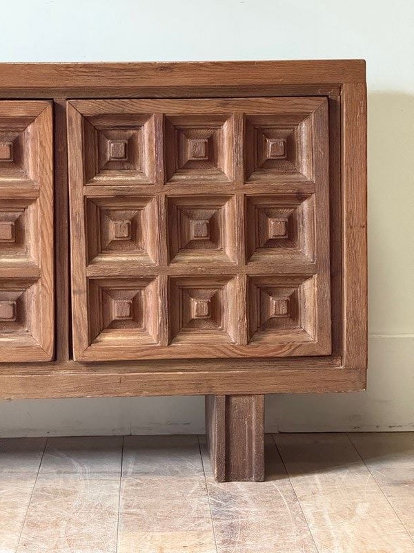 Constructed in stained pine wood this cabinet has a profuse arrangement of deep moulded panels with reticulated panels above,all leading to it's geometric, brutaslist design theme.