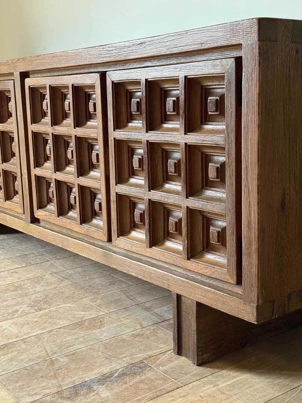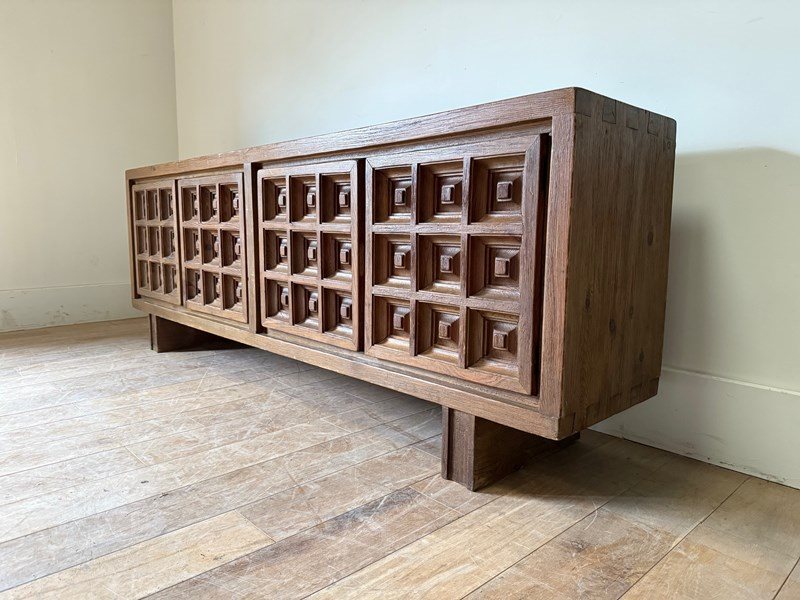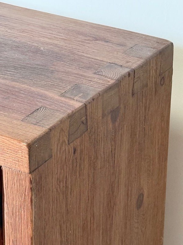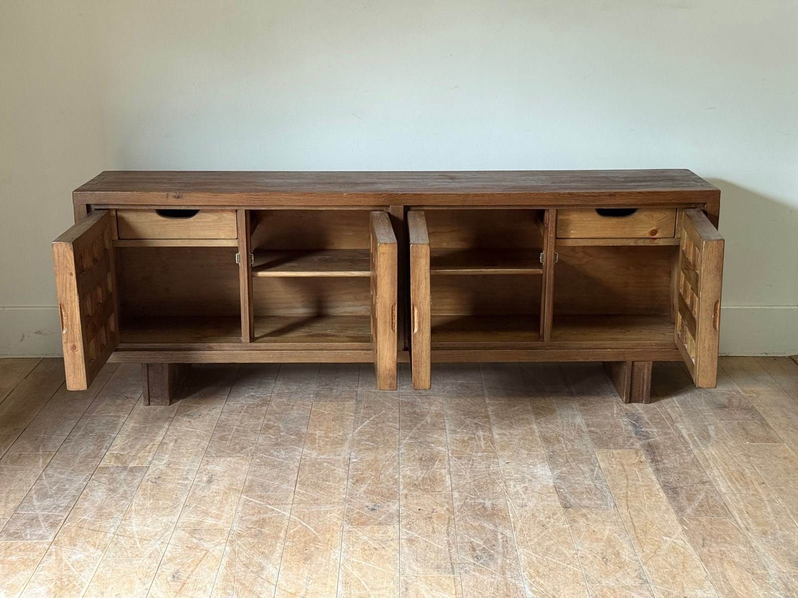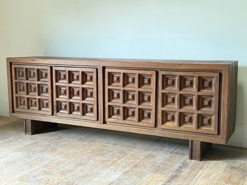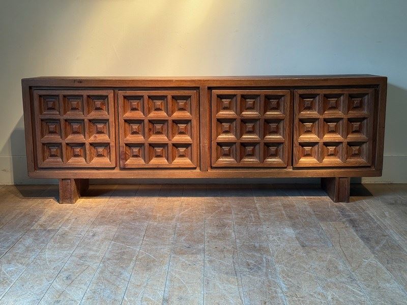 Constructed in stained pine wood this cabinet has a profuse arrangement of deep moulded panels with reticulated panels above,all leading to it's geometric, brutaslist design theme.