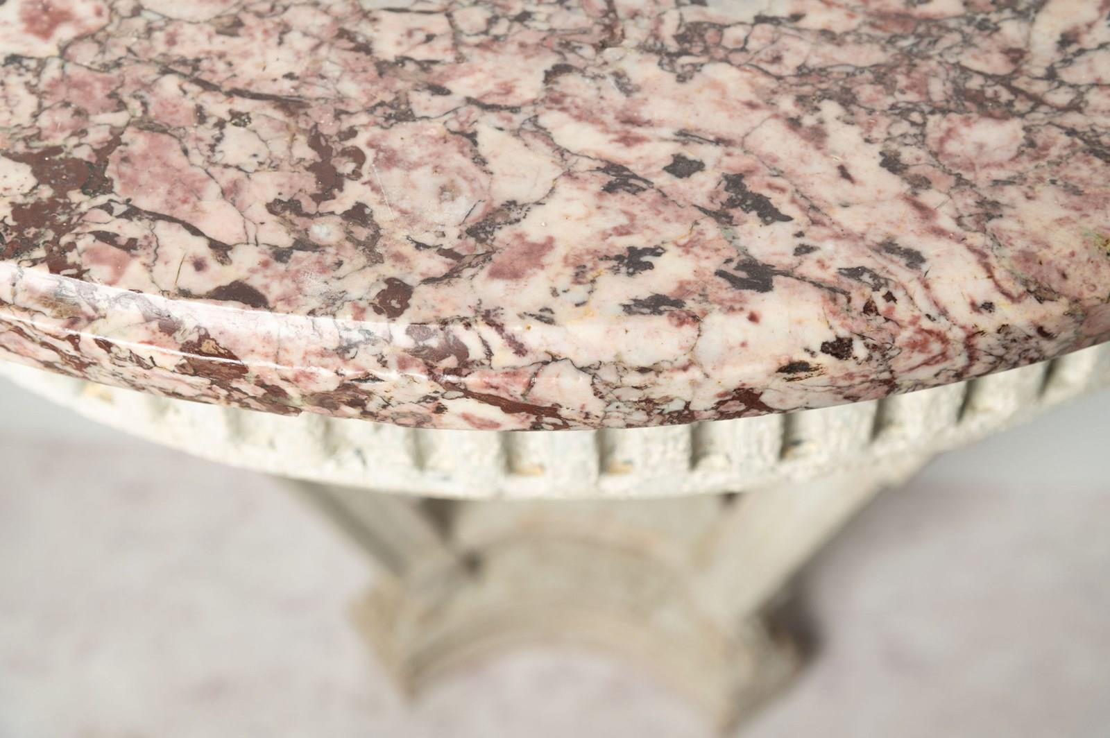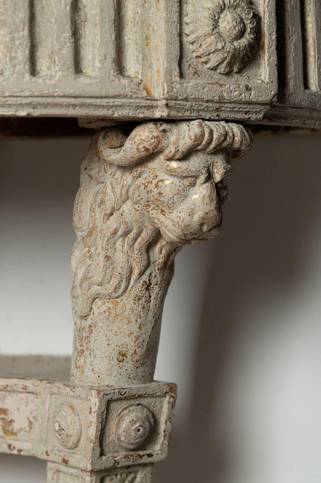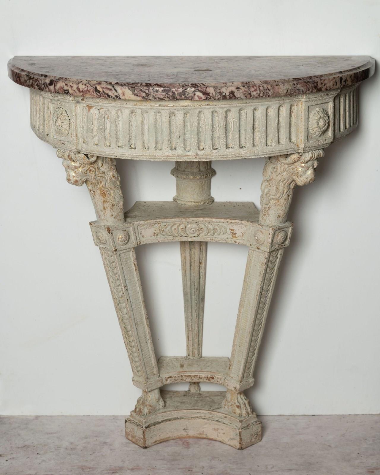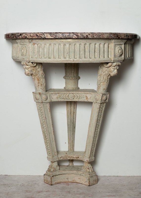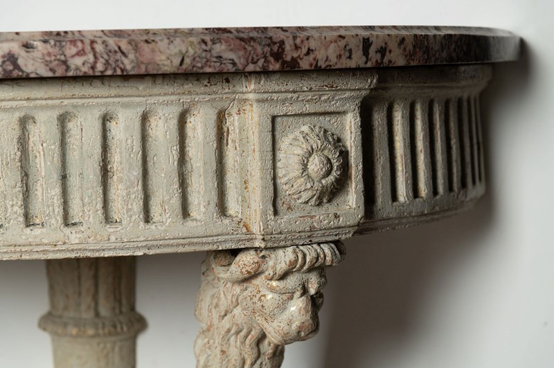 19th Century French console table, lovely lion heads with lion paw feet. Pretty original pink marble, small – very thin historic restoration to the marble that is not noticeable on one corner, nothing that detracts, structurally sound. A nice quality table.