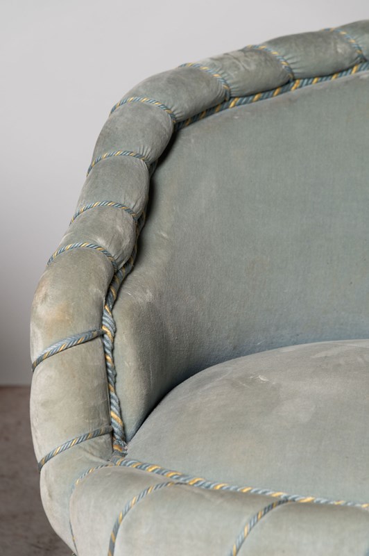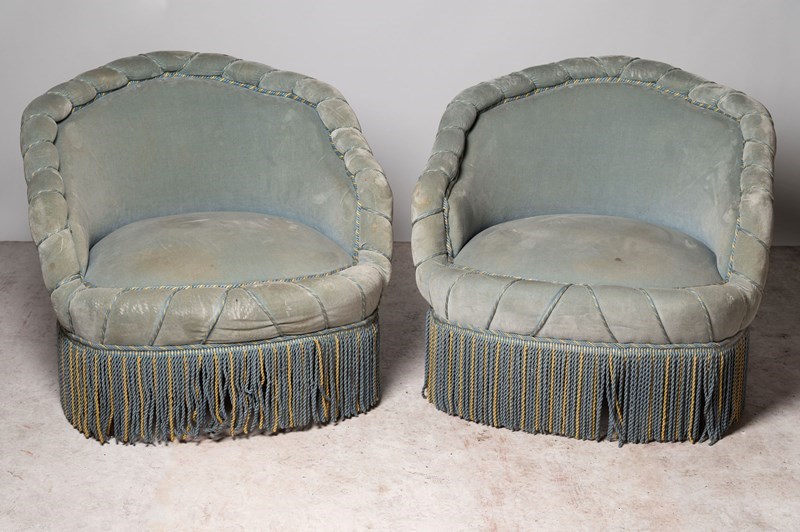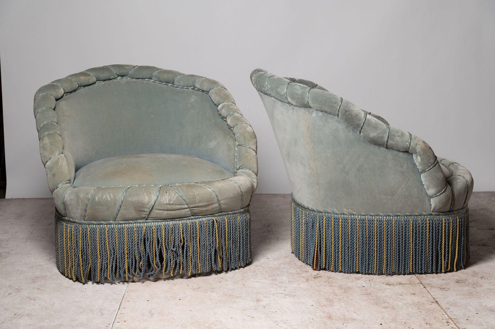 Generous size pair of antique French low back piecrust chairs ready for your own upholstery. Rare model. Seat depth 24.5 inches.