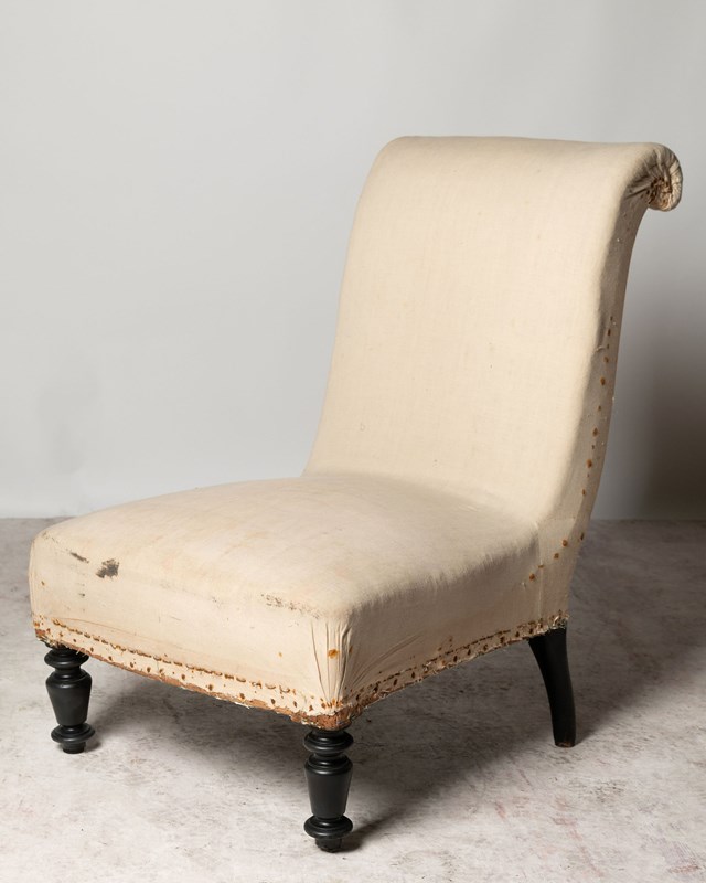 Antique French scroll back slipper chair, ideal fireside, bedroom or occasional chair. Seat depth 19 inches, floor to seat 12 inches.