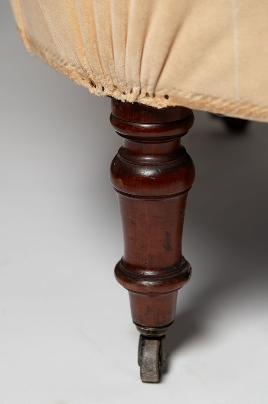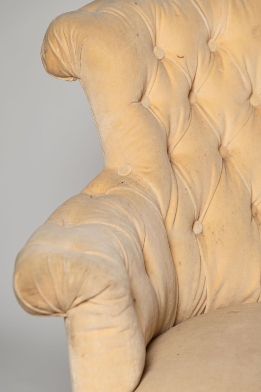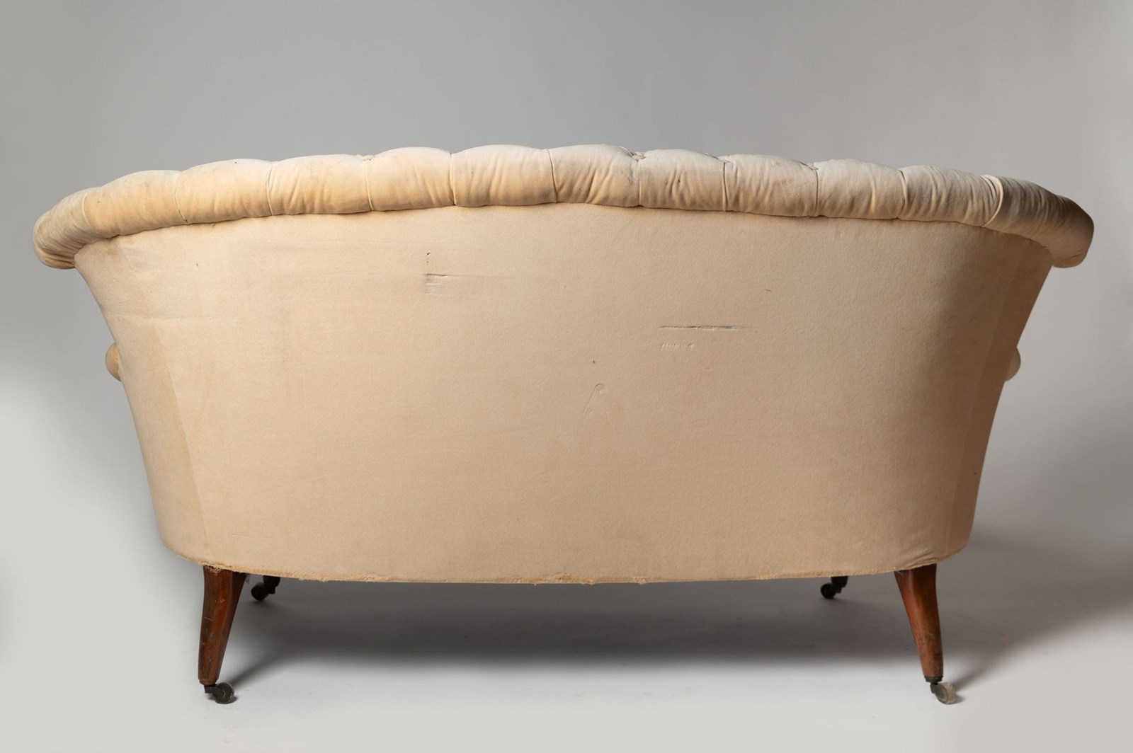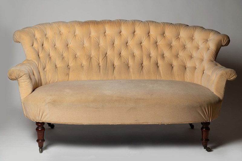 A nice shape antique French sofa, ready for your own fabric. Seat depth 23 inches. It could be upholstered with a plain back if preferred instead of buttons.