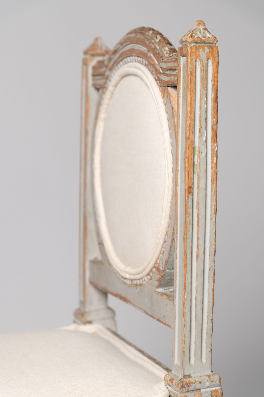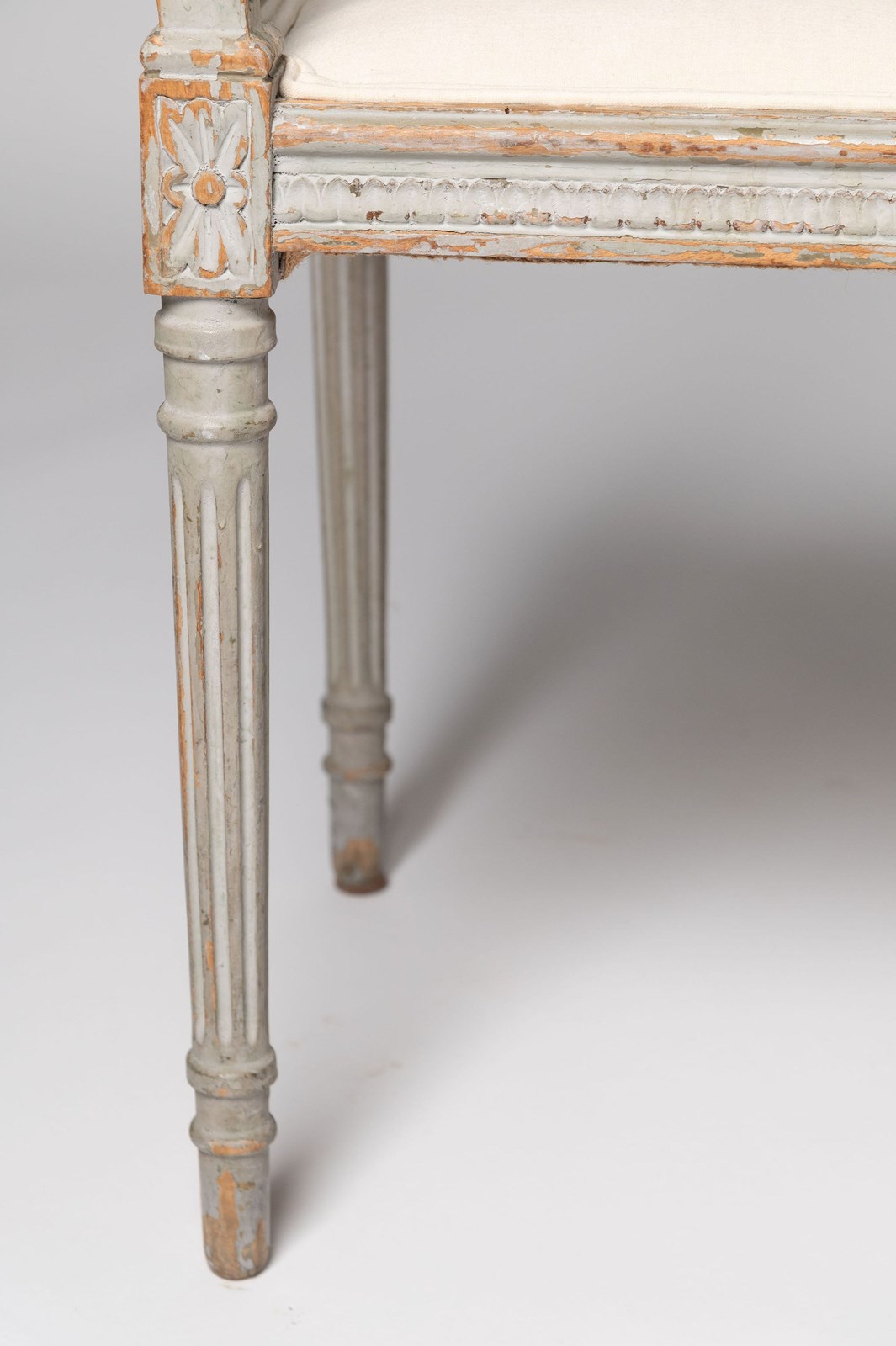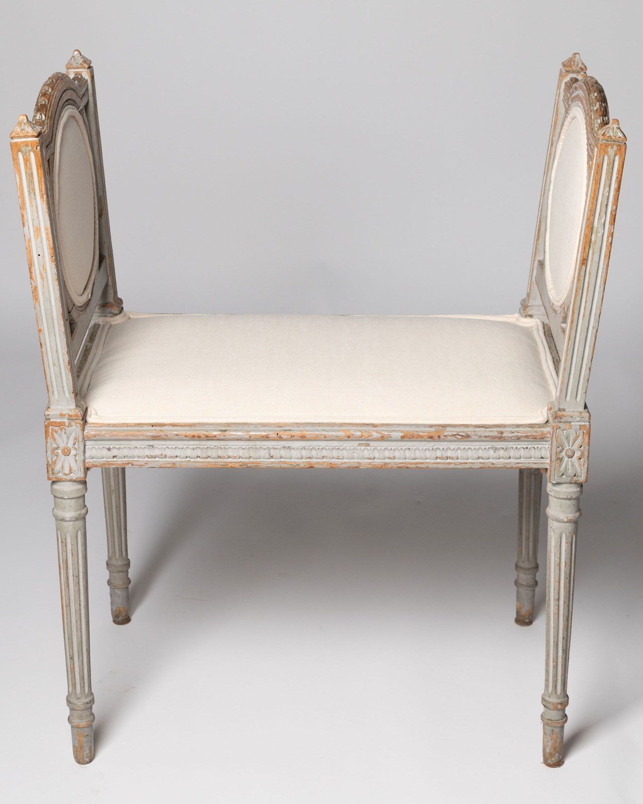 Antique French stool, original paint, recently upholstered in antique French linen. Seat height 16.5 inches.