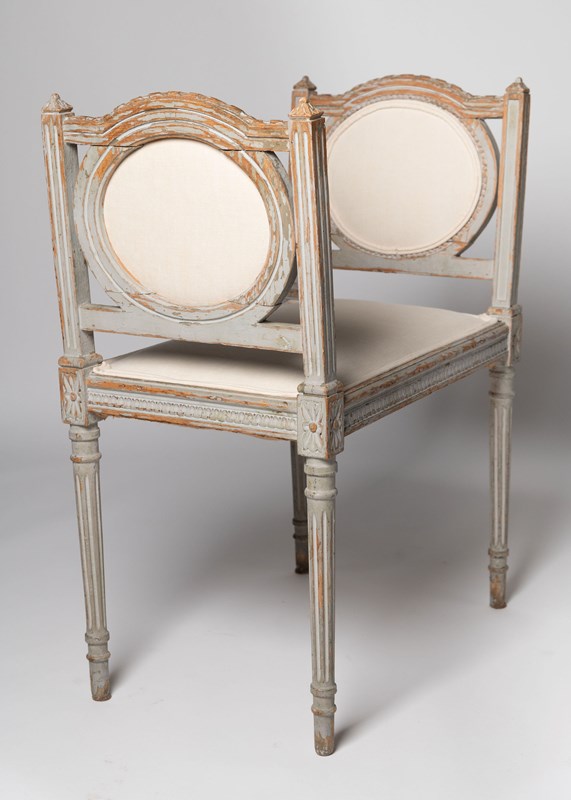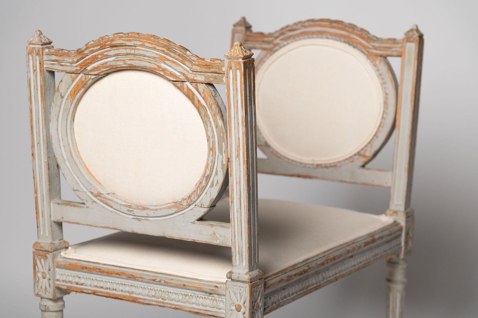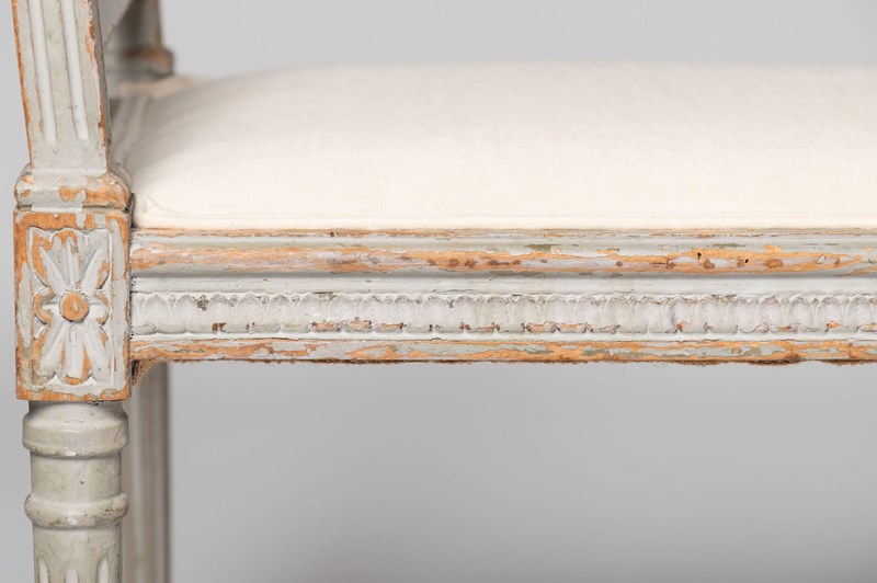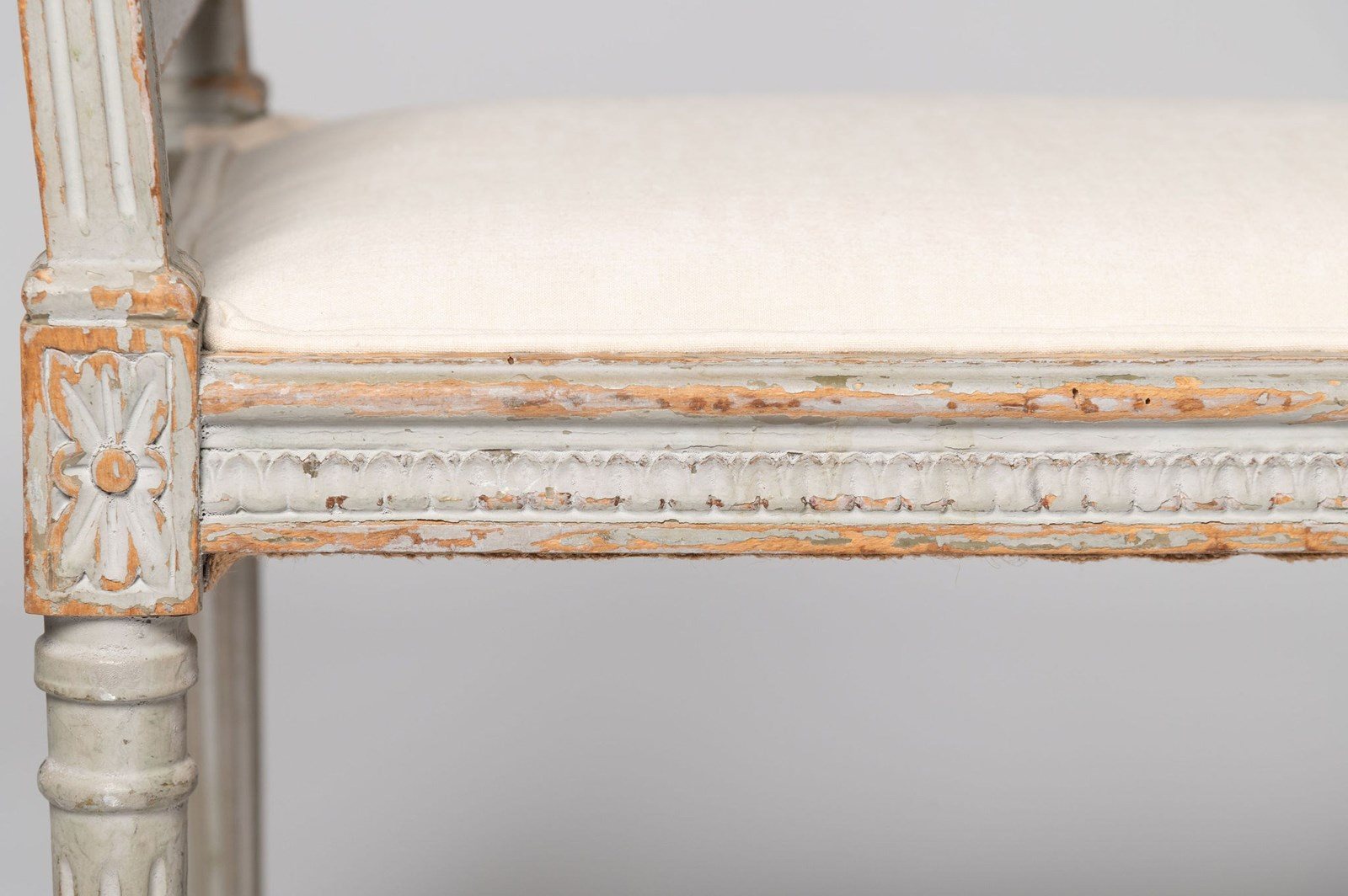 Antique French stool, original paint, recently upholstered in antique French linen. Seat height 16.5 inches.