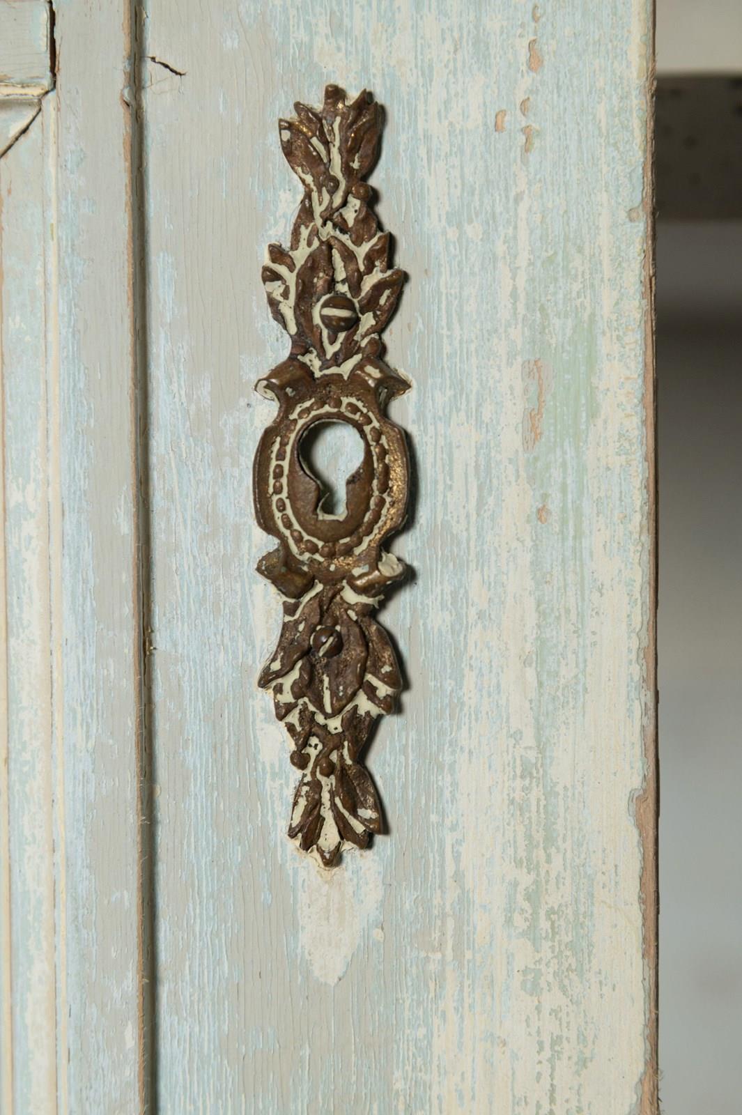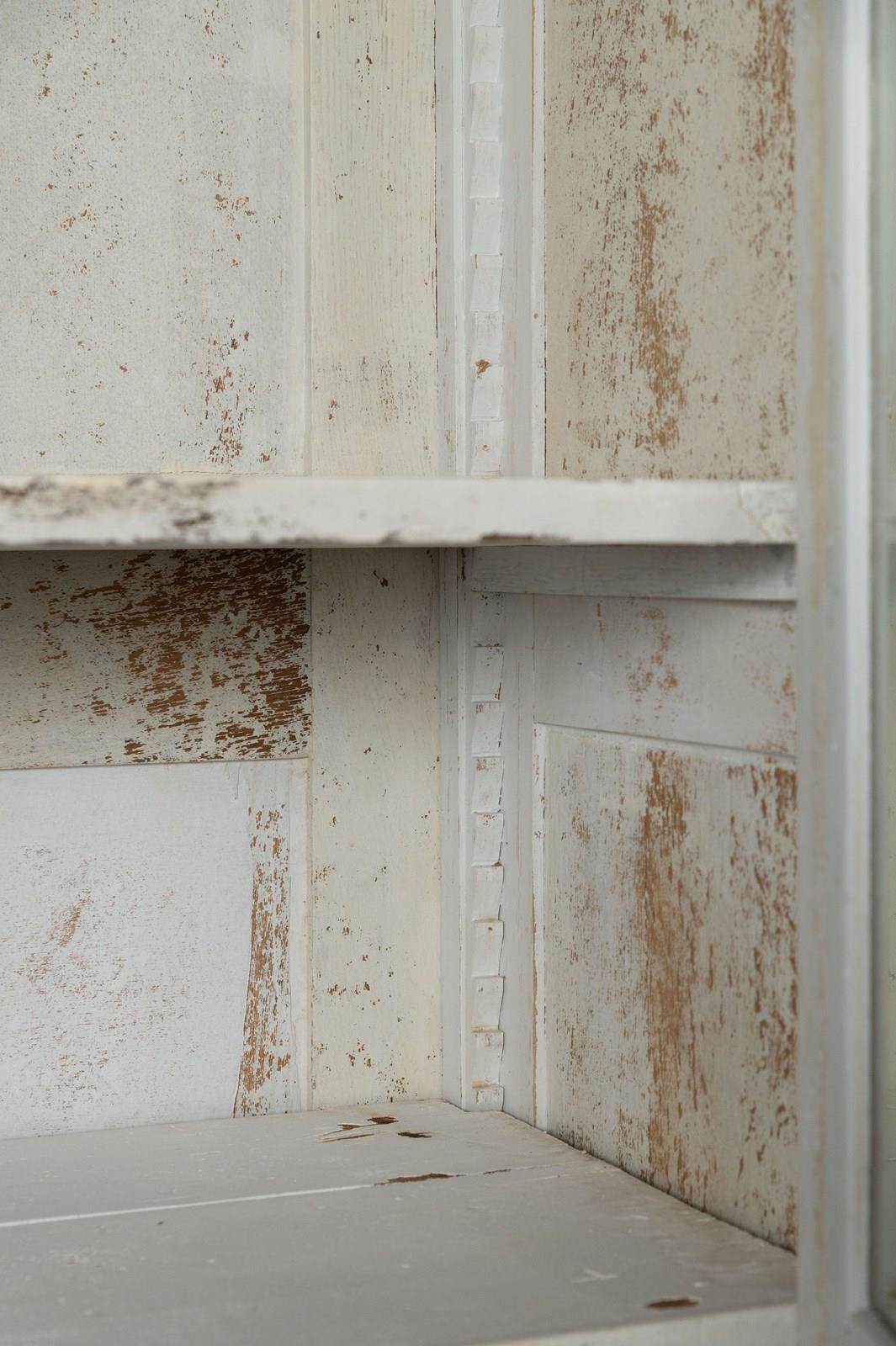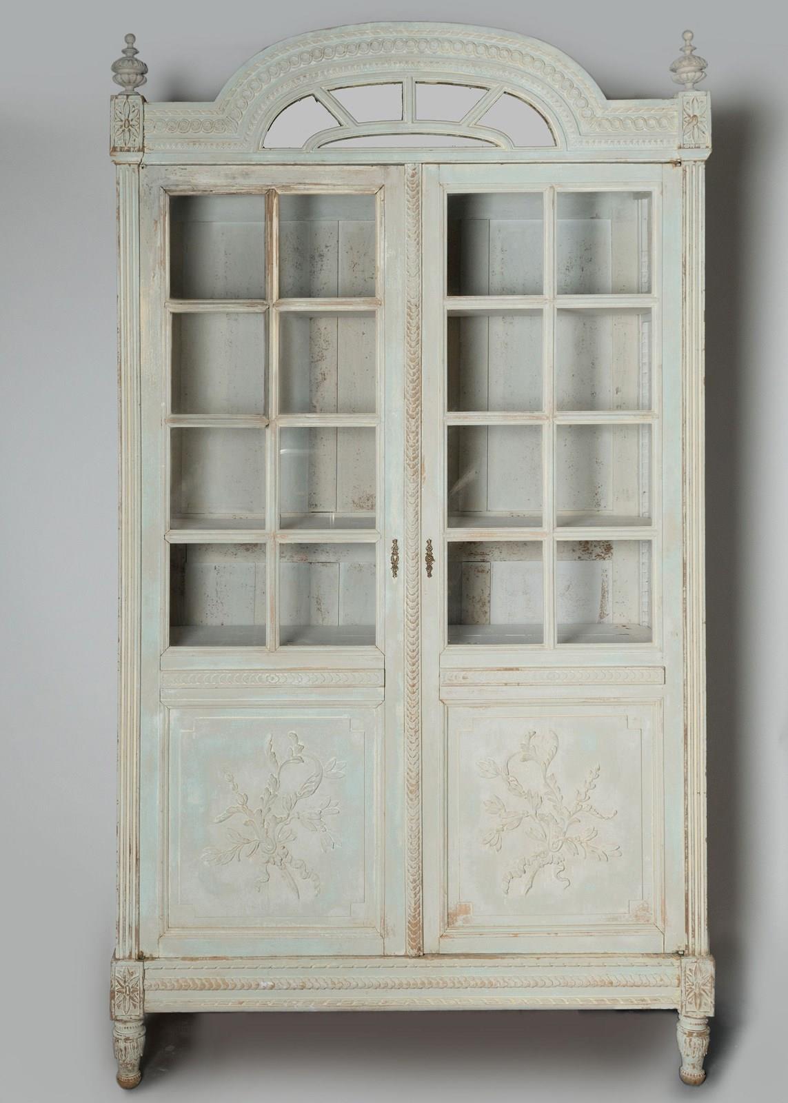 Antique French cabinet, original paint, later paint inside, glazed doors, the top has the original mirror panels, working lock and key. The shelves can be adjusted to any height.The cabinet completely flat packs and can be easily built in situ. (I have dismantled and built this with one other person myself) Top section, two finals, back panel, two side panels, a base, two doors, 3 adjustable shelves, 4 original screw fixing.