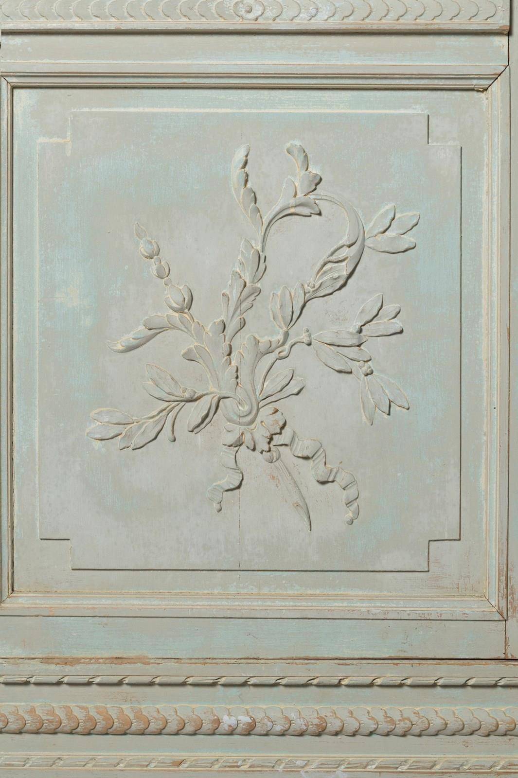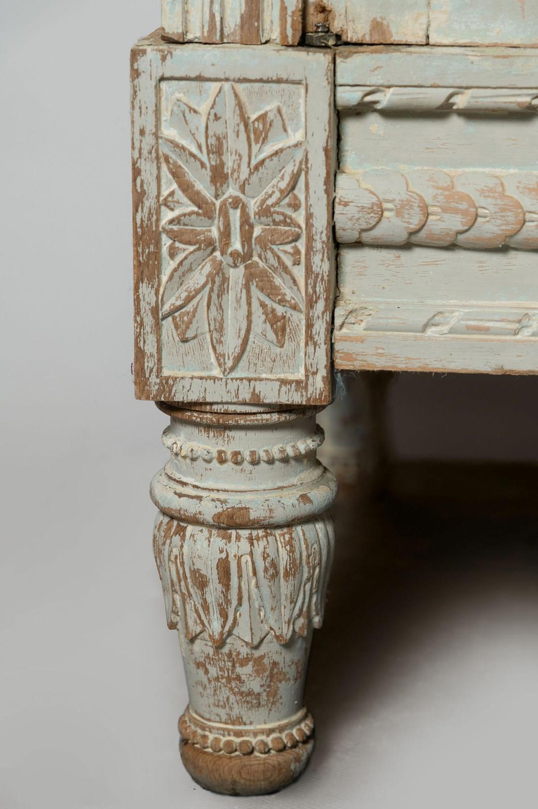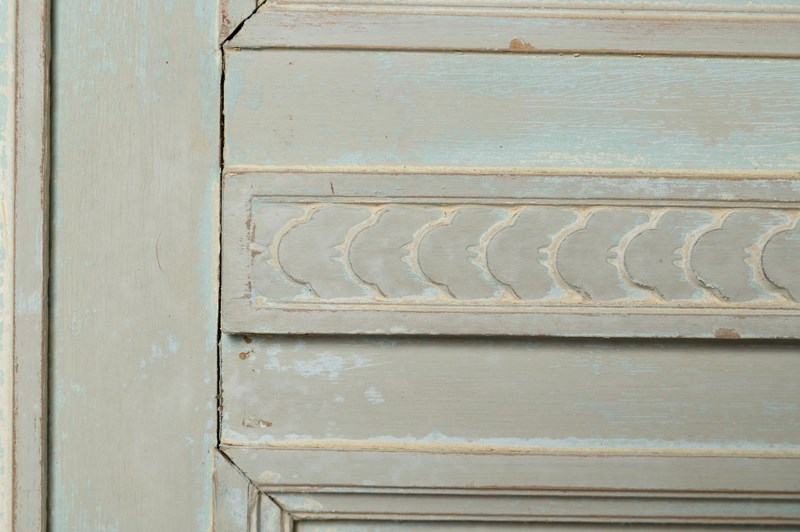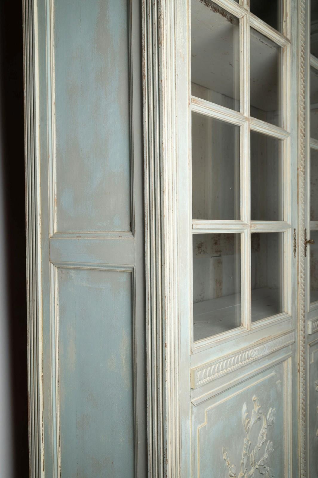 Antique French cabinet, original paint, later paint inside, glazed doors, the top has the original mirror panels, working lock and key. The shelves can be adjusted to any height.The cabinet completely flat packs and can be easily built in situ. (I have dismantled and built this with one other person myself) Top section, two finals, back panel, two side panels, a base, two doors, 3 adjustable shelves, 4 original screw fixing.
