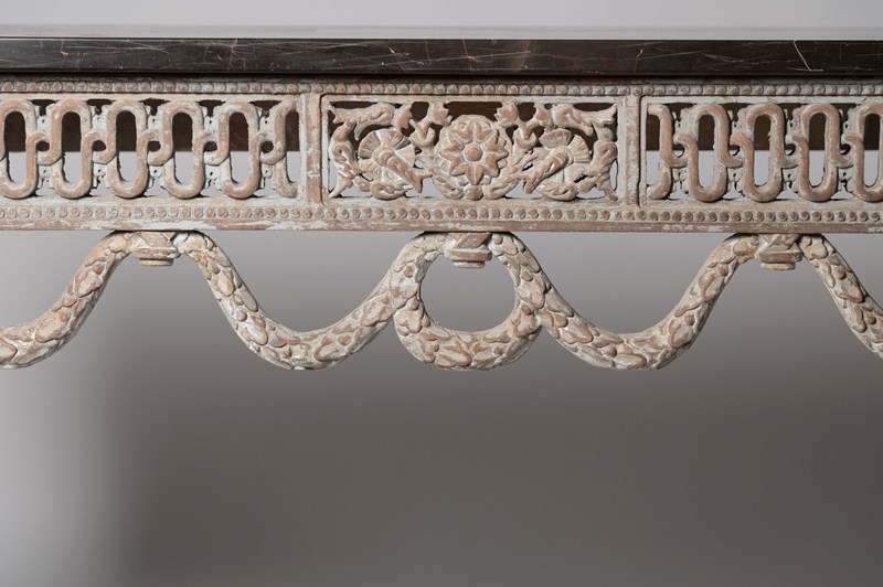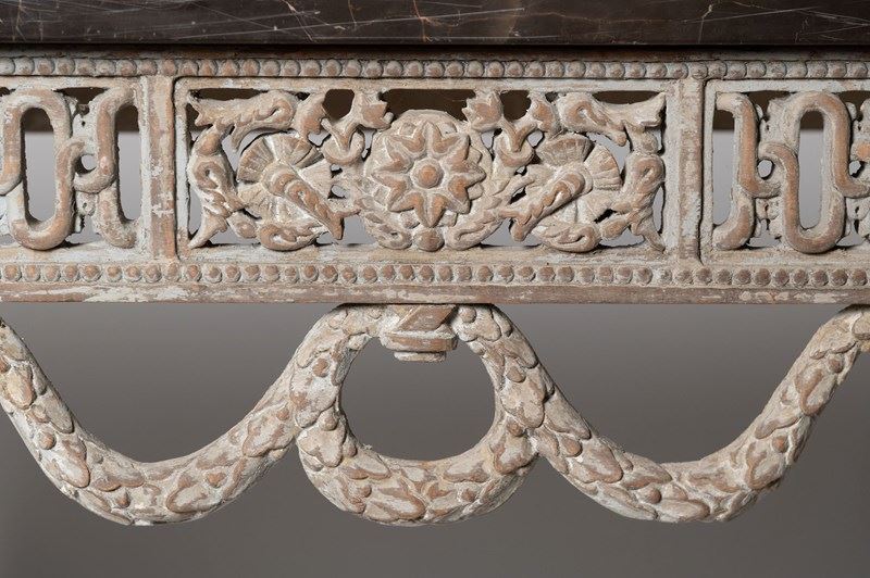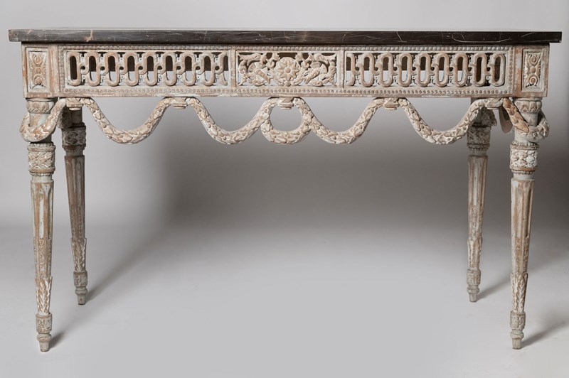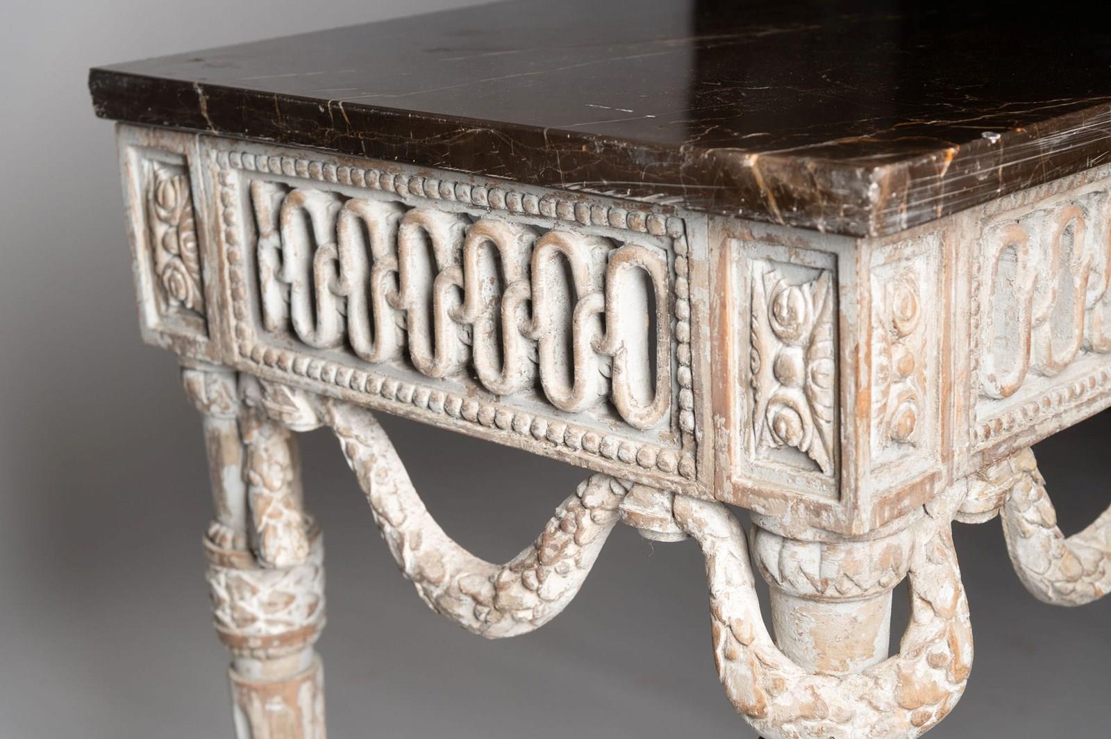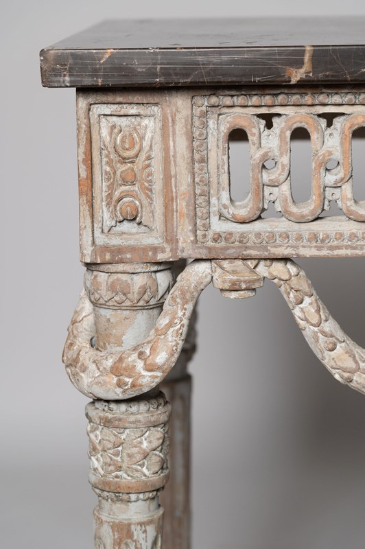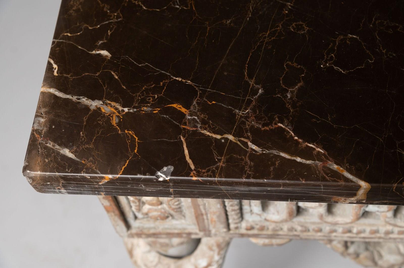 Antique French console table, wonderful carved detail to all three sides. 19th Century. Purchased in Provence. I bought them as “a pair” of tables, whilst the base is exactly the same on both tables one marble has a bevelled edge, this is not really noticeable but I have decided to sell them individually. Two tables available. £4,450 each.