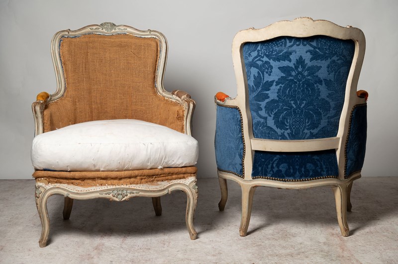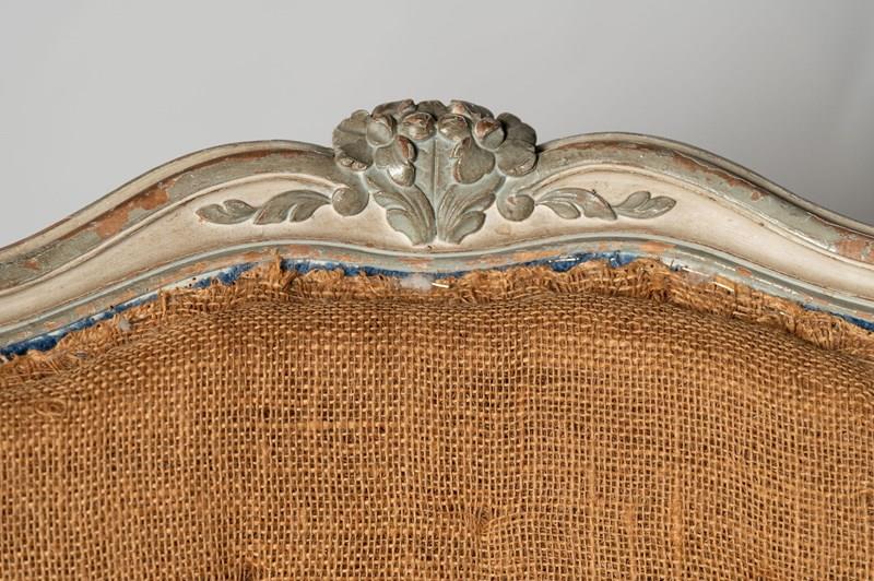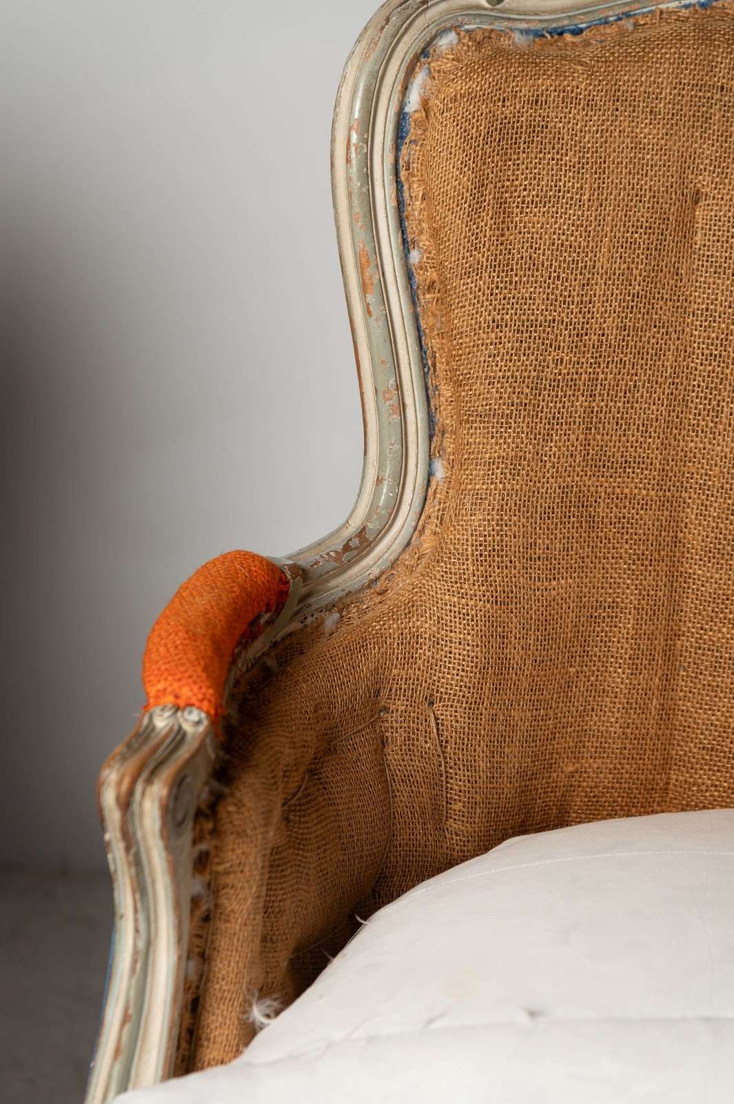 Pretty shape pair of antique French chairs, original paint. Seat depth 21 inches. Floor to seat 18 inches.