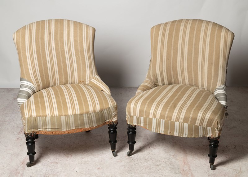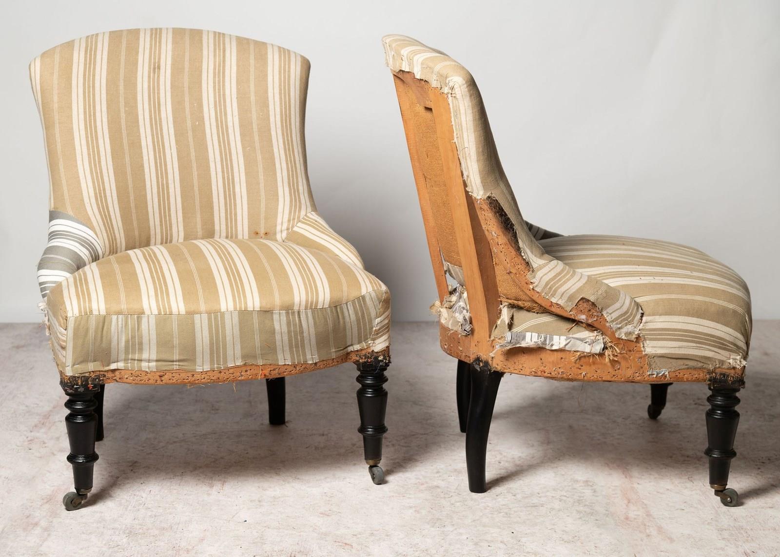 19th Century French pair of chairs, ideal fireside, bedroom or occasional chairs. Seat depth 18 inches.