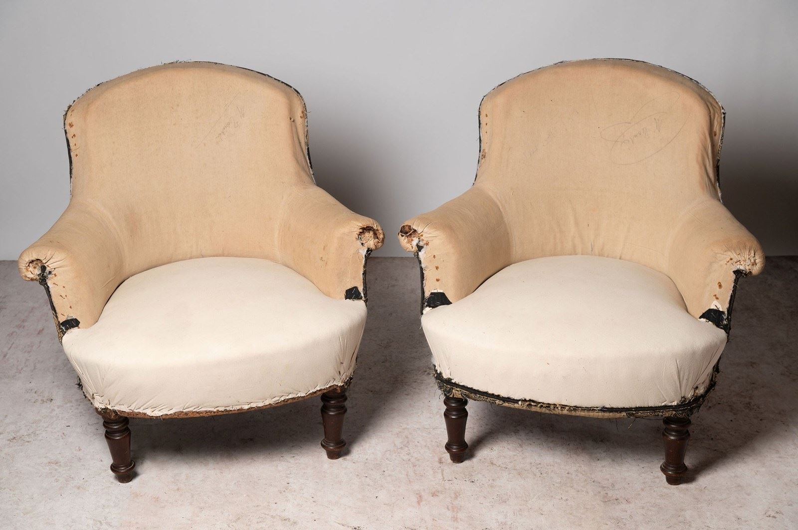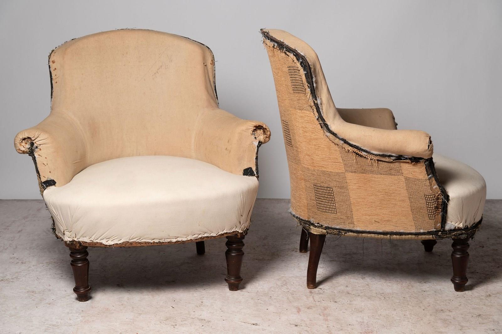 Antique French pair of chairs. Seat depth 21 inches.