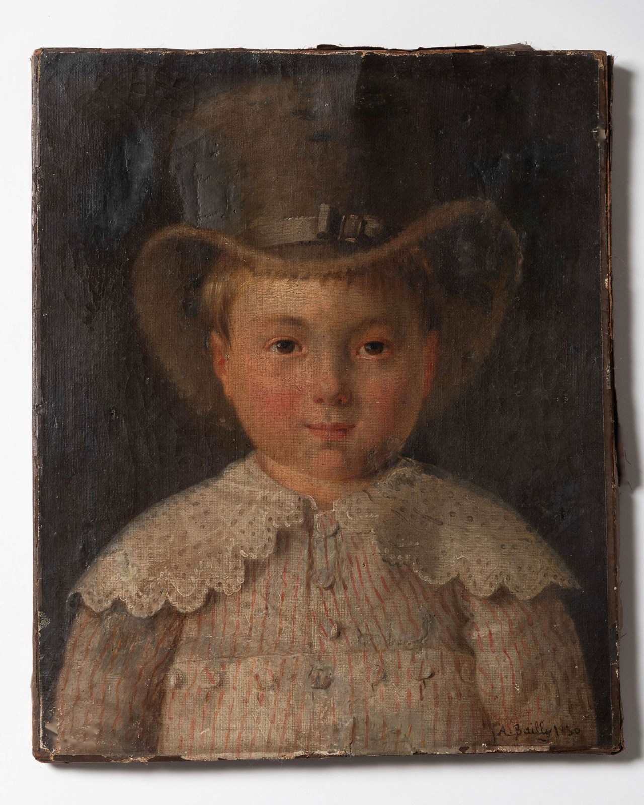 Early 19th Century signed oil on canvas. Dated 1830. I can only imagine that this little boy was from a very wealthy family to have his own top hat in this period. Age related wear, restoration patches over the years, all adding to the honesty of this painting that is nearly 200 years old.