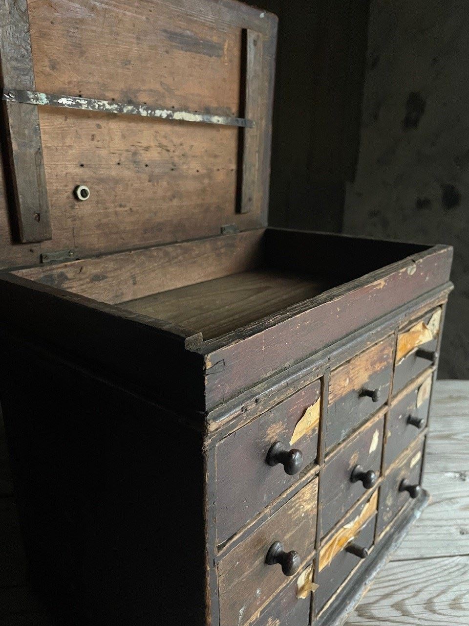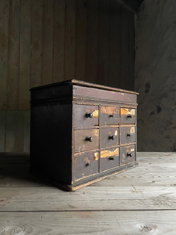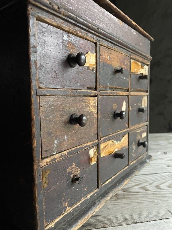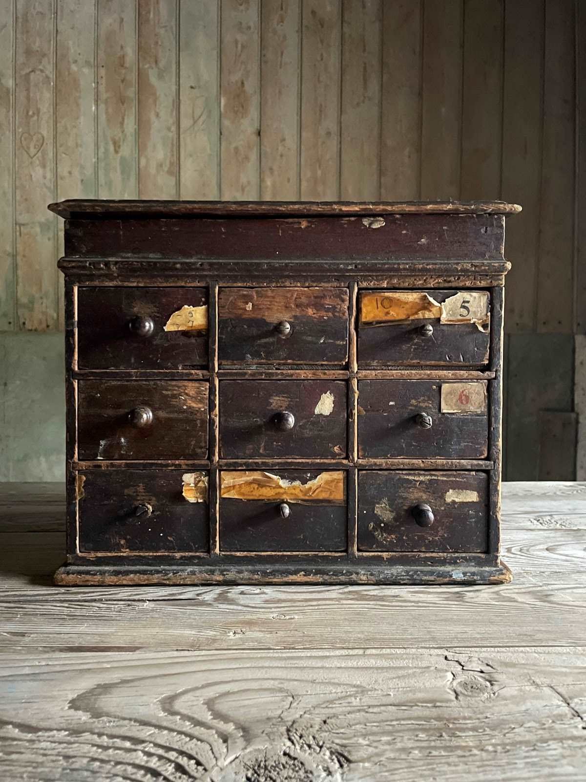 A charming table top bank of workshop drawers in original dark red stain with remnants of old labels.