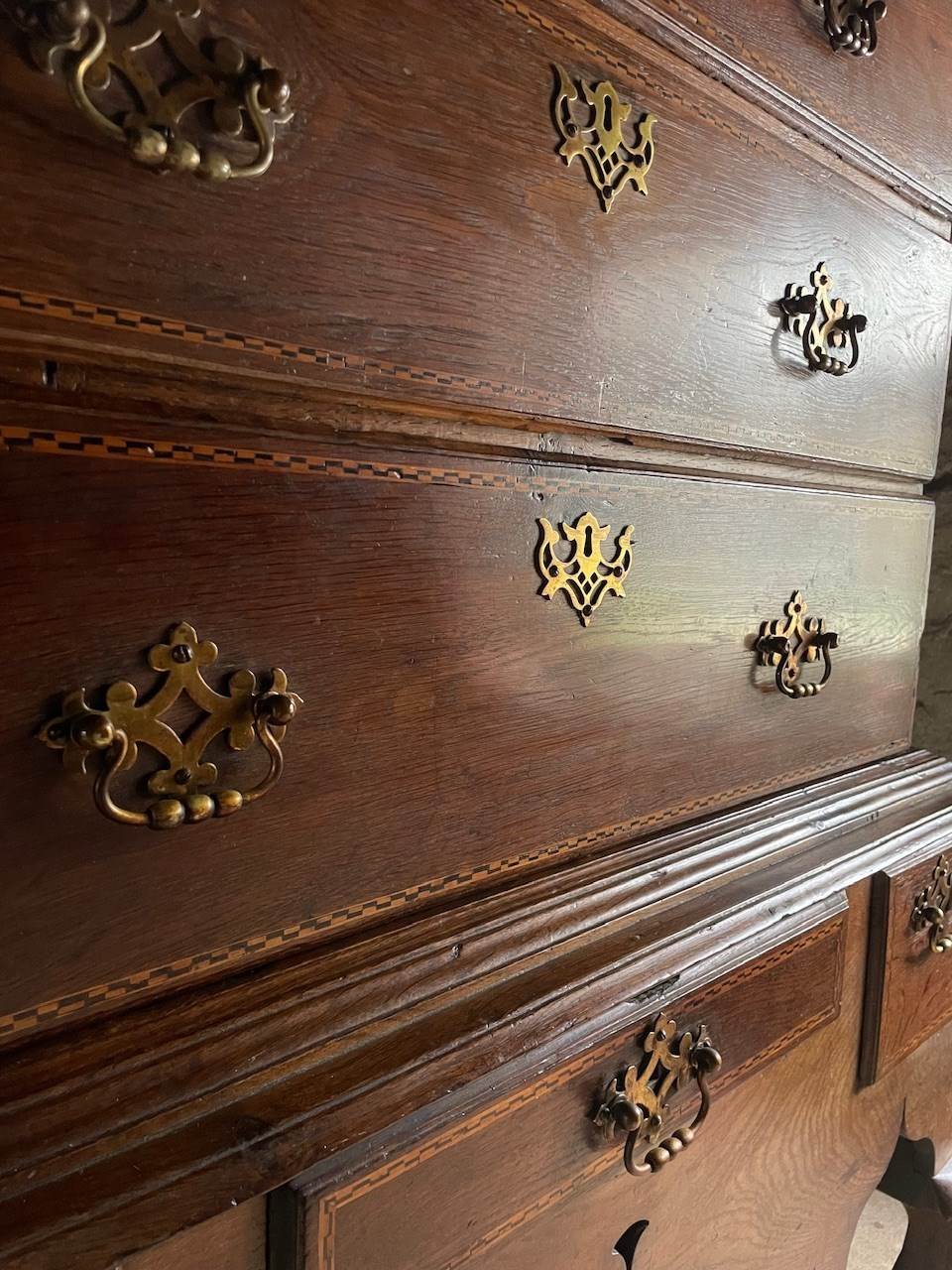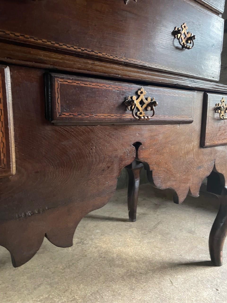 It is elevated with decorative inlaid cross banding of bog oak and holly, a decorative shaped apron and also has a really rather wonderful secret drawer.
