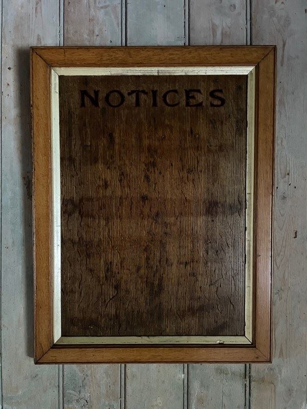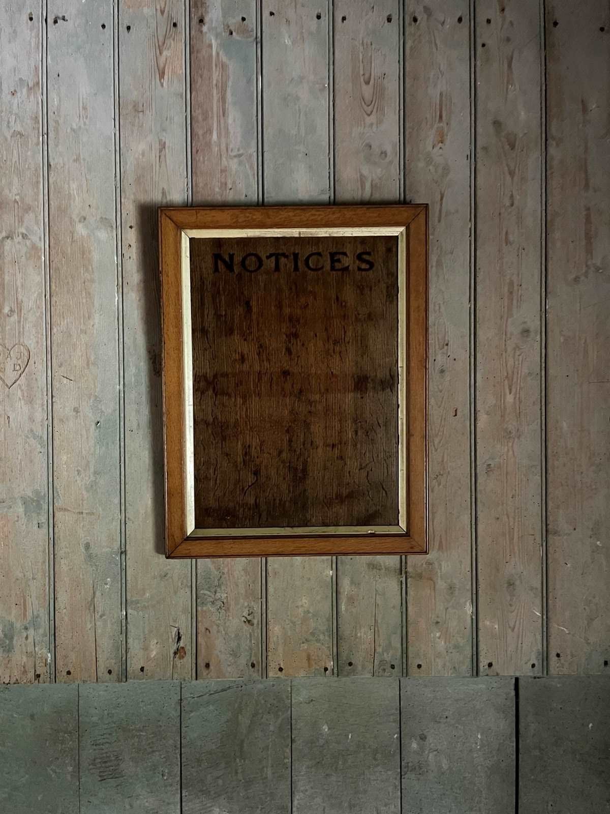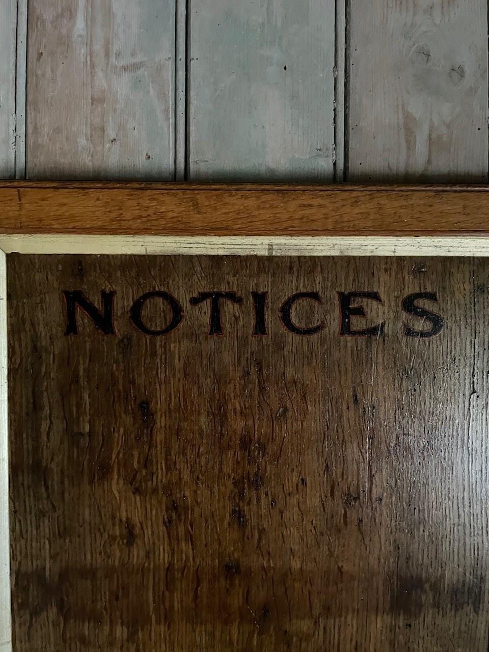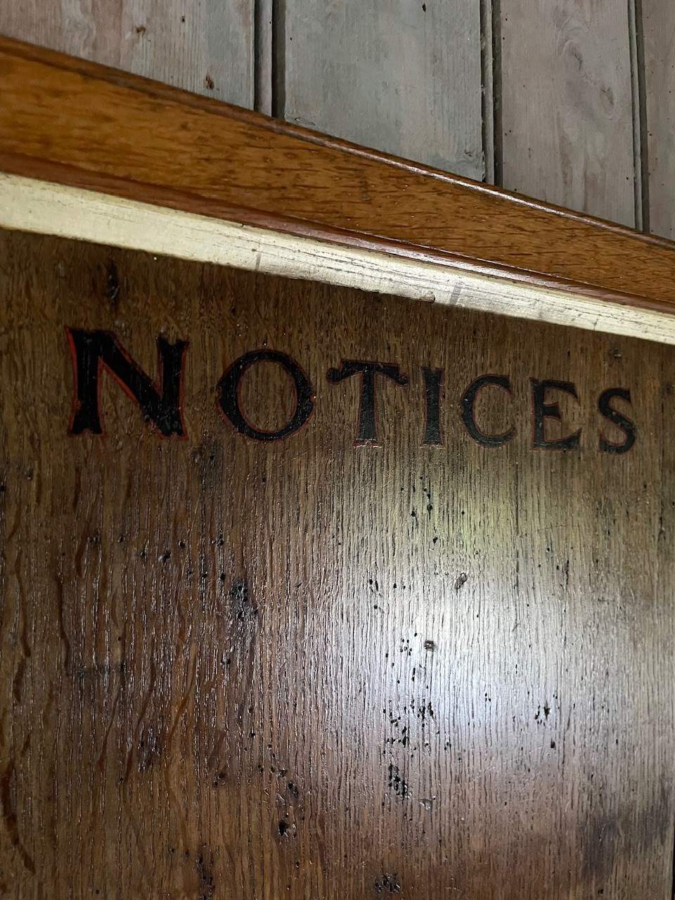 A useful late C19th chapel noticeboard in oak with gilt and hand painted decoration.