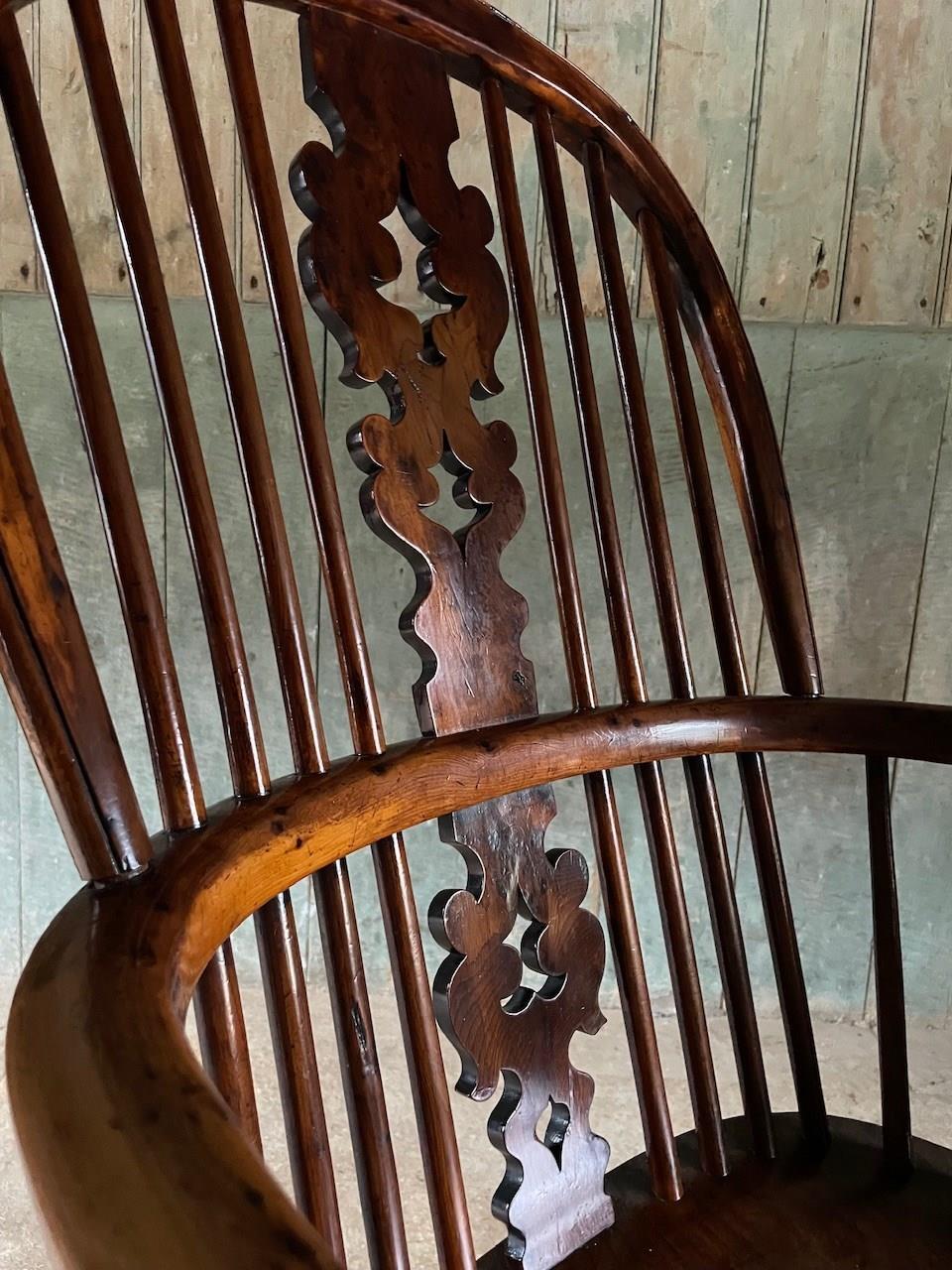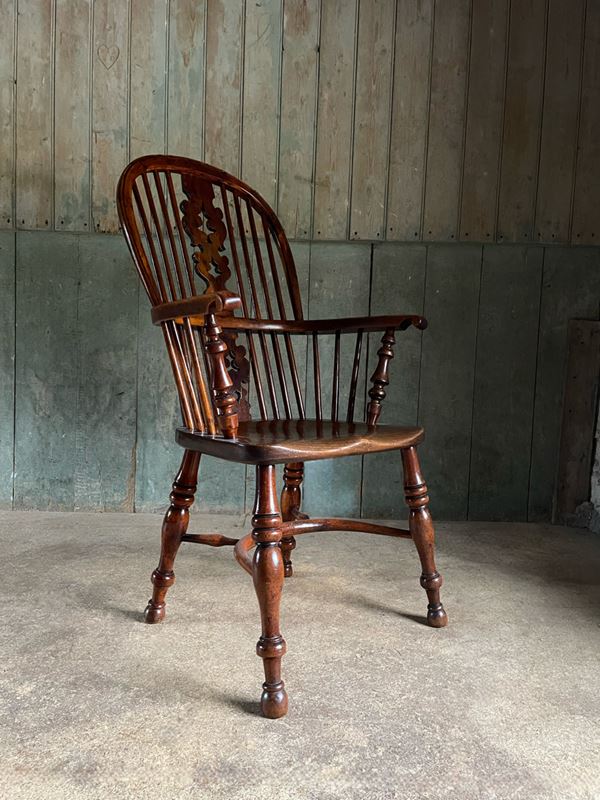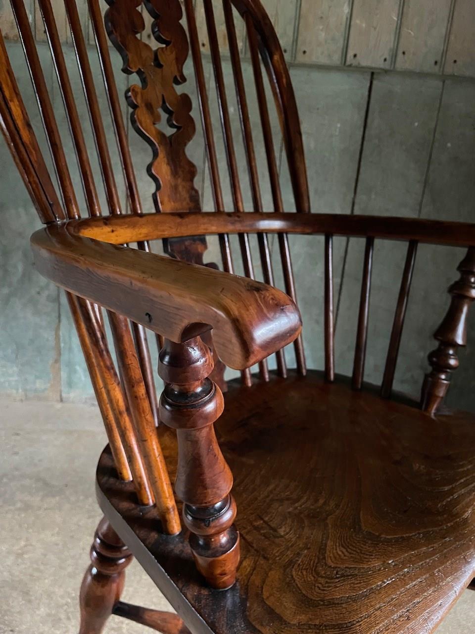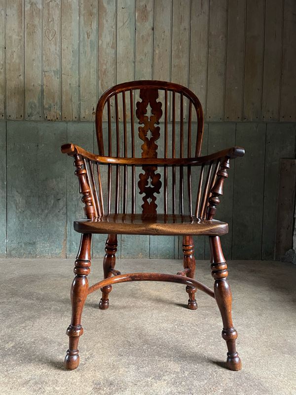 A fine, C19th, decorative splat back Windsor armchair in yew wood with elm seat.
