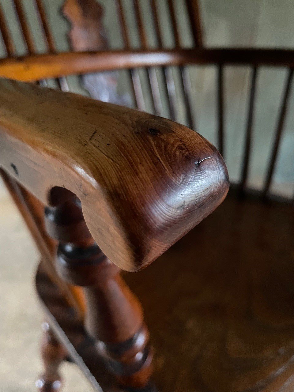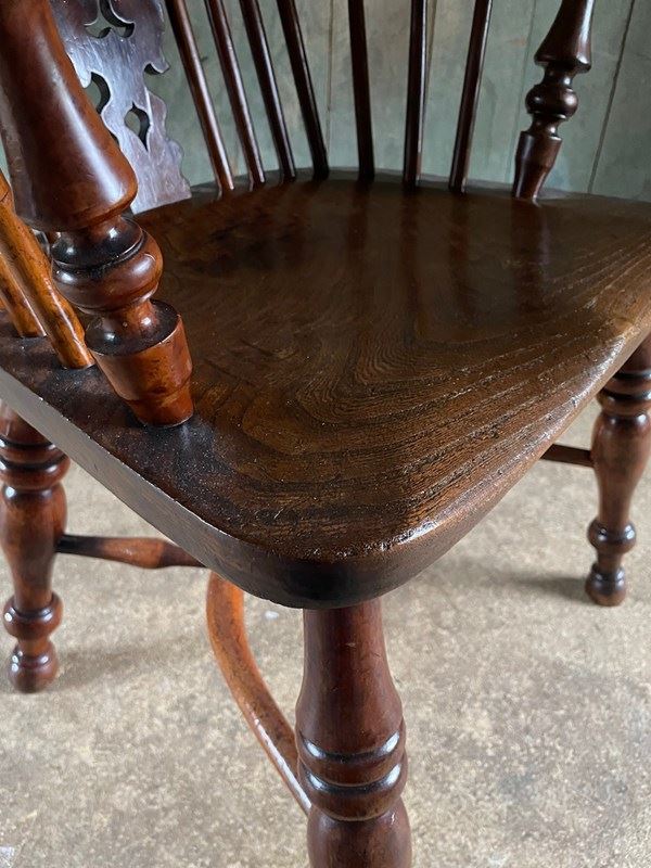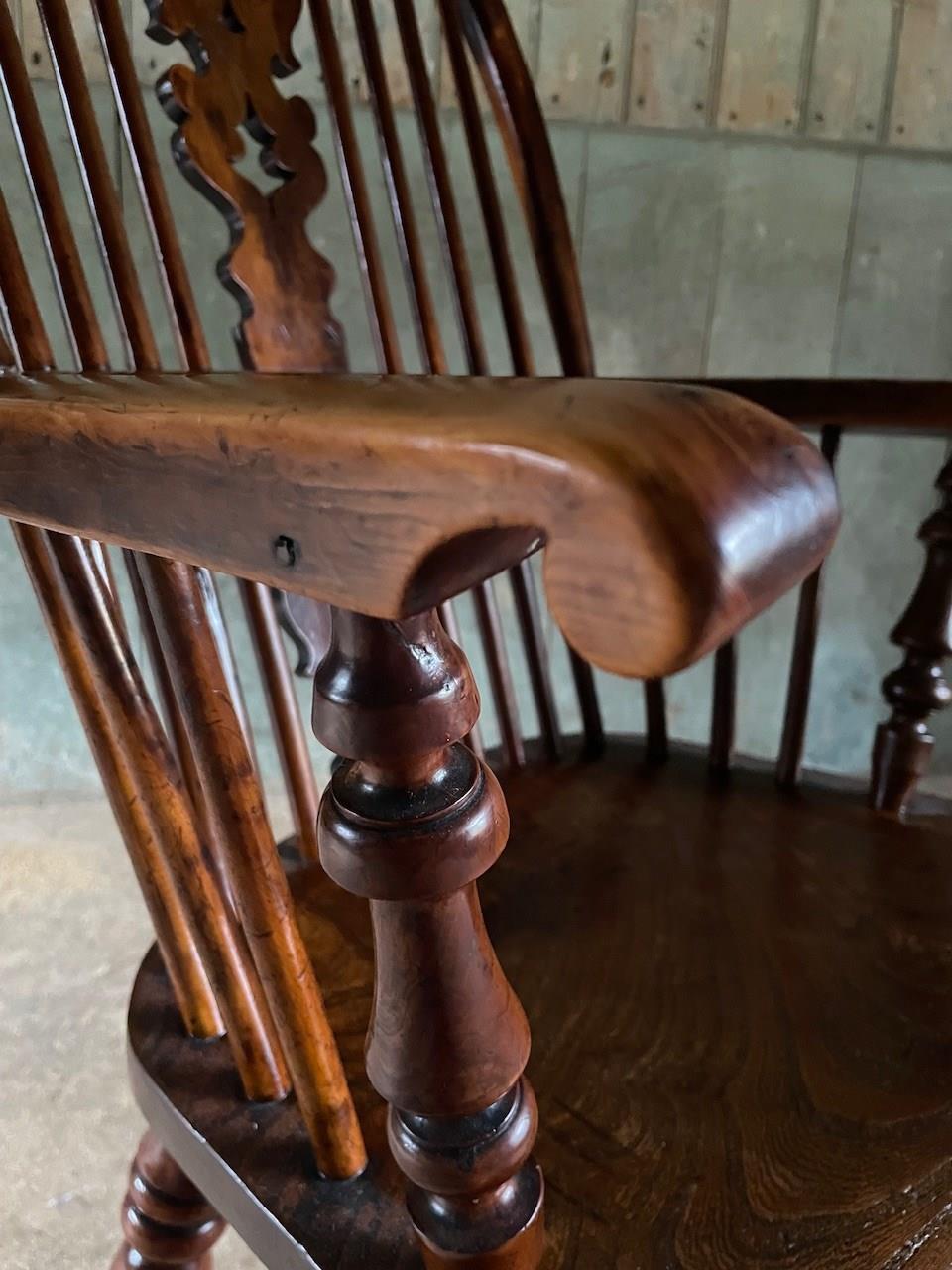 A fine, C19th, decorative splat back Windsor armchair in yew wood with elm seat.