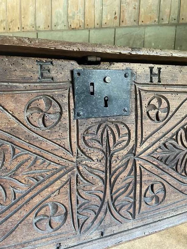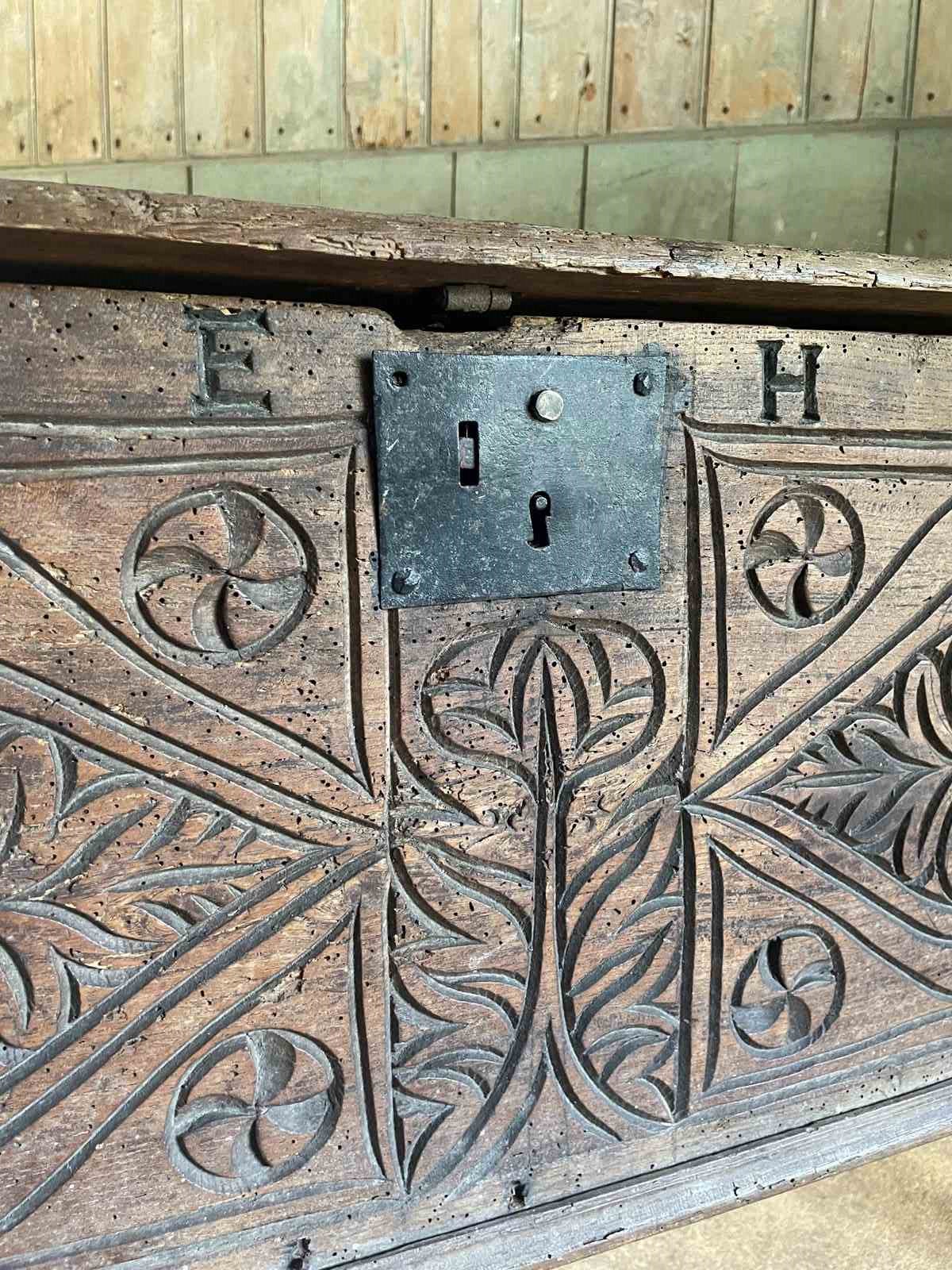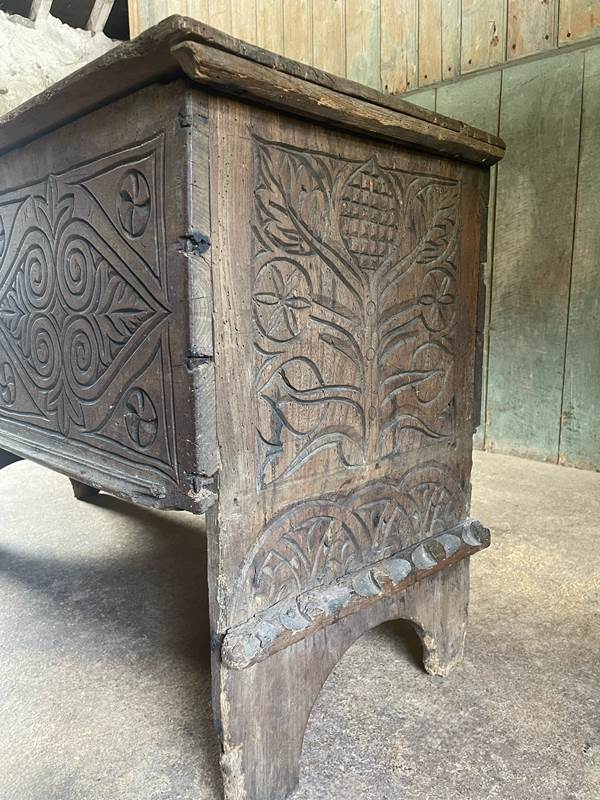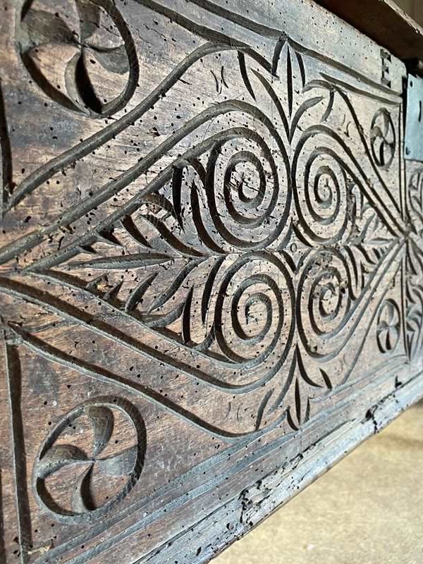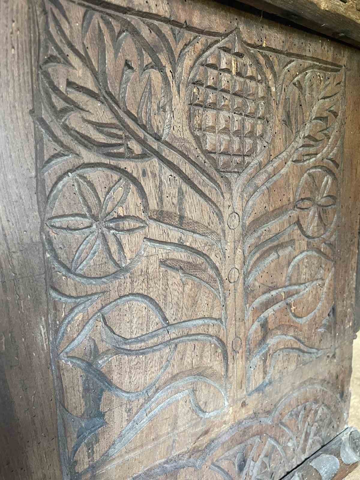 A beautiful, Elizabeth I period plank chest, carved with foliate, lunette and pin wheel motifs and tree of life design to both ends.