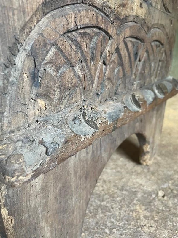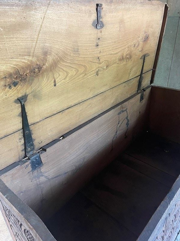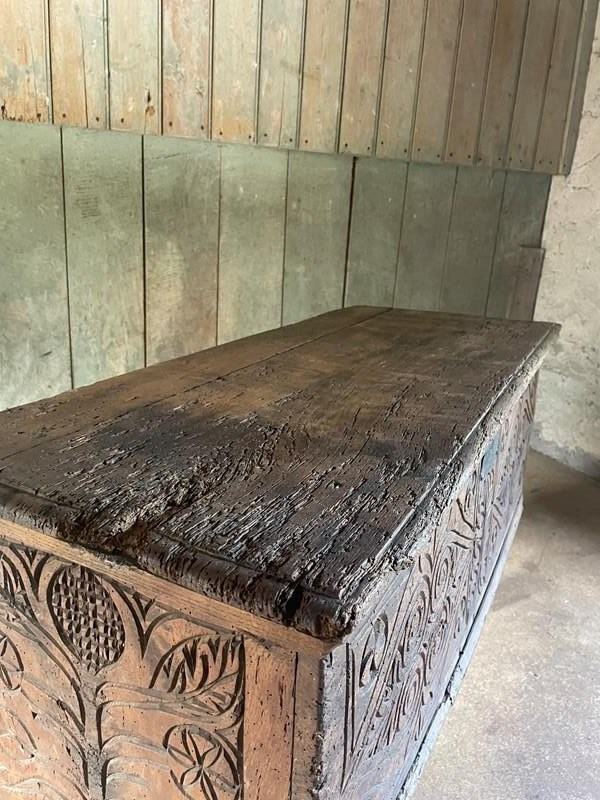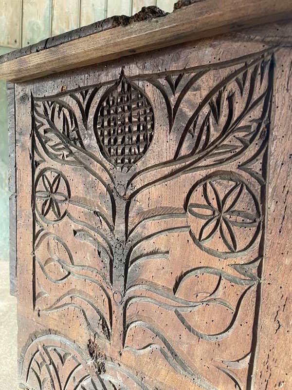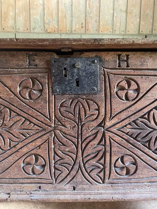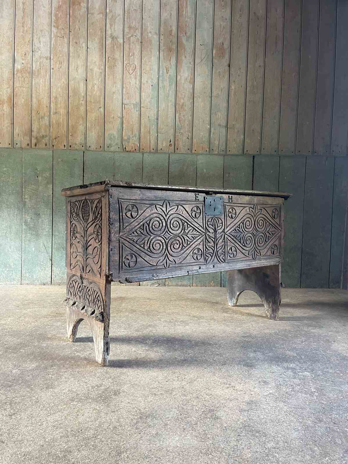 A beautiful, Elizabeth I period plank chest, carved with foliate, lunette and pin wheel motifs and tree of life design to both ends.