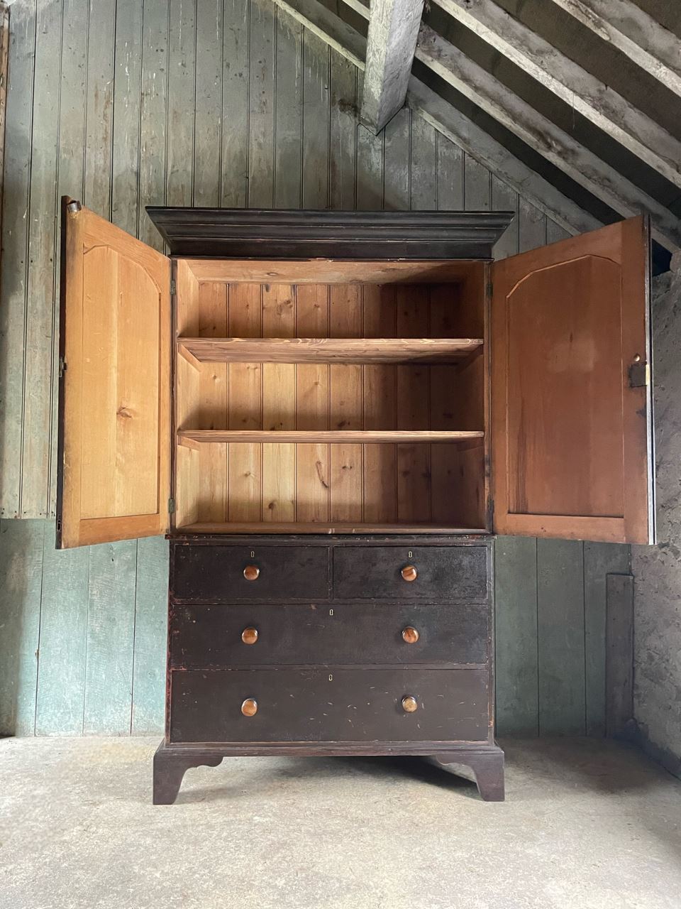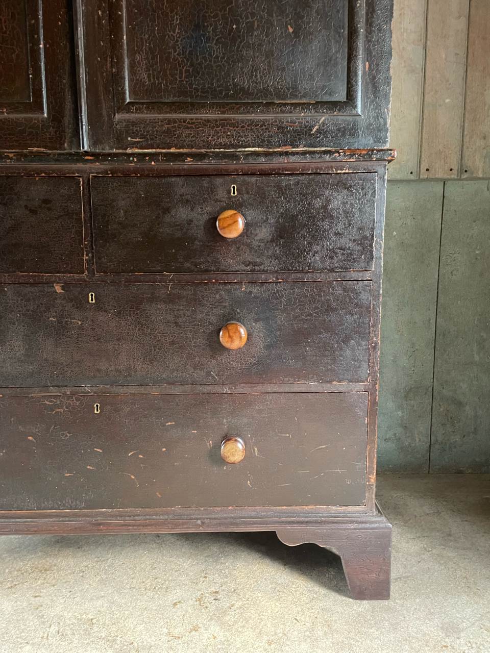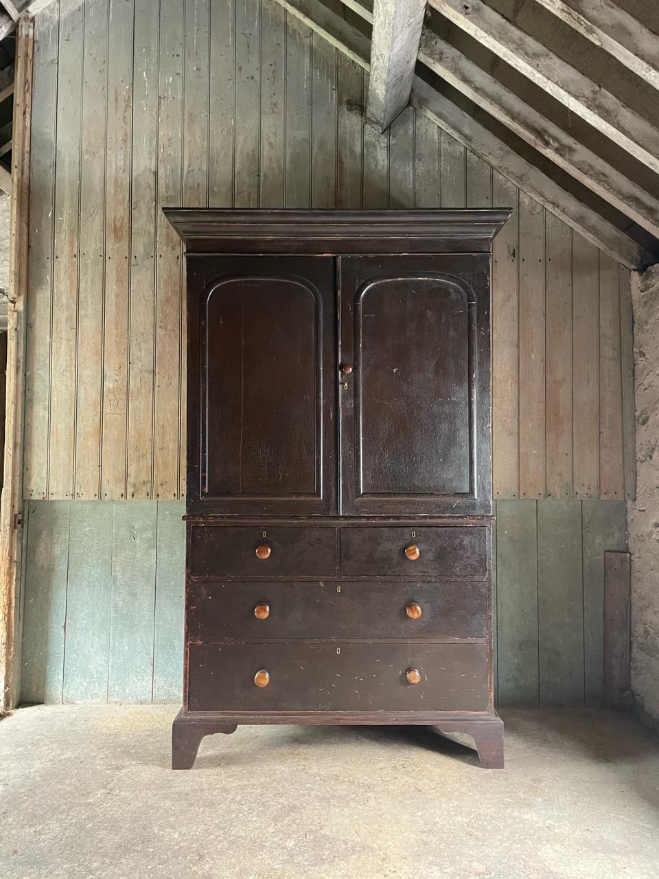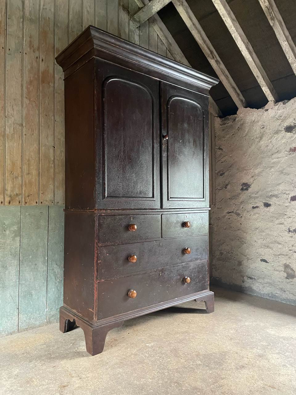 Upper section with arched panel doors and shelved interior, above a bank of four wide, deep drawers with attractive fruitwood knob handles, the whole raised on bracket feet.