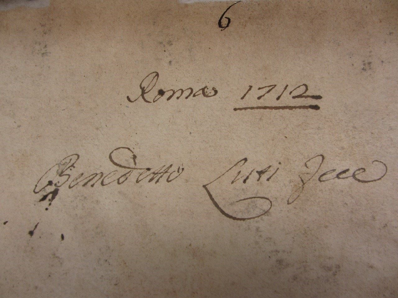 Presented, under glass, in their period carved and gilded frames (wear commensurate with age). Both are inscribed to the original backboards, with corresponding numbers (‘5’ and ‘6’) to both the backboards and the reverse of the pictures themselves. One of the studies signed also to the reverse in iron gall ink ‘Roma 1712 Benedetto Luti fece’.
