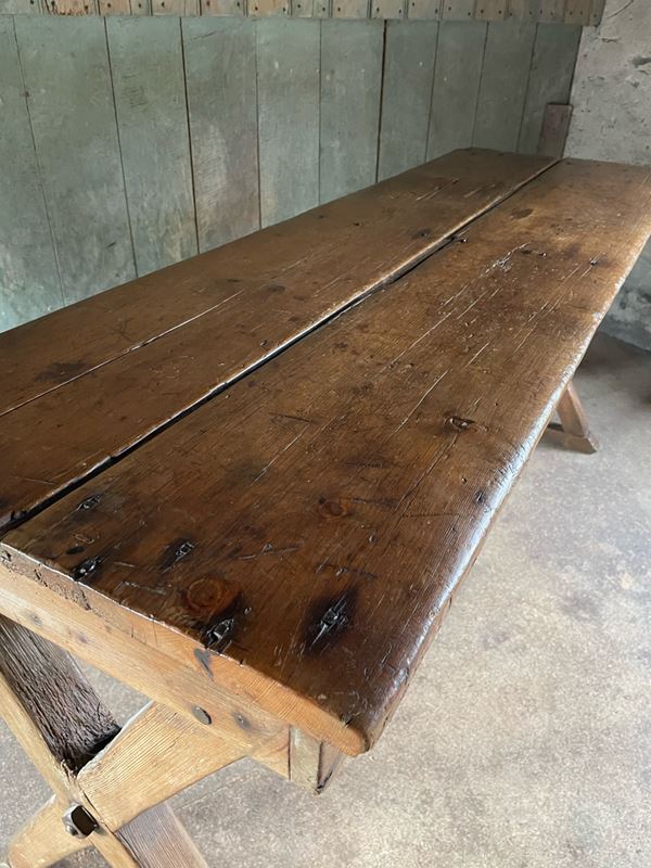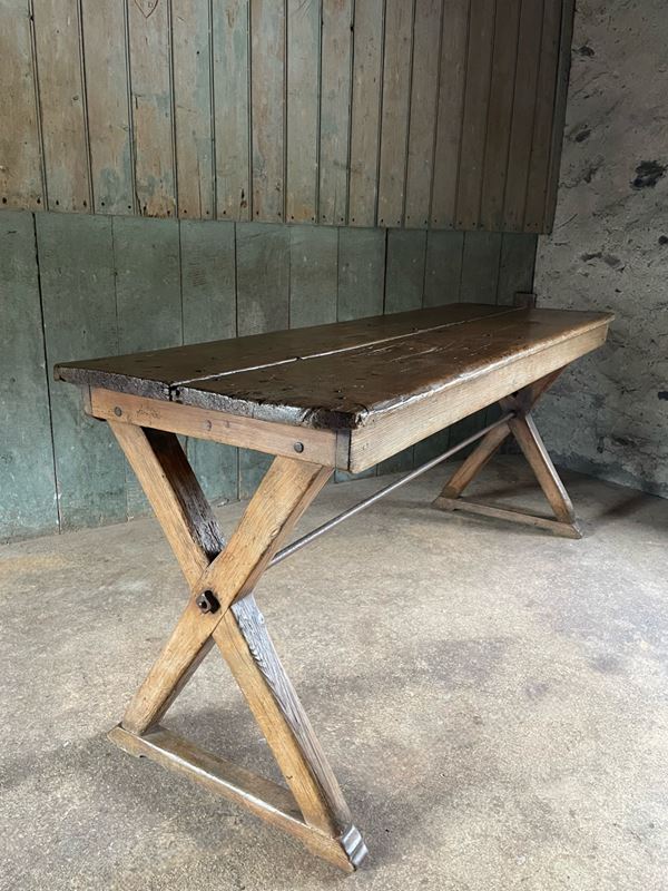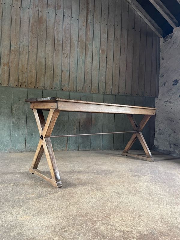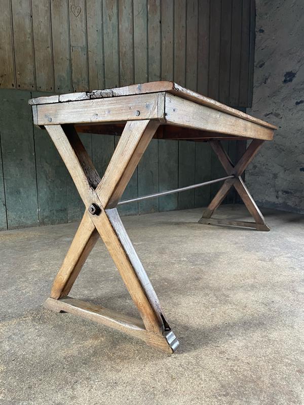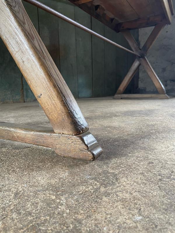 A good size, C19th, x-frame tavern table in pine with iron stretcher and, unusually, sledge feet.