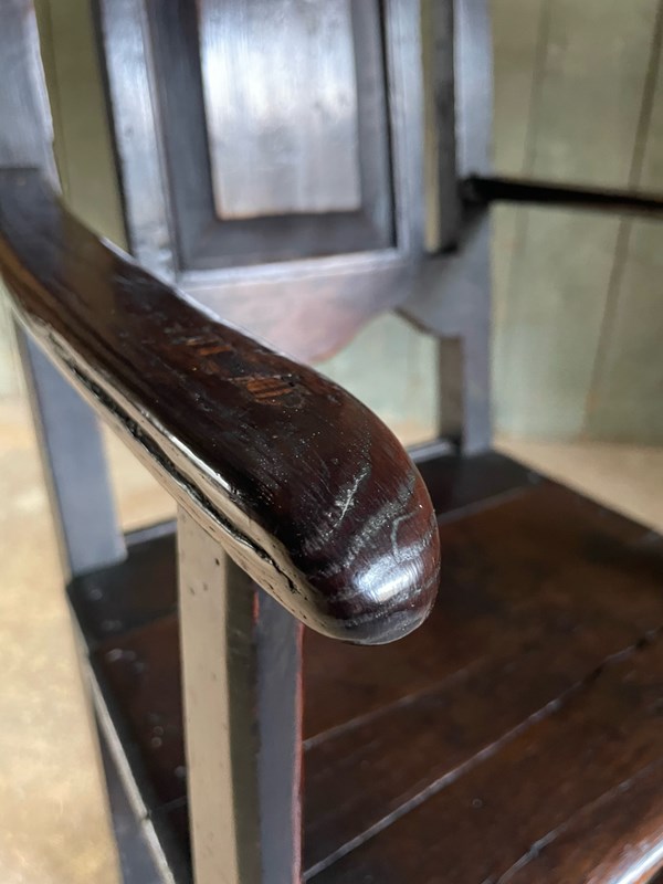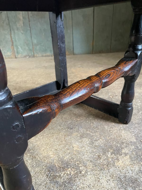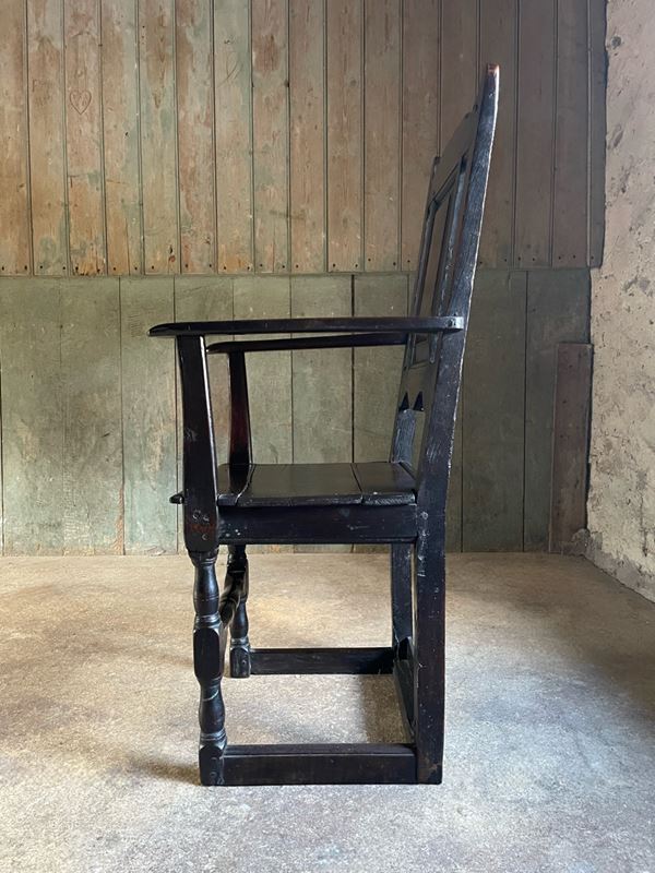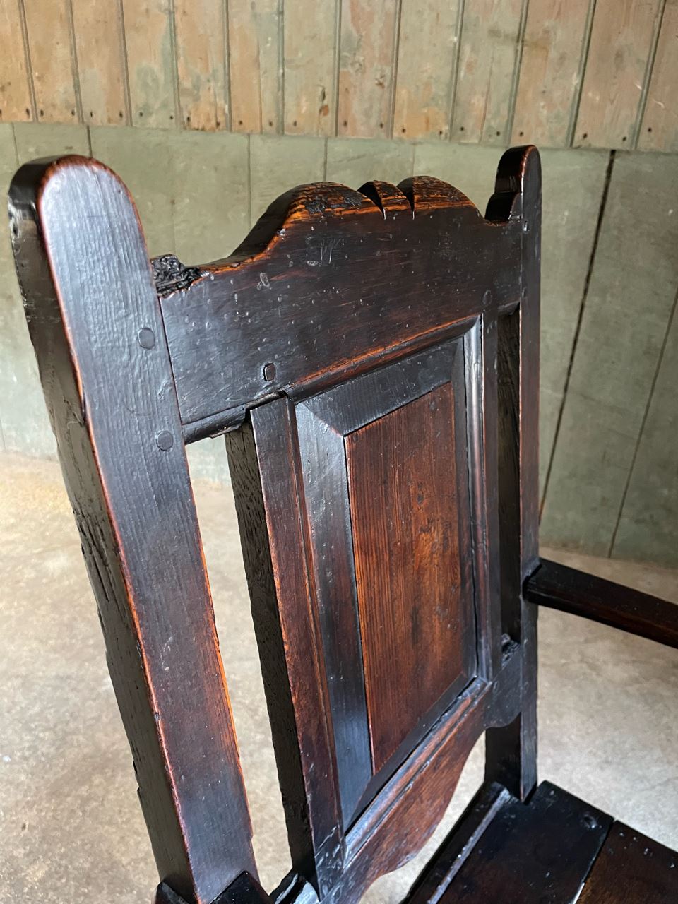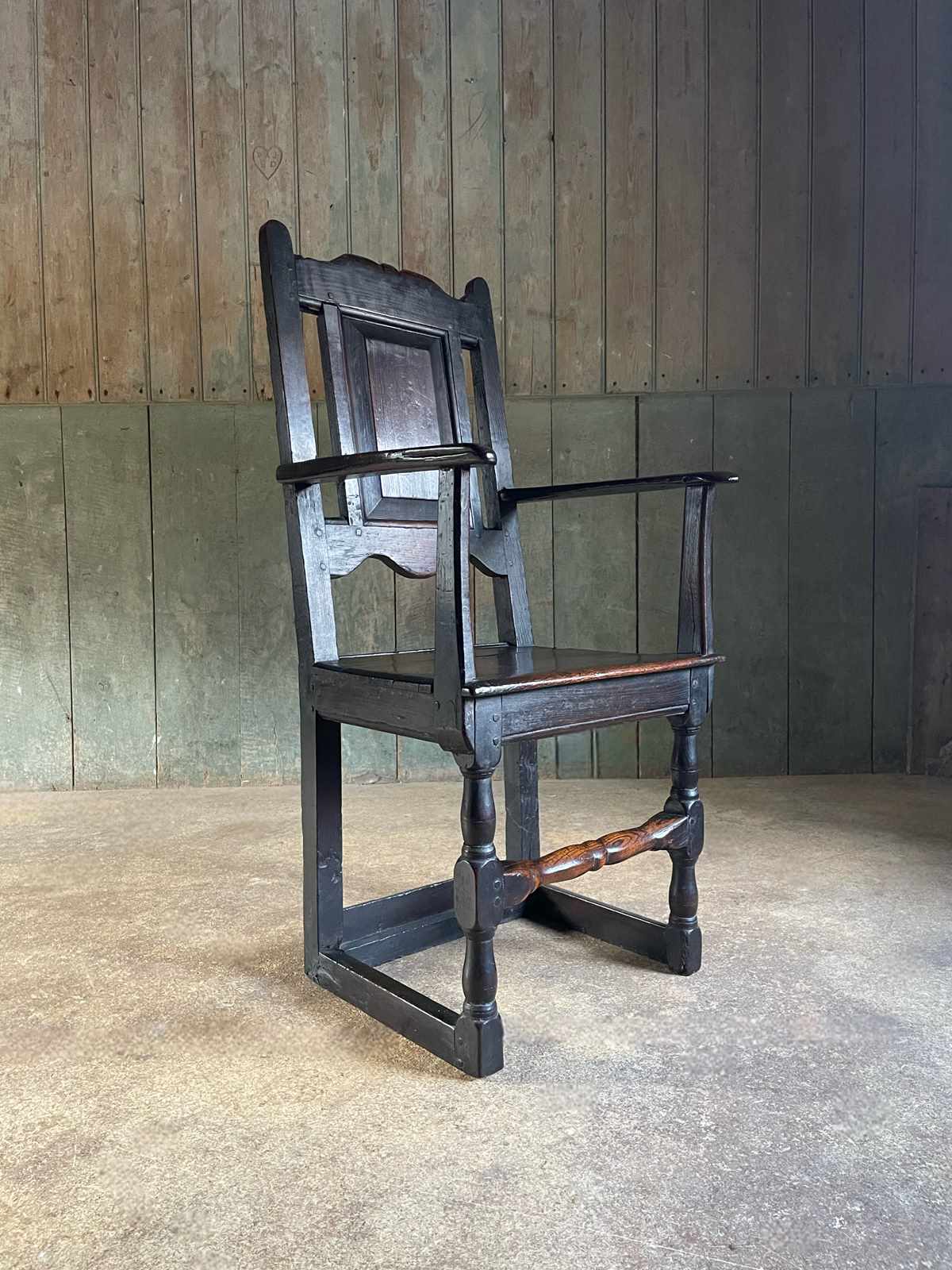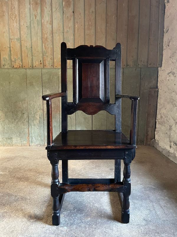 A late C17th transitional joined oak open armchair with the panelled back typical of earlier Wainscot chairs.