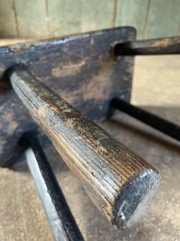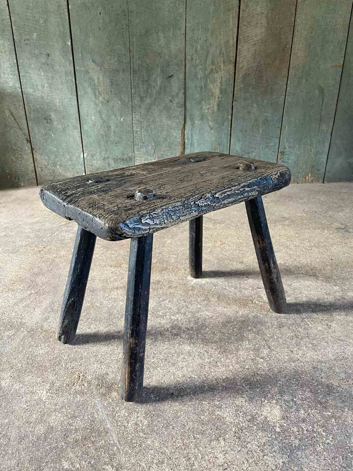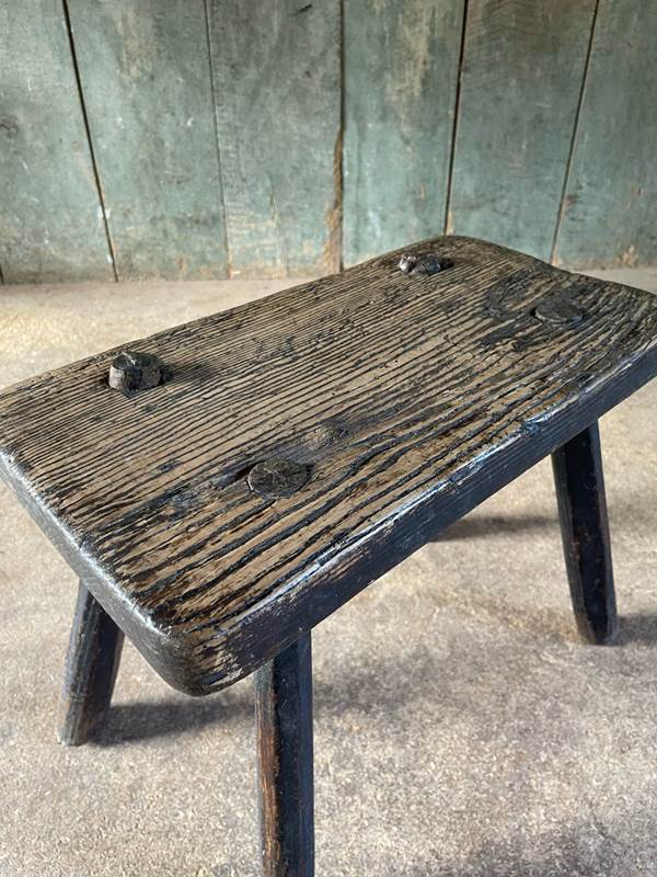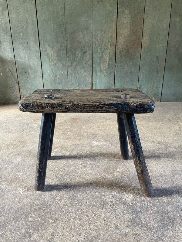 An early C19th elm stool with ash legs, retaining much of its original painted finish.