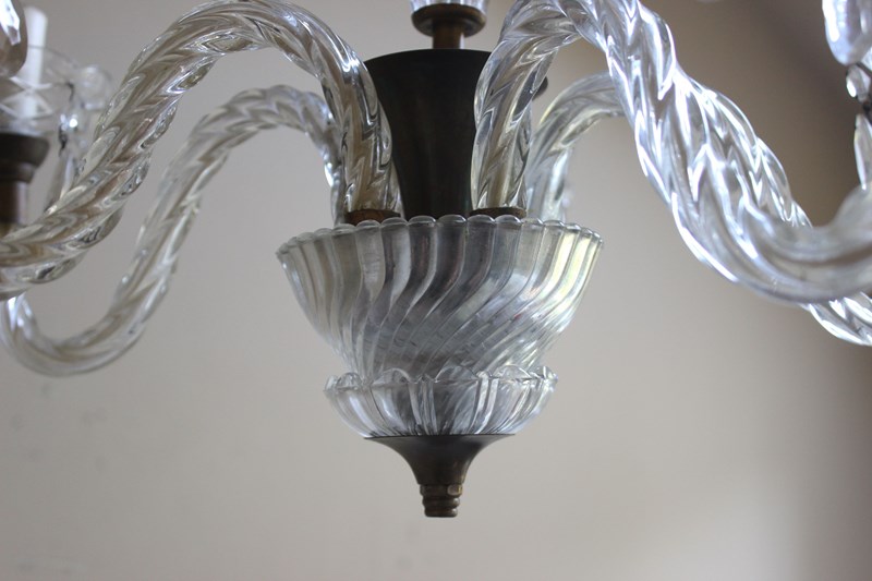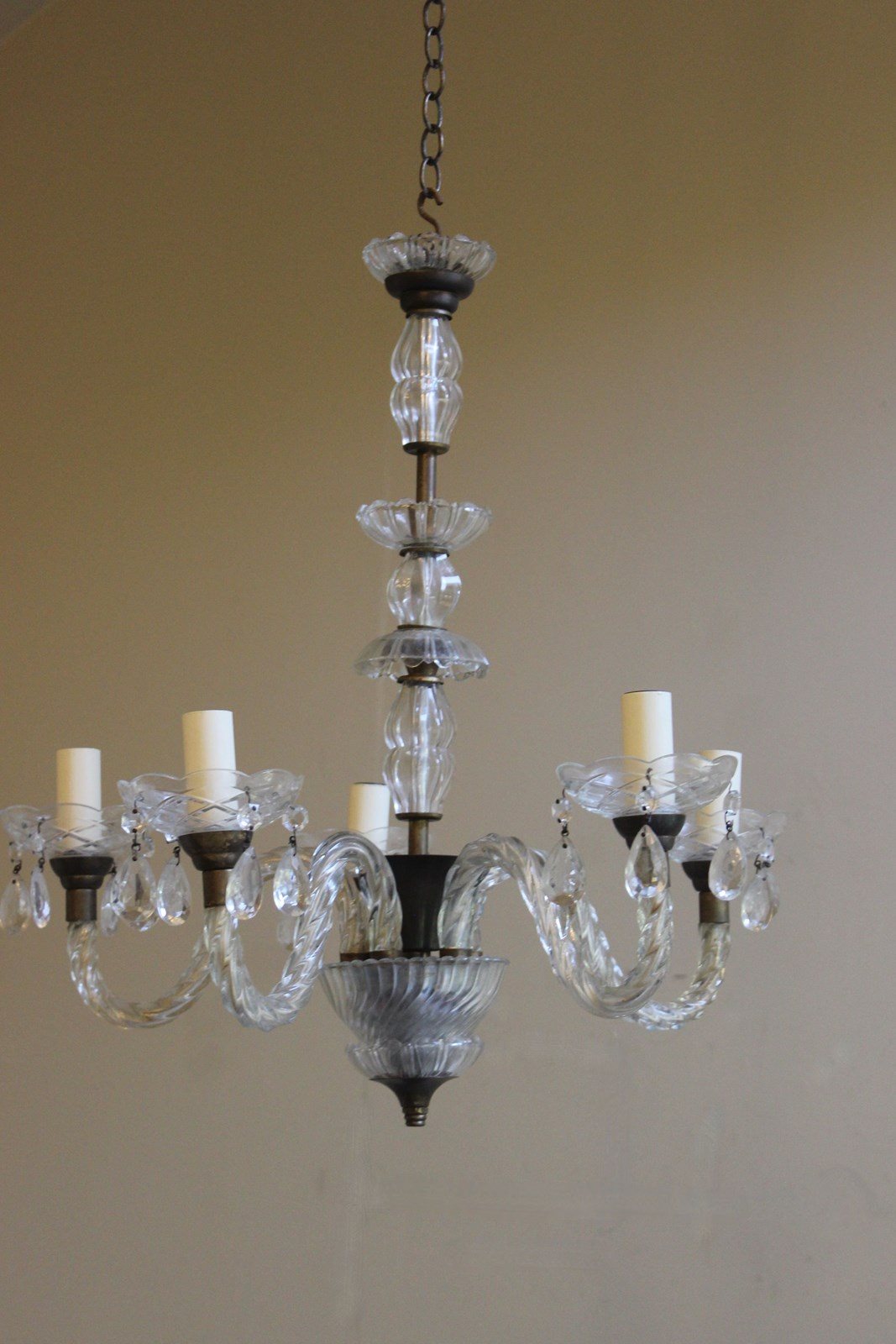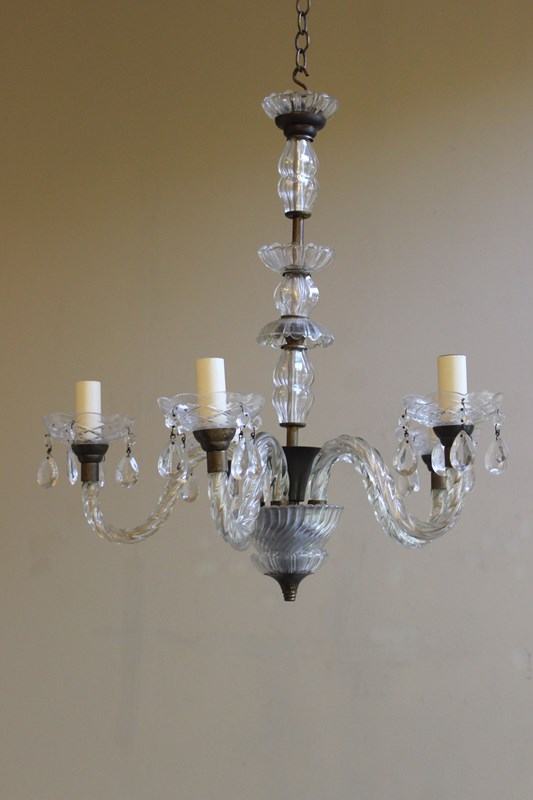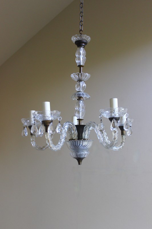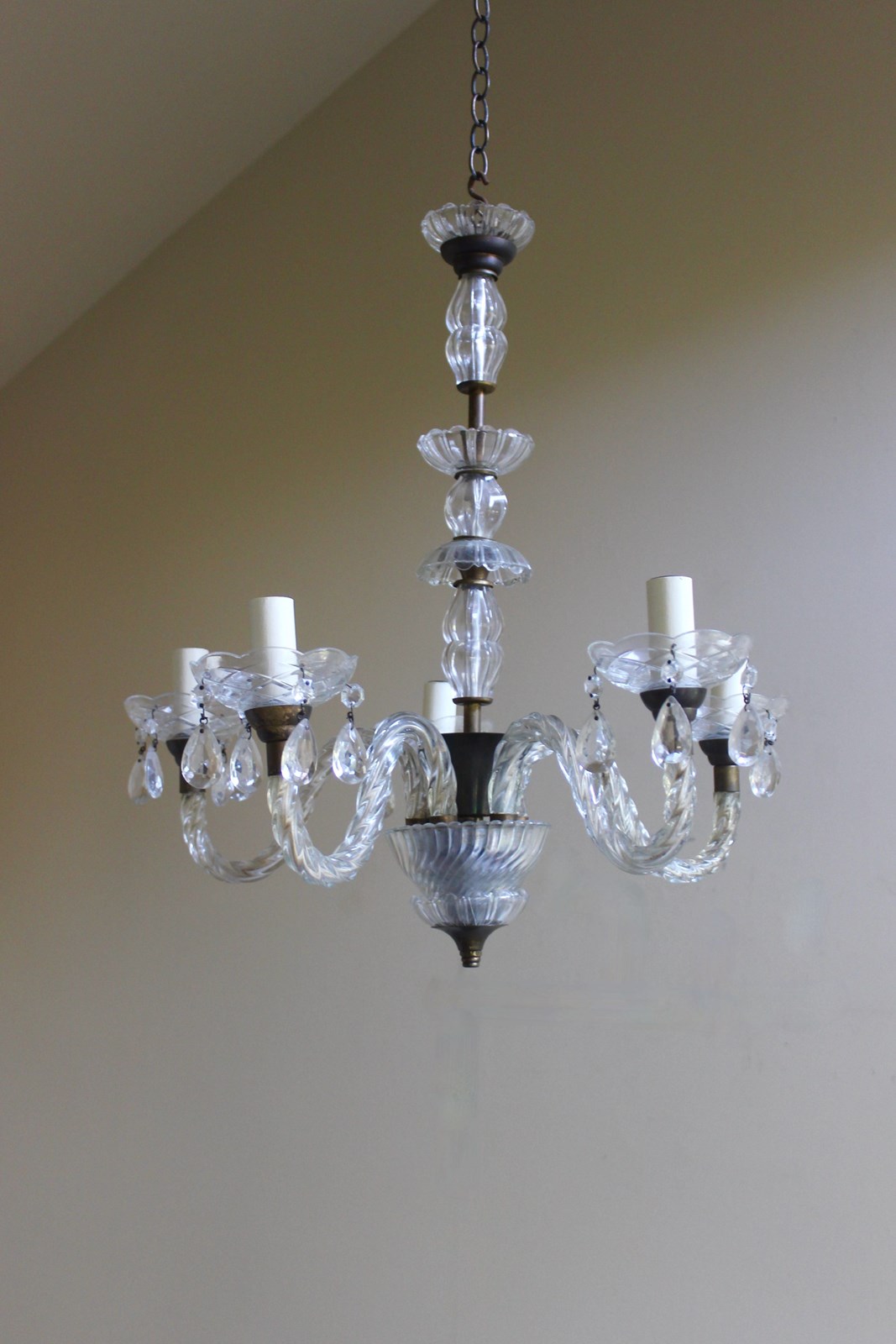 Pretty smaller proportioned 5 arm Italian pleated glass chandelier with twisted glass arms and cut glass candle drips - perfect for a dressing room, cloakroom or cottage. Lovely glass and brass metal work with mellow patina